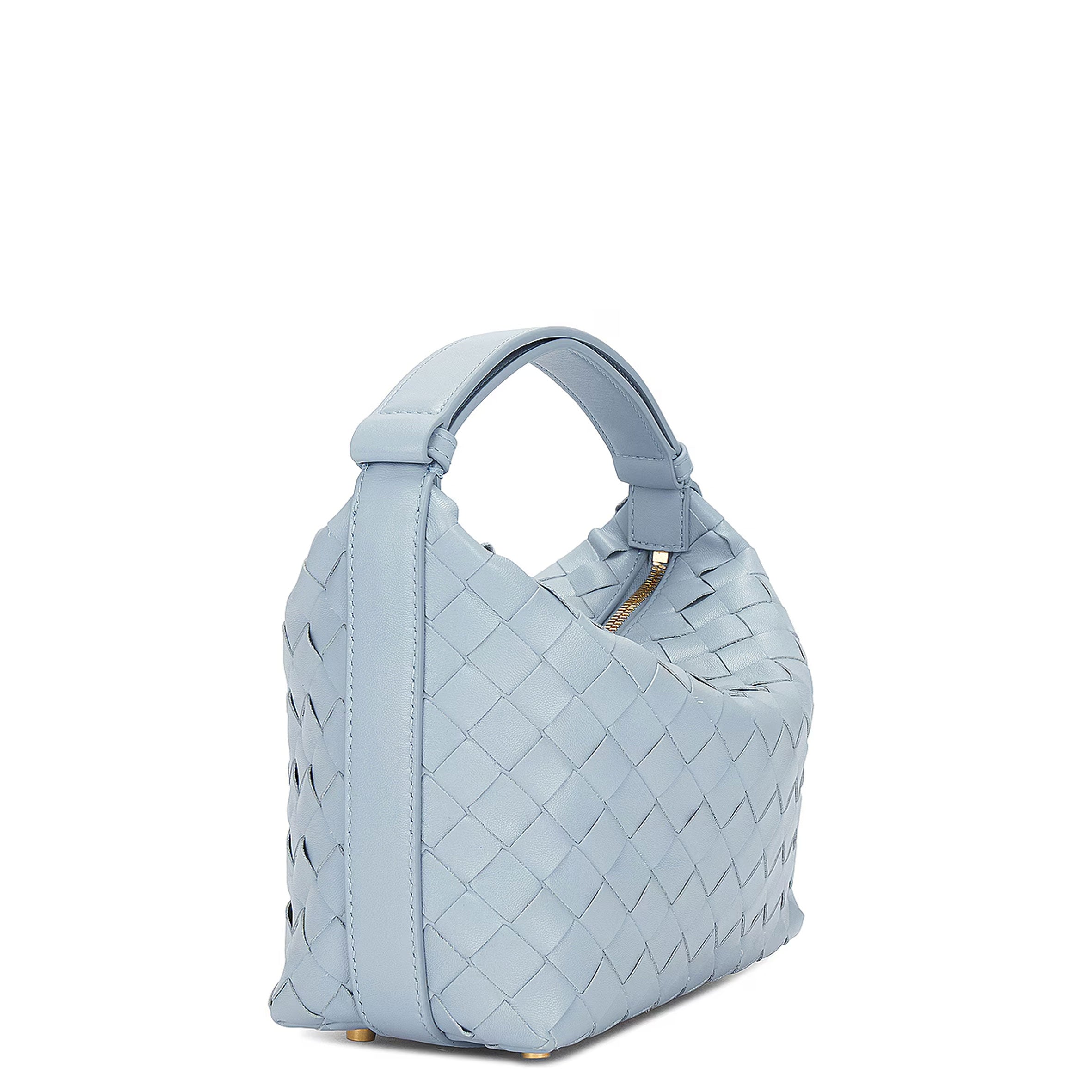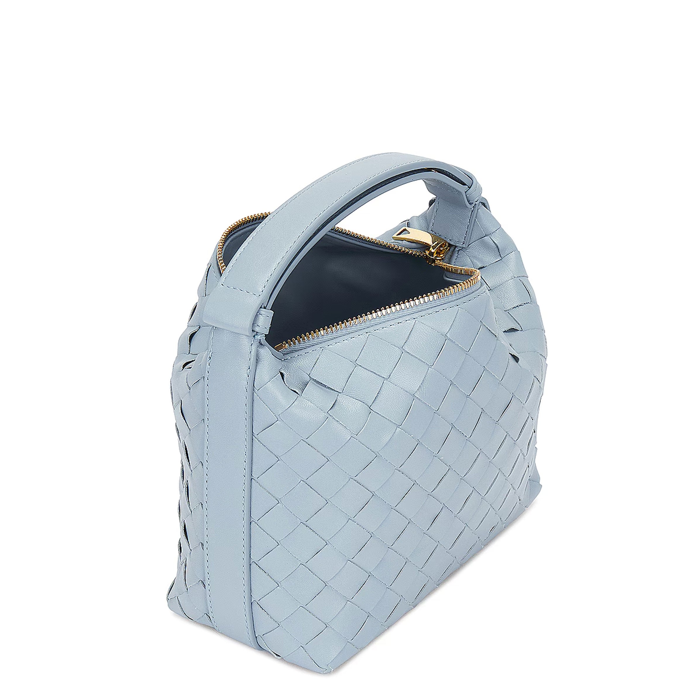Shoulder bag realised with Intrecciato craftsmanship in soft calfskin leather. Leather shoulder strap features an adjustable press stud.