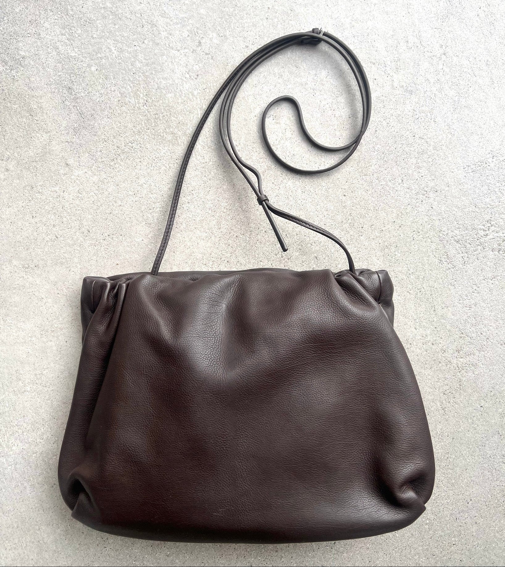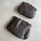 Ruched clutch in finely grained calfskin leather with hidden adjustable shoulder strap and hinged frame closure. Characterized by a buttery-soft hand and subtle sheen, the leather offers a supple texture and refined finish. The is the large size, shown in photo next the smaller classic bourse , both which feature a long adjustable leather strap.