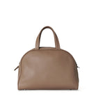 Bowling bag in finely grained calfskin leather with softly rounded shape, zipper closure, and removable shoulder strap.