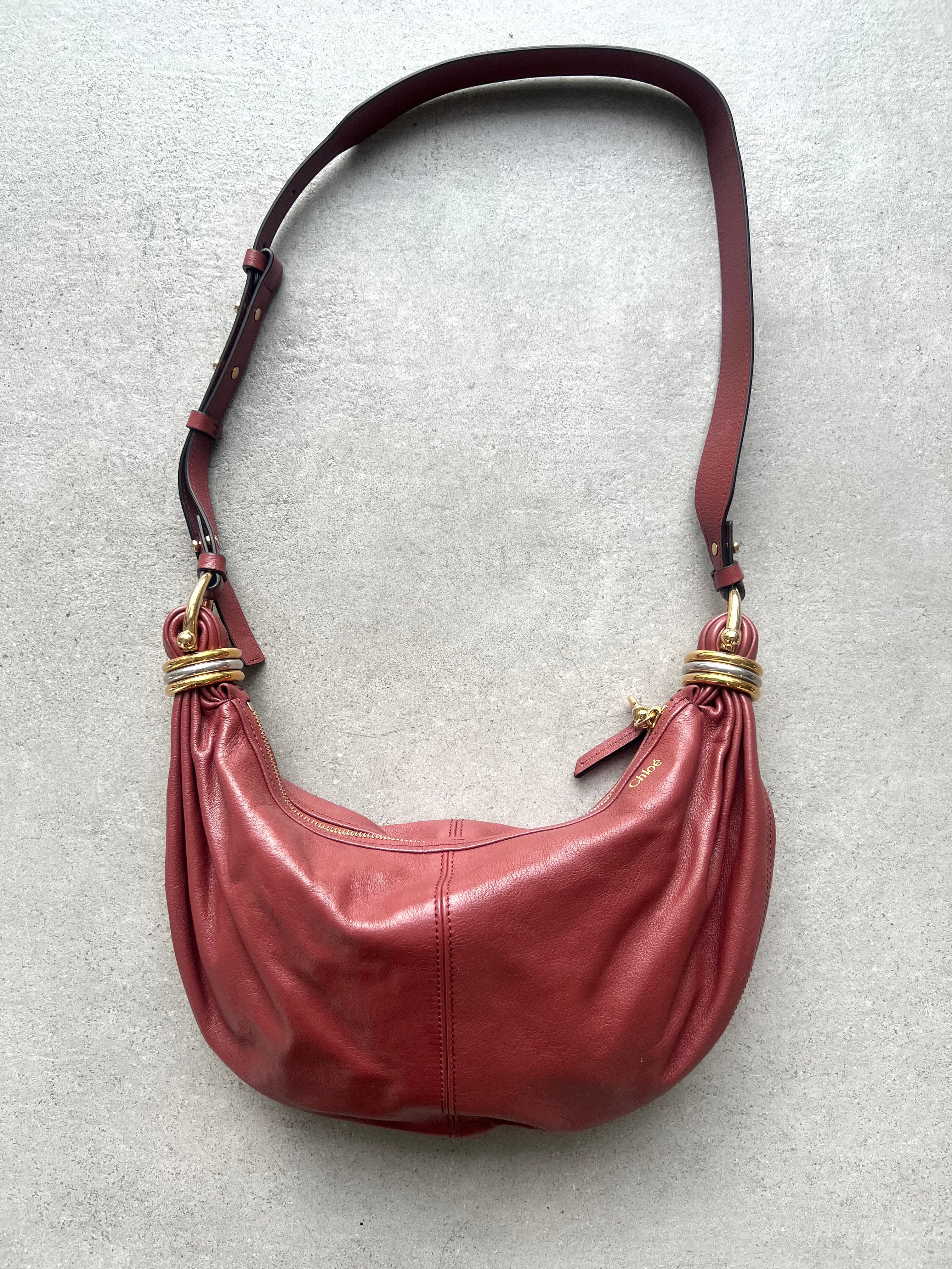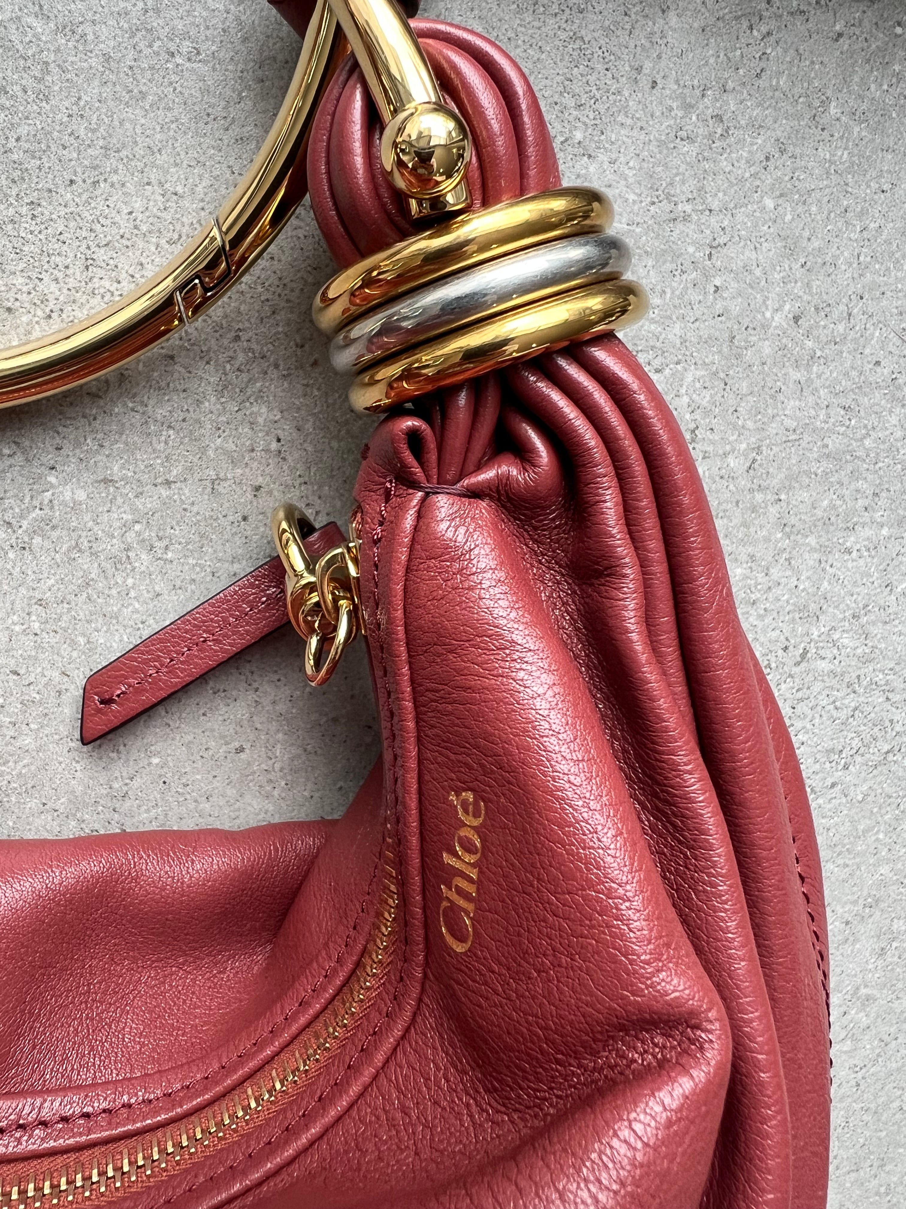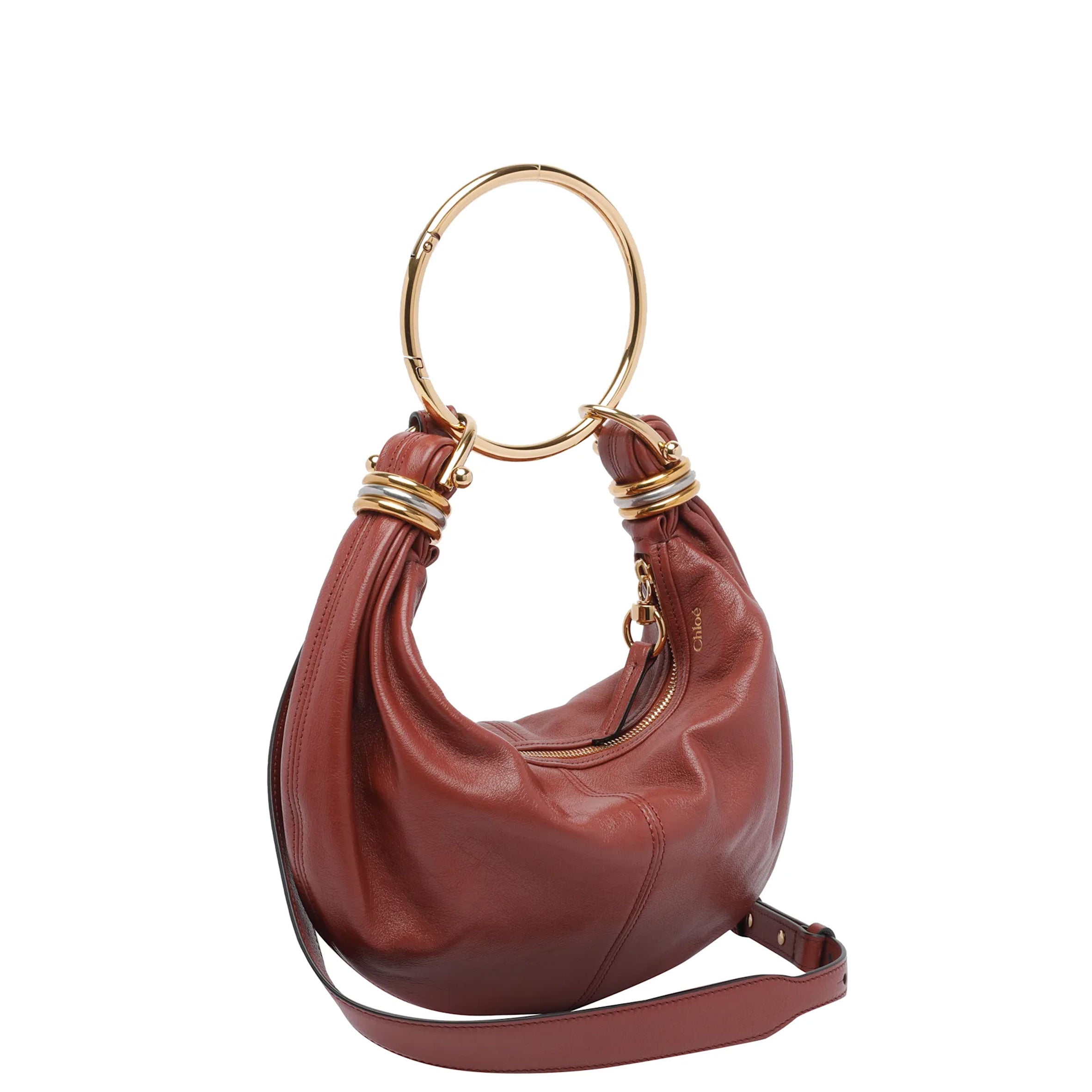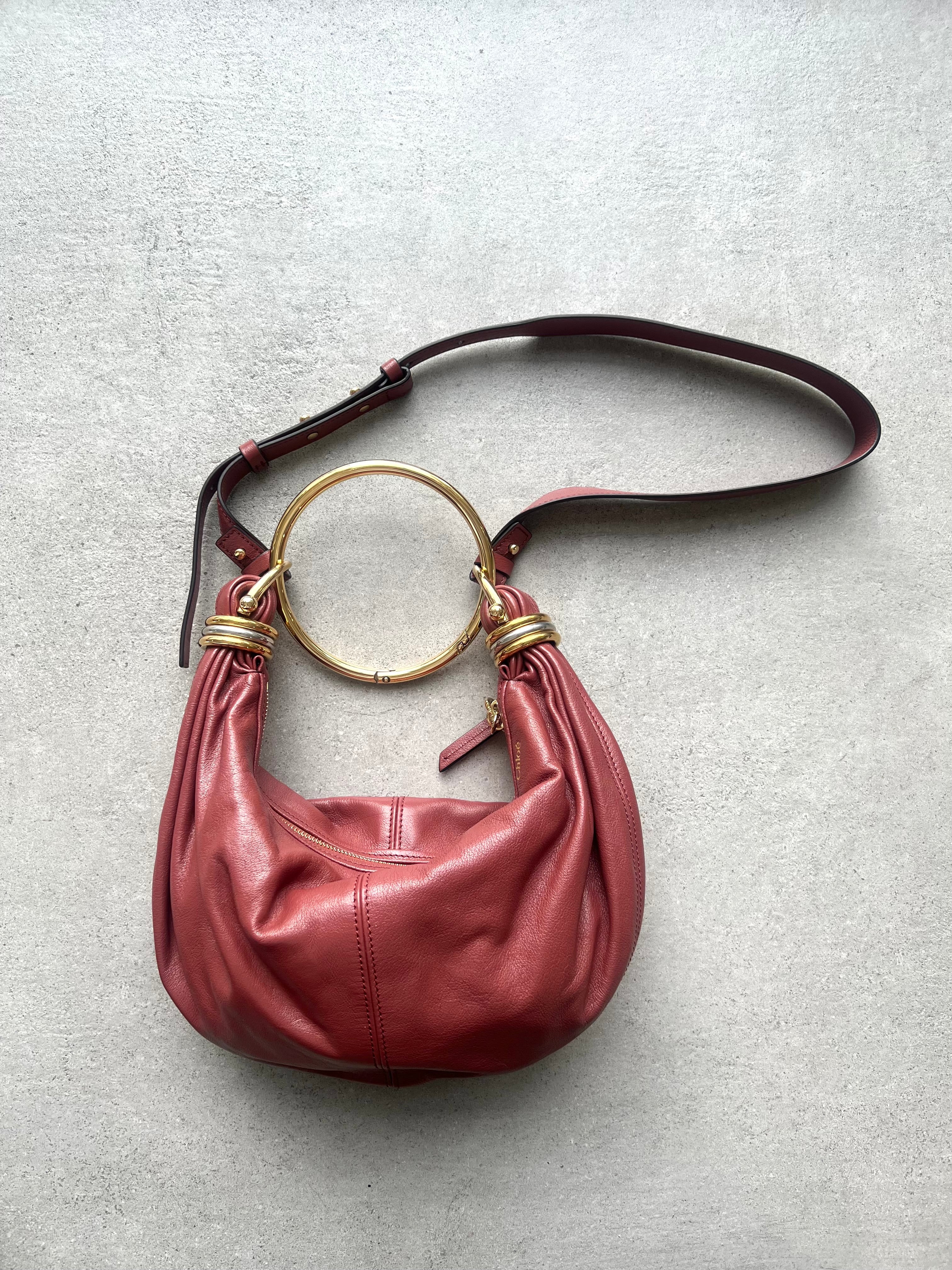 Inspired by the Maison's Archives, this small Bracelet Hobo bag is crafted from shiny grained calfskin. The supple, rounded shape is elevated by a bracelet handle and stacked two-toned rings at the ends.