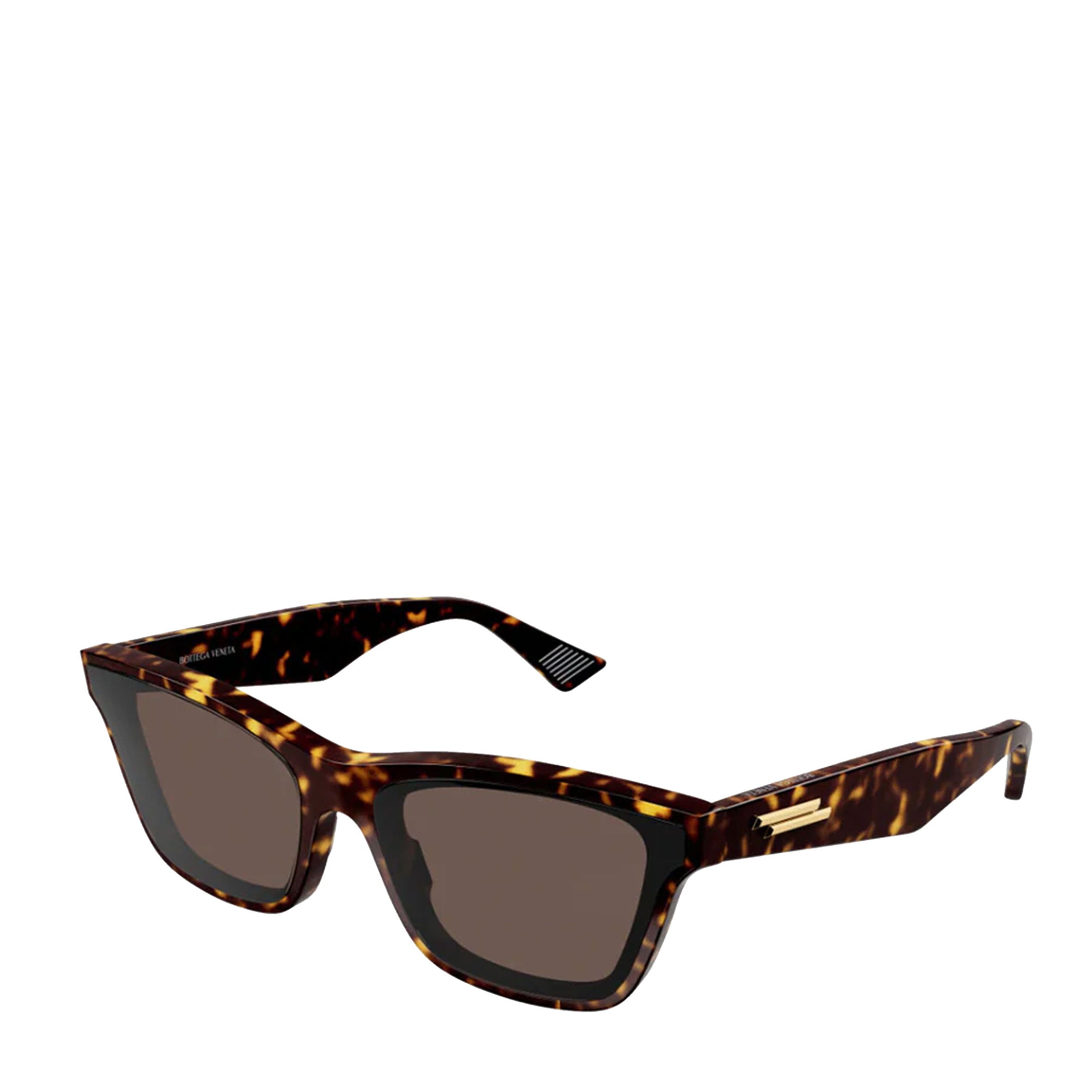 Bottega Veneta BV1119S sunglasses blend a timeless cat-eye shape with the house’s contemporary spirit. Crafted in a luminous Havana acetate, this frame a flattering curved construction, with extended and flush styled warm brown lenses. Wide arms accentuate a luxury feel while a modernized logo, reimagined as two gold bars on the temples, renders a statement finish.