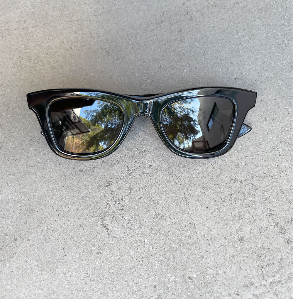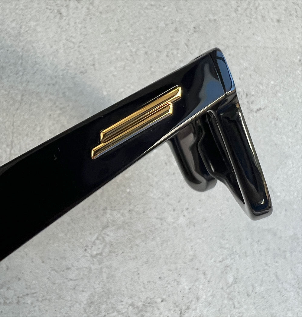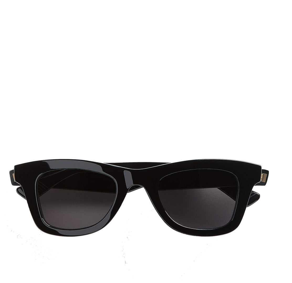 Bottega Veneta BV1147S sunglasses feature thick black rims in a modern square shape with grey lenses. Angular arms feature the brands reimagined logo along the temple.