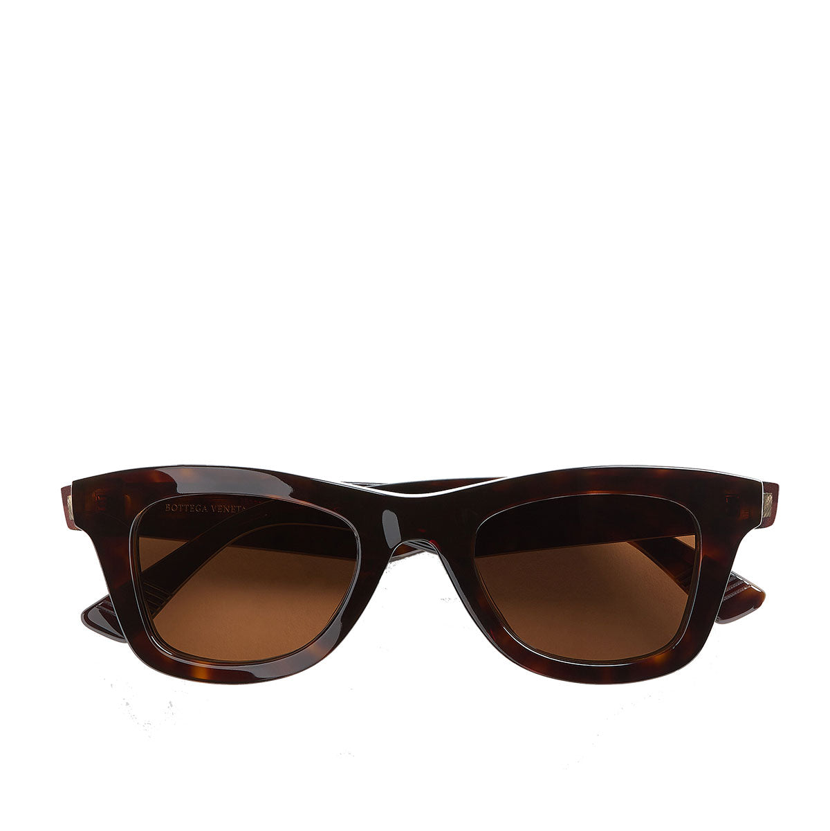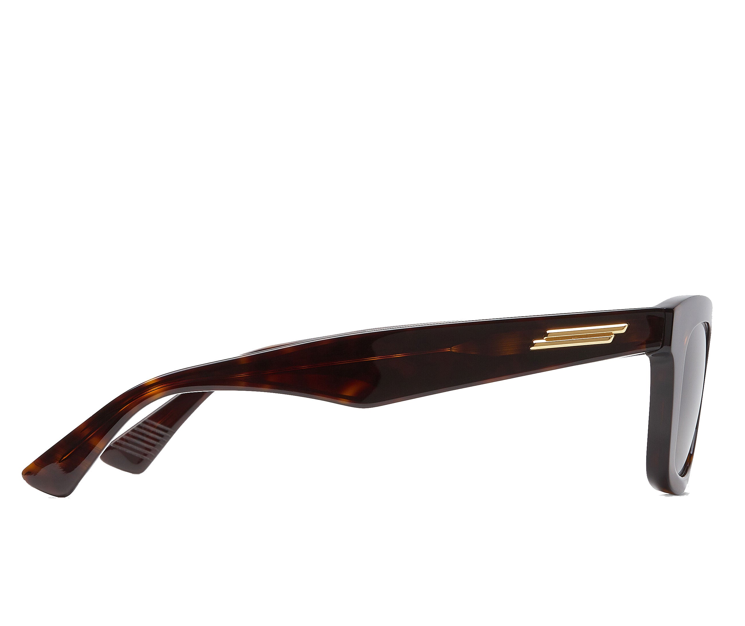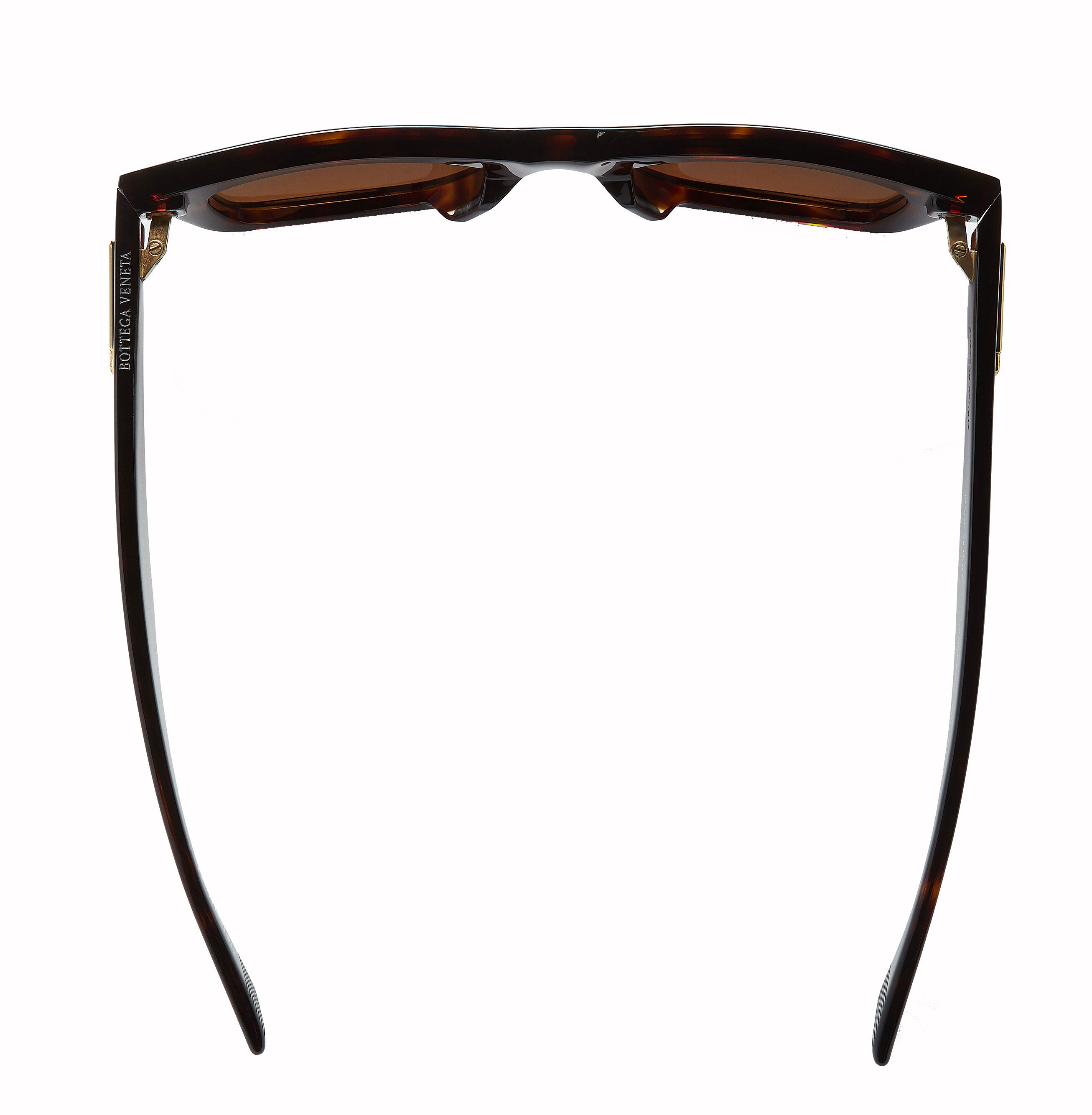 Bottega Veneta BV1147S sunglasses feature thick havana rims in a modern square shape with brown lenses. Angular arms feature the brands reimagined logo along the temple.