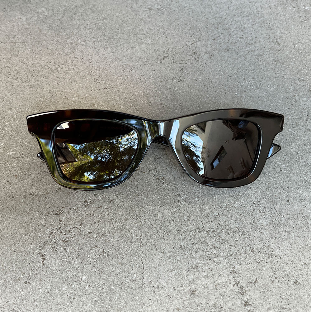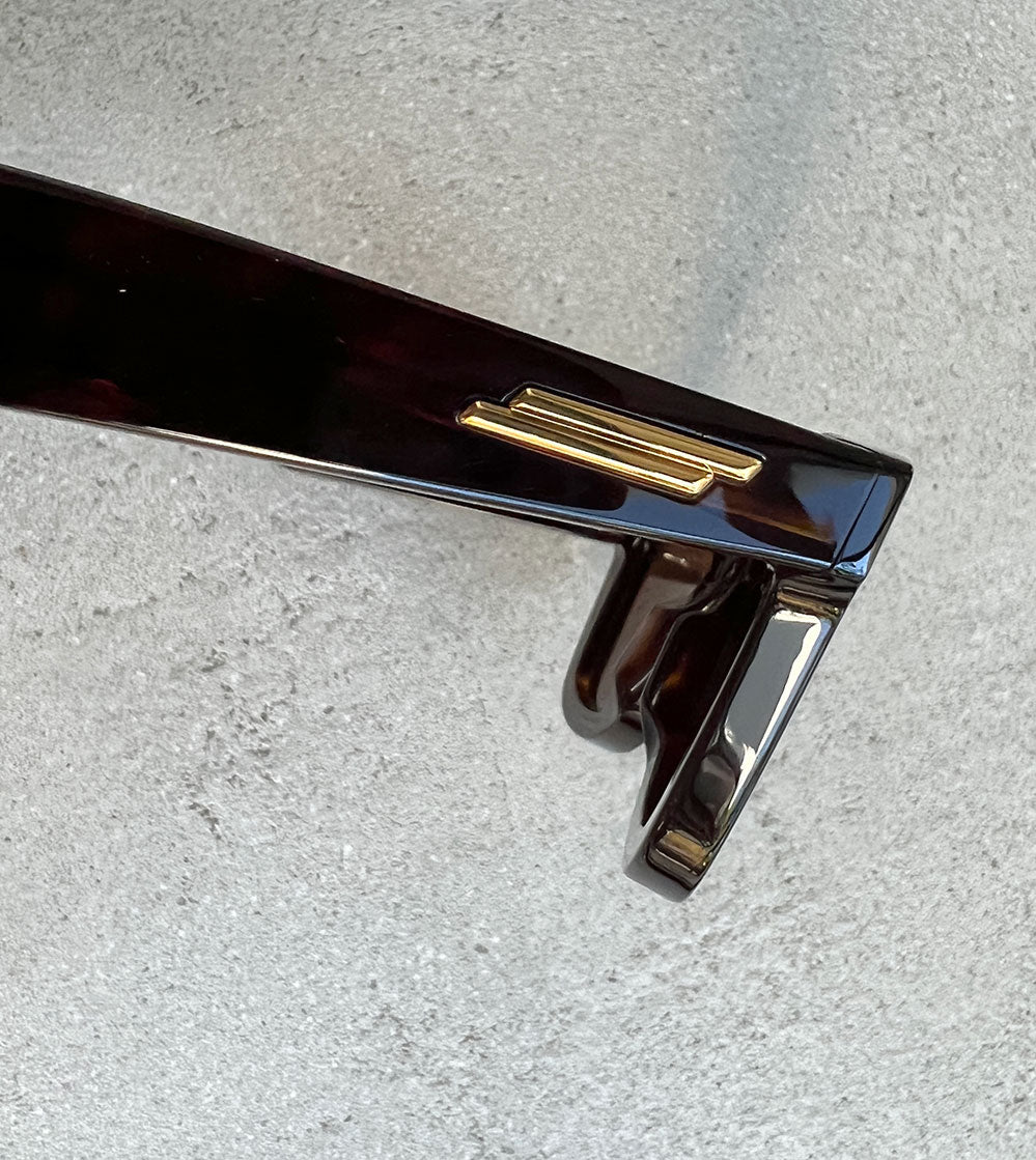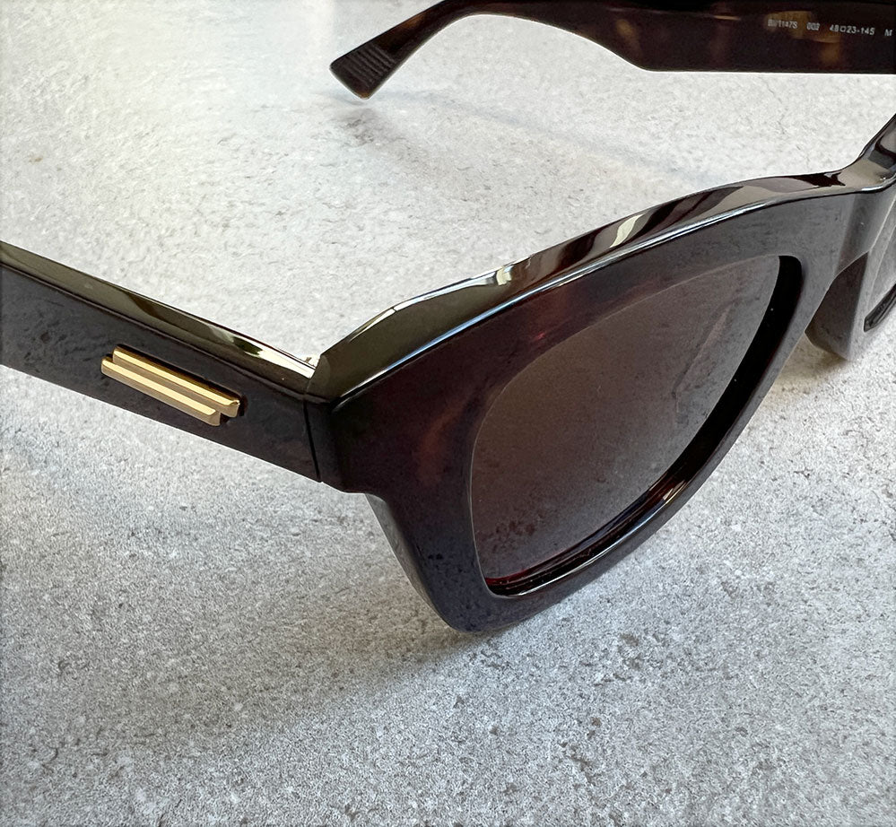 Bottega Veneta BV1147S sunglasses feature thick havana rims in a modern square shape with brown lenses. Angular arms feature the brands reimagined logo along the temple.