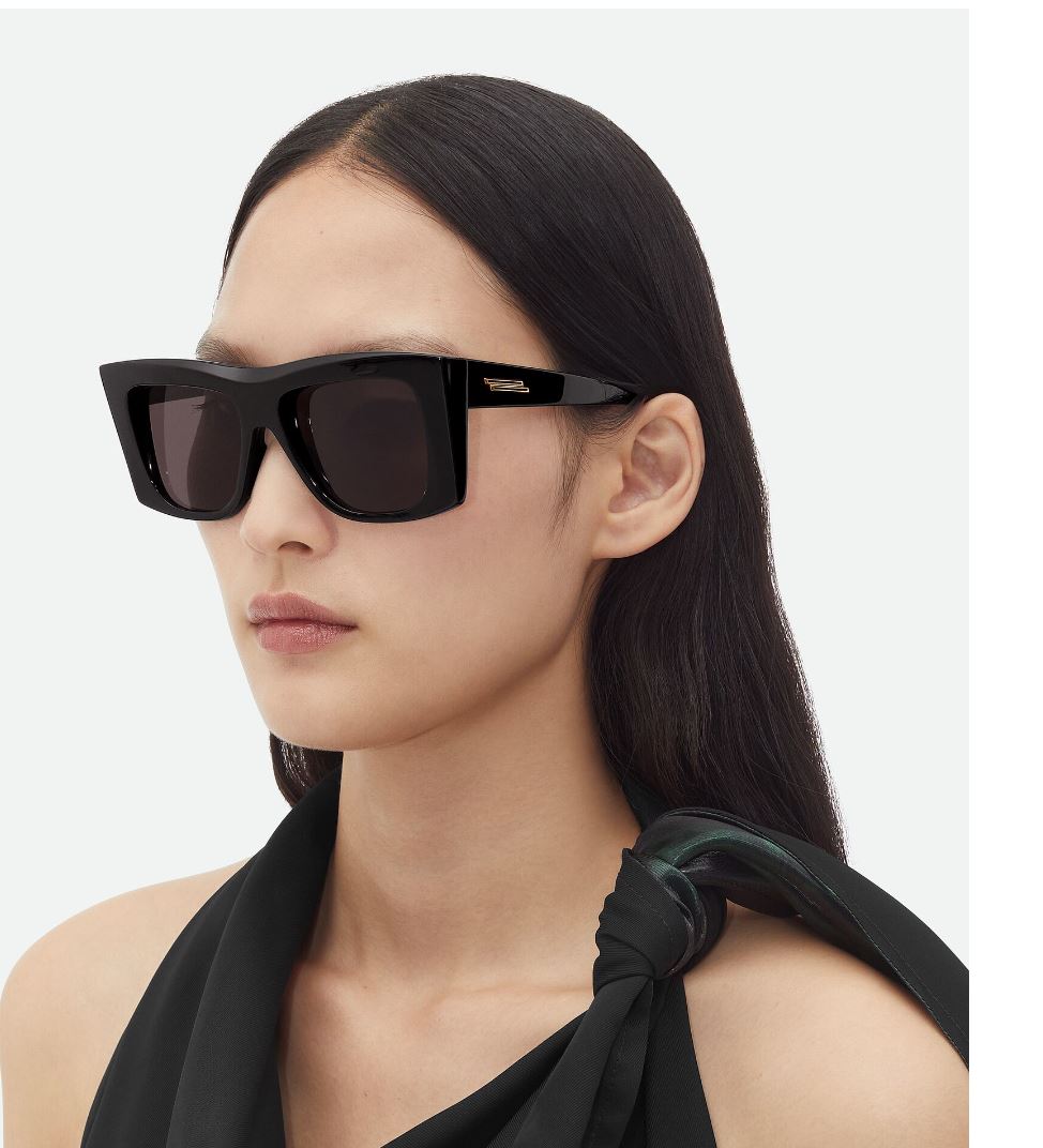 Full acetate oversize square shape. Thick front in the upper part which blends into a thinner bottom, creating the iconic triangular shape on the profile. Iconic metal fringed ribbon on the temples.