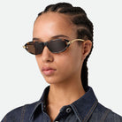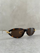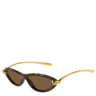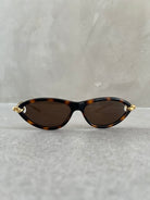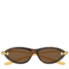 Bottega Veneta BV1390S featuring shiny sprayed medium havana cat eye injection frame and solid brown bio nylon lenses. Finished with metallic knot details.