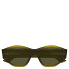 Bottega Veneta BV1408S 003 sunglasses for women, featuring shiny transparent bilayer green / yellow geometric recycled acetate frame and solid green bio nylon lenses.