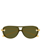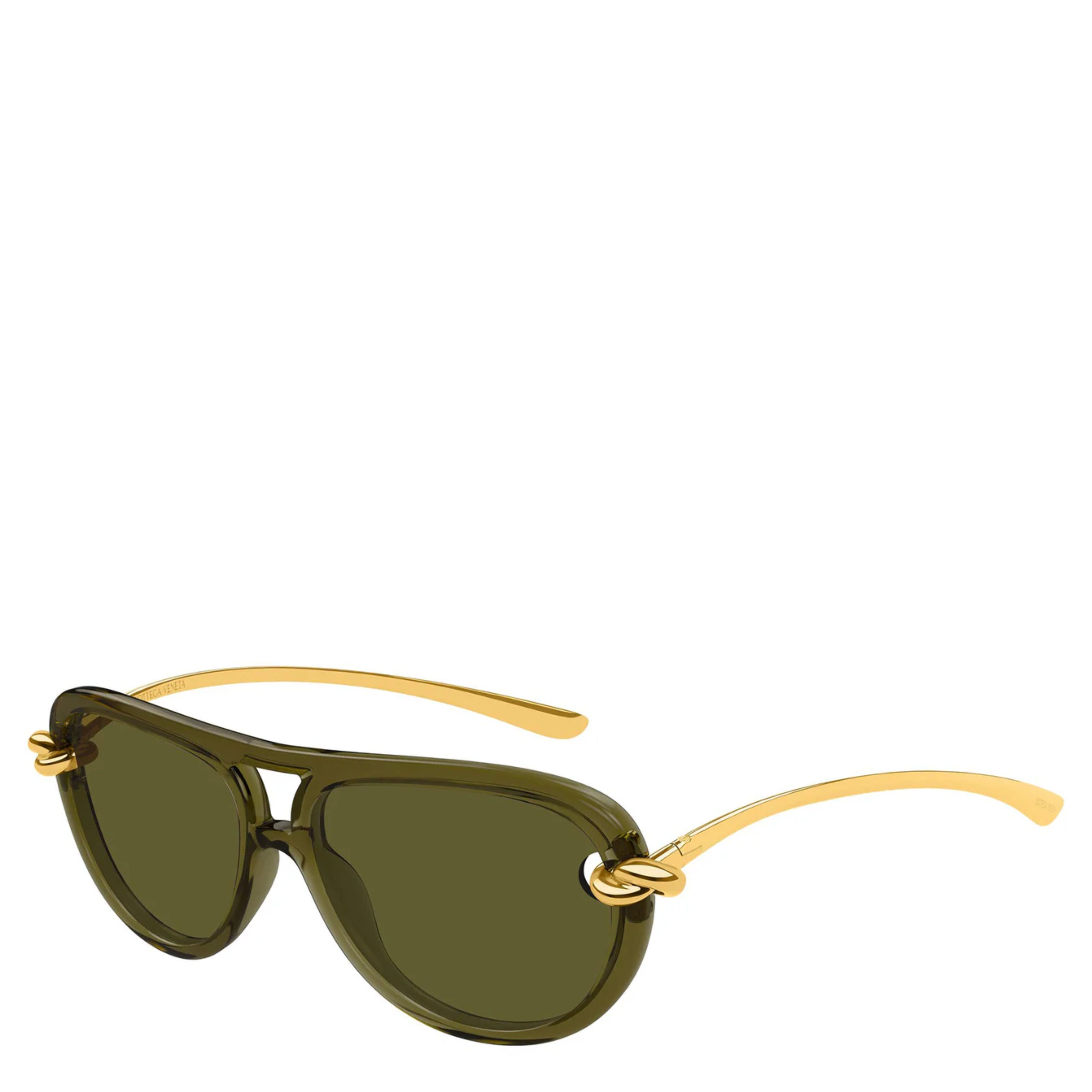 Bottega Veneta BV1418S 003 sunglasses for women, featuring shiny transparent green pilot injection frame and solid green bio nylon lenses. Finished with metallic knot details.