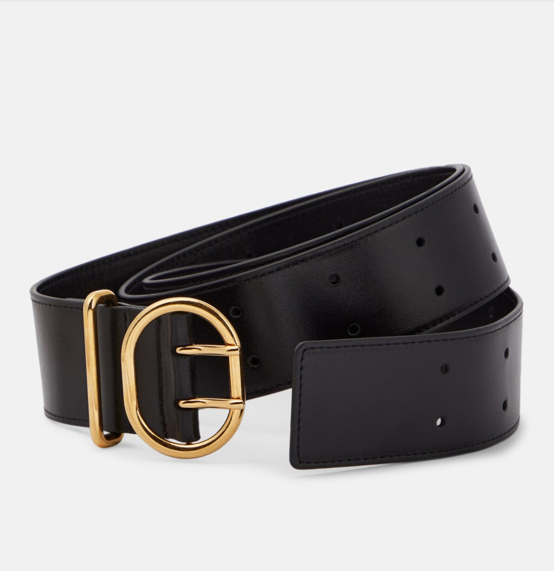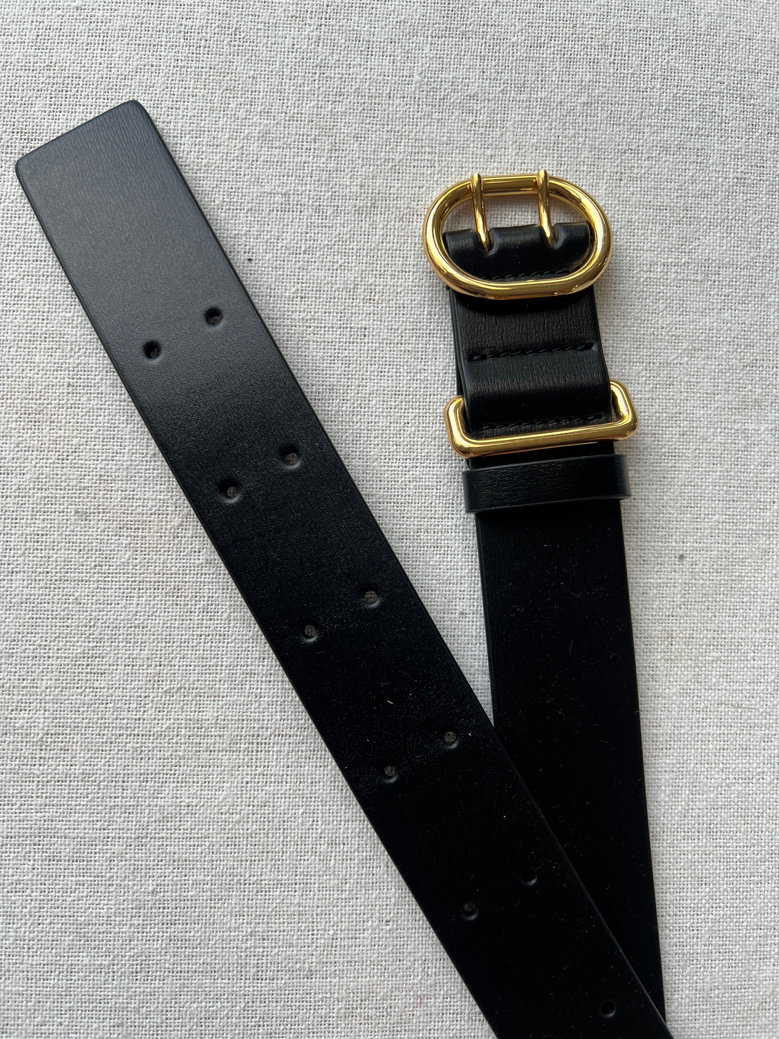 Leather belt with Cannolo buckle. The Cannolo belt is crafted from black leather and features a double-tongued buckle and numerous punched holes for a perfect fit.