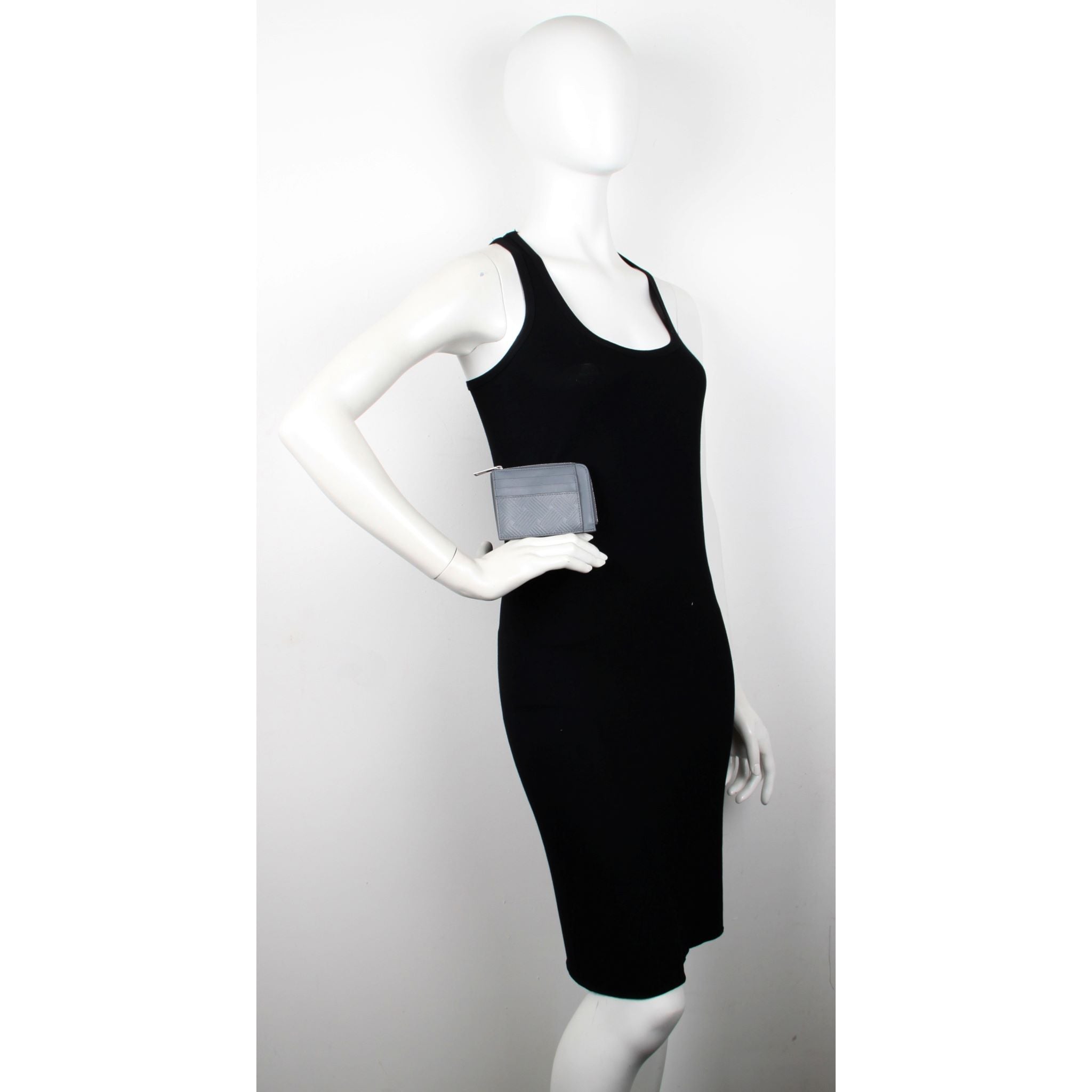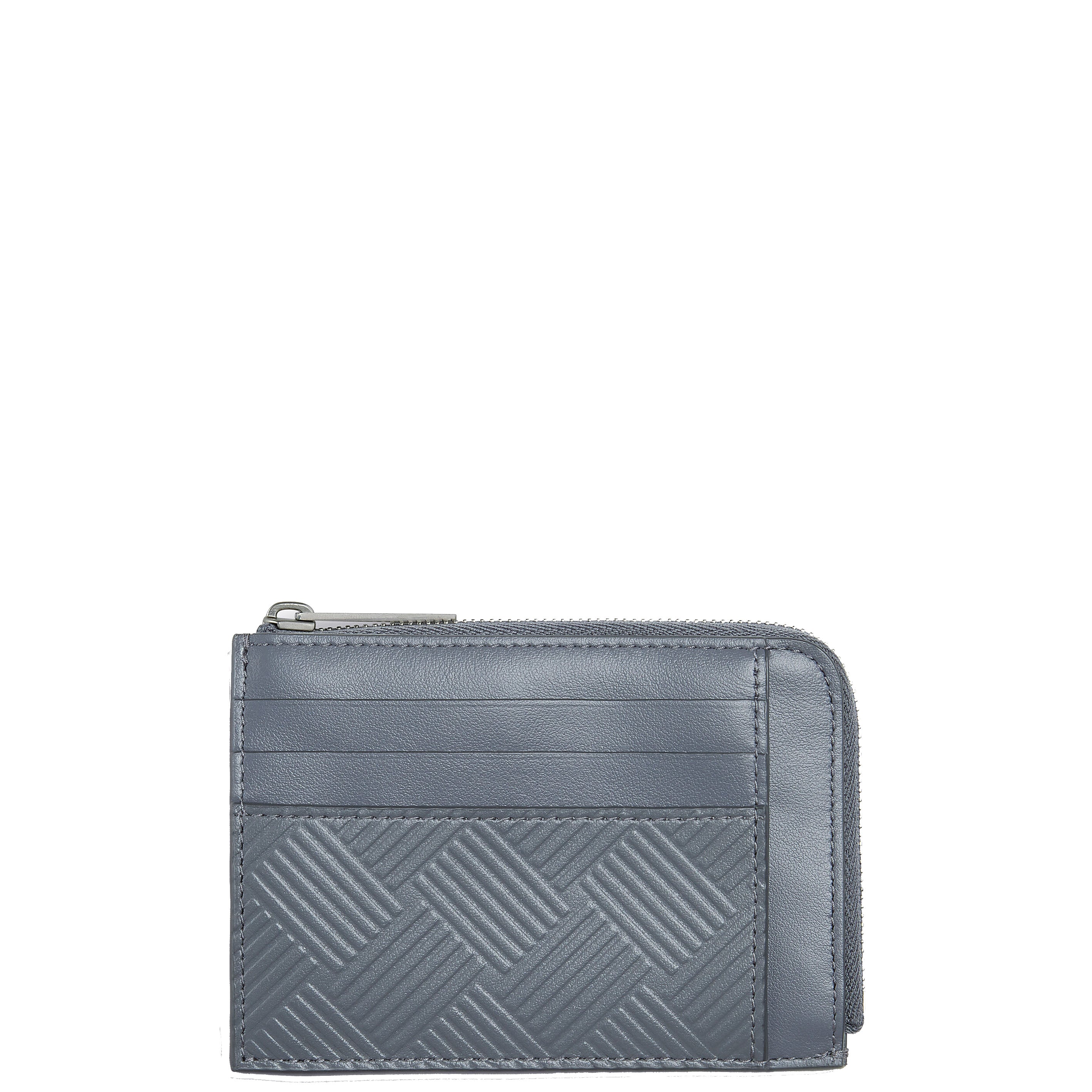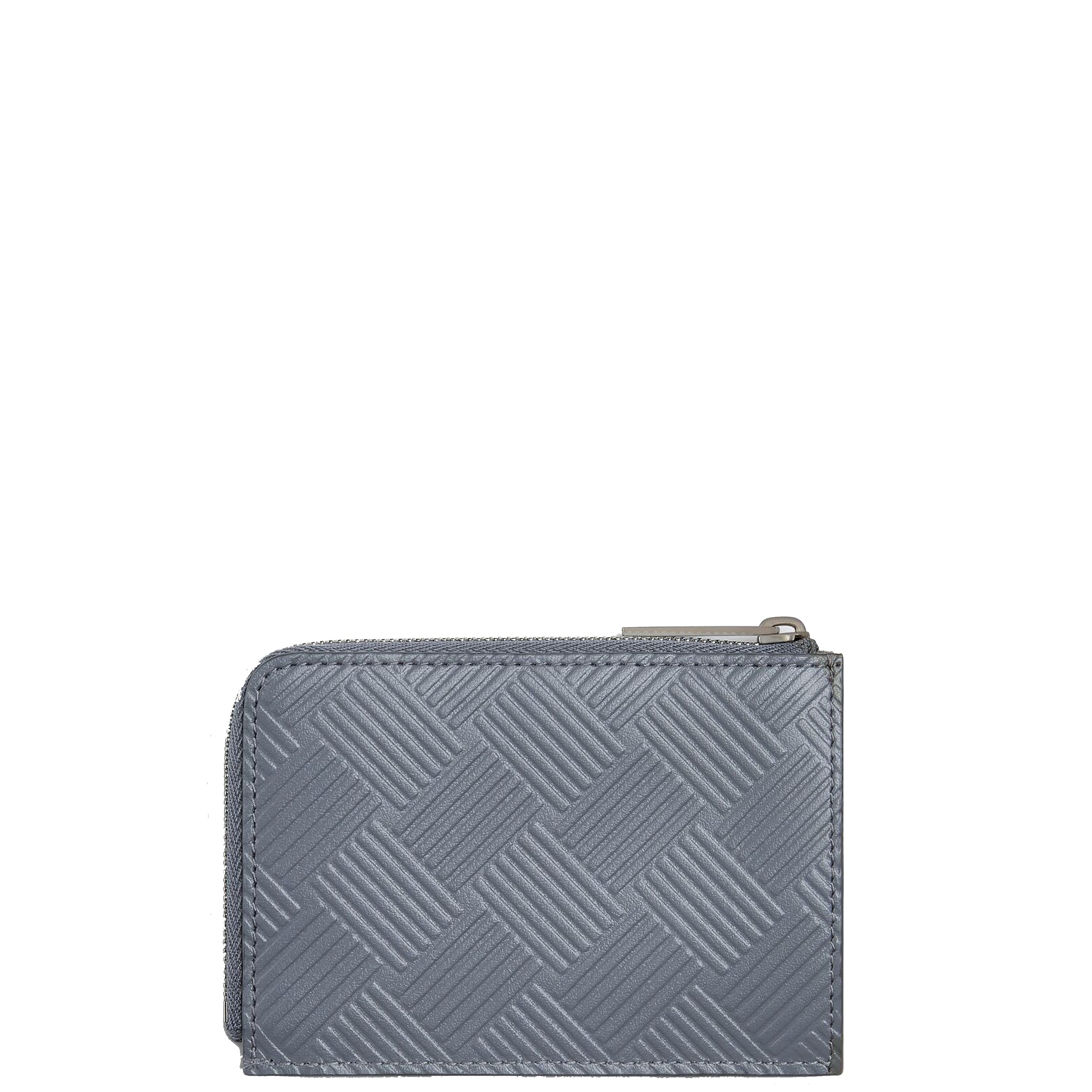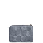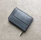 Grained calfskin card holder in black featuring embossed graphic pattern. Three card slots at back face. Zip closure. Expansion panels and logo embossed at interior. Tonal grained calfskin lining. Silver-tone hardware.