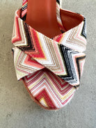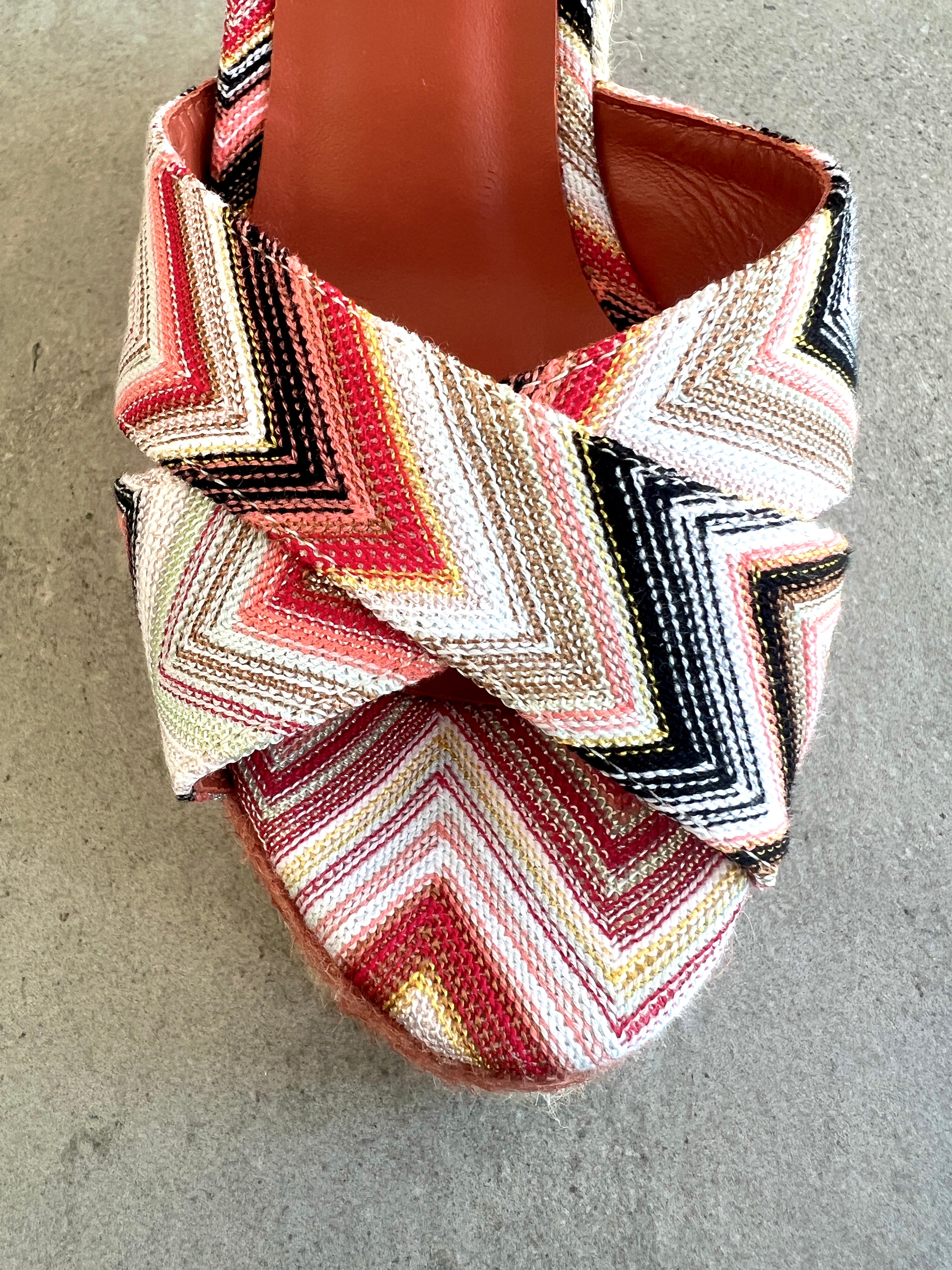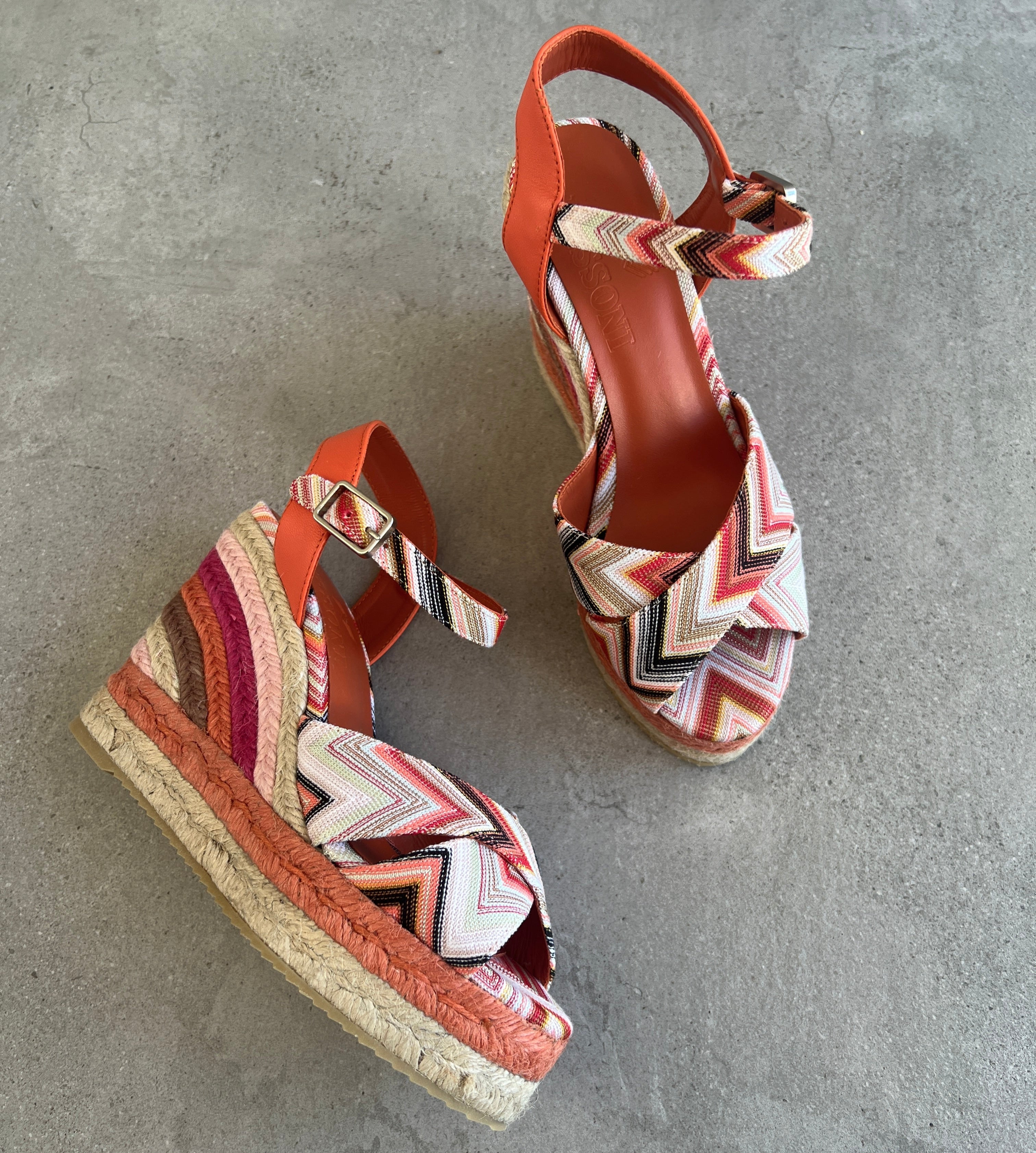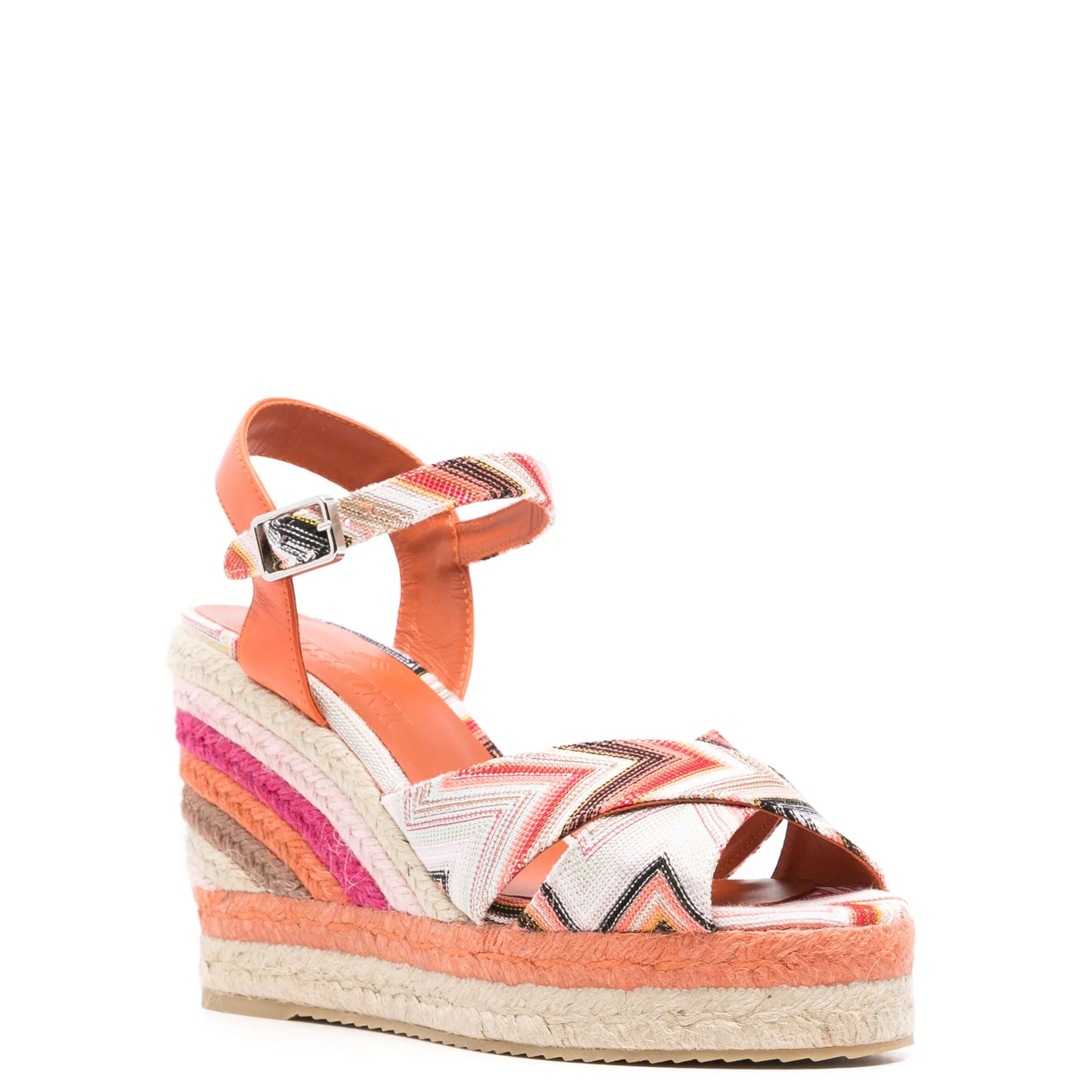 The Carmen woven espadrilles featuring a 110mm wedge heel with buckle fastening. Fabric features Missoni's iconic zigzag motif.
