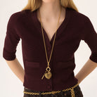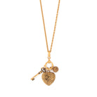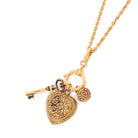 Château Treasures pendant necklace in vintage gold brass featuring three charms set on a central ring: an ornamental heart and sphere, along with a key. Chloé logo engravings and a gold-toned Chloé logo plate sign the chain.