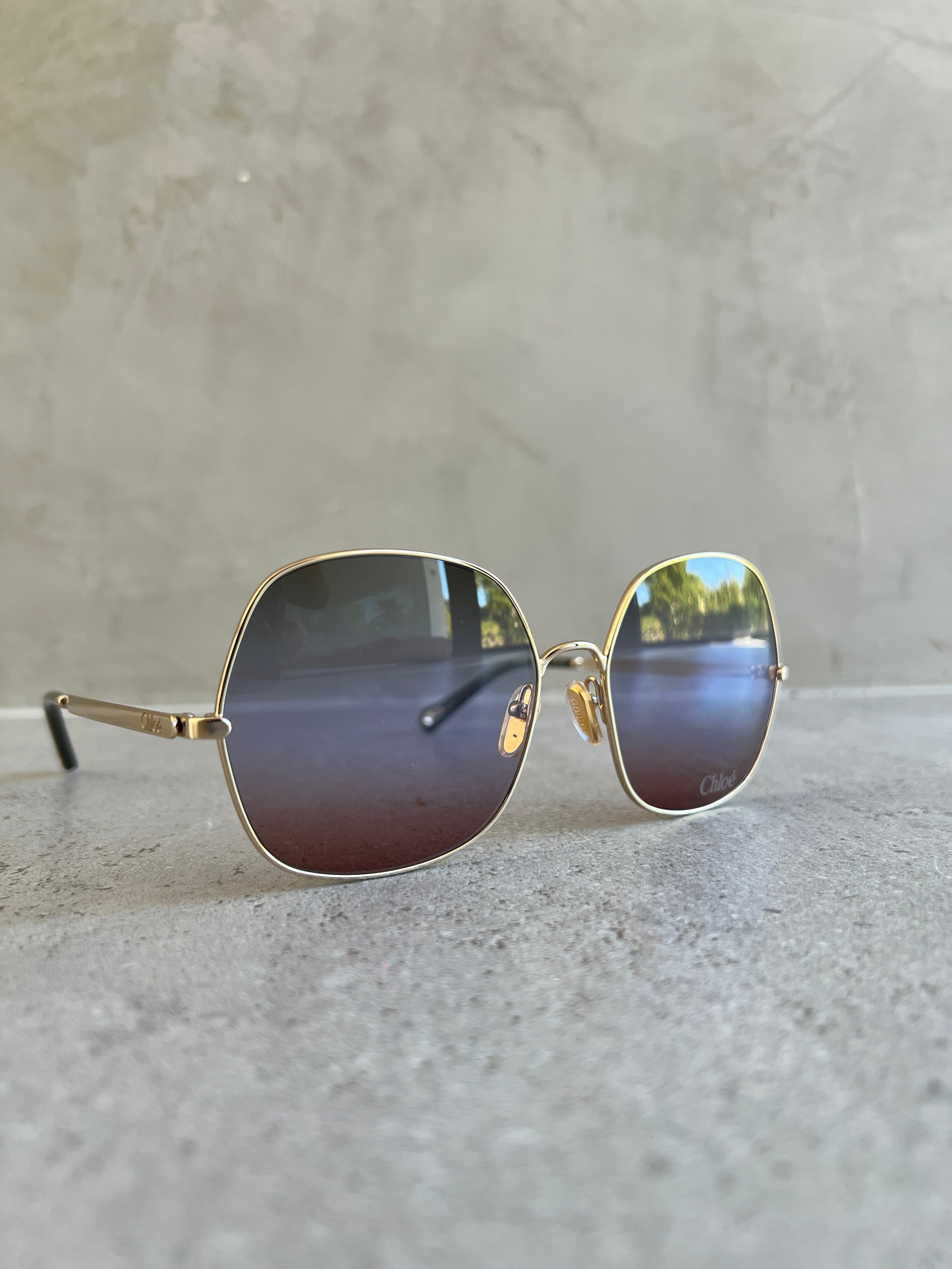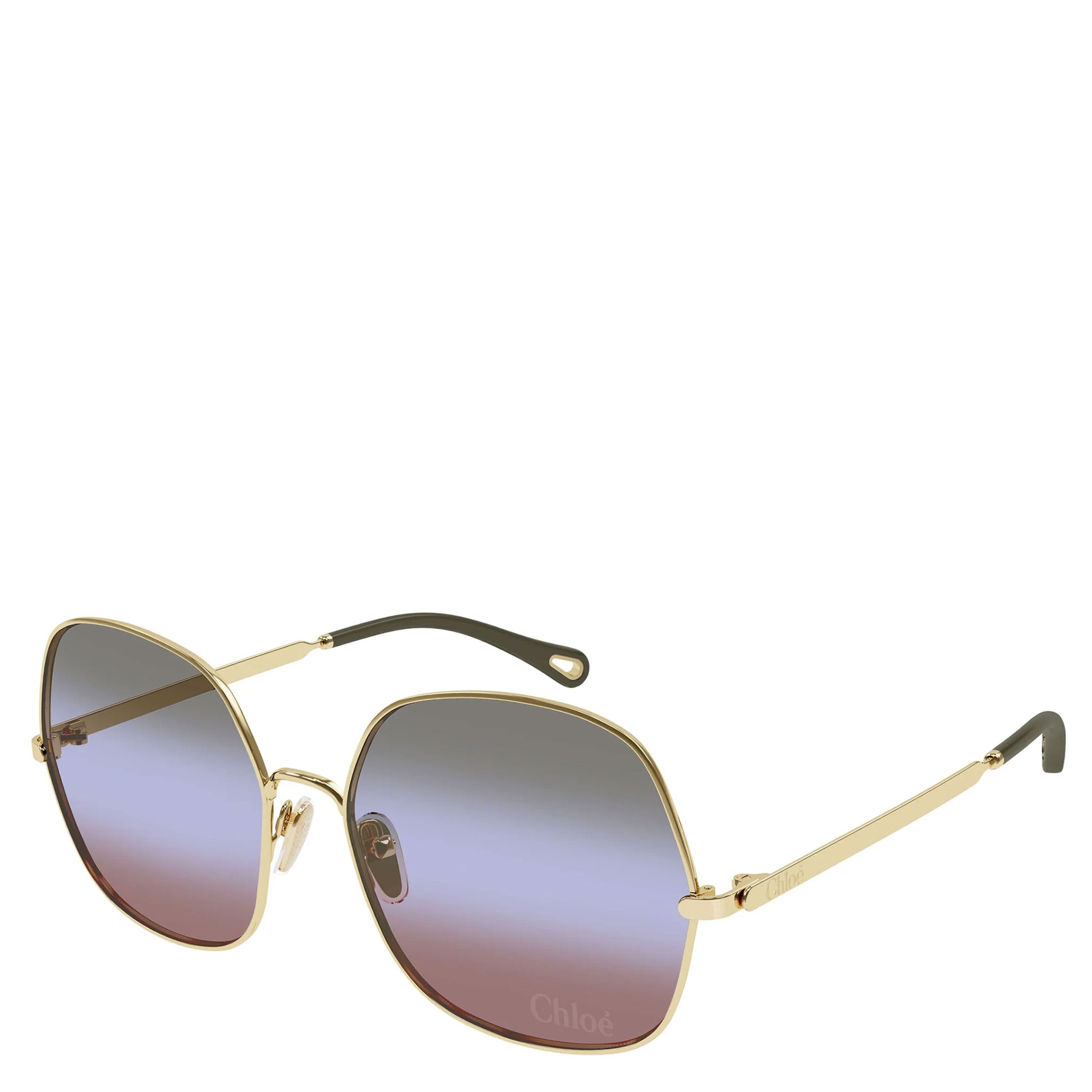 These Aly square sunglasses pair a lightweight graphic frame in shiny gold-tone metal with triple gradient lenses in a palette of green, blue and rust. The Chloé logo finishes the left lens.