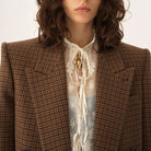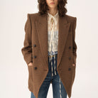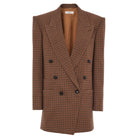 Tailored double-breasted jacket in lower-impact houndstooth wool with shiny leather buttons and piped patch pockets.