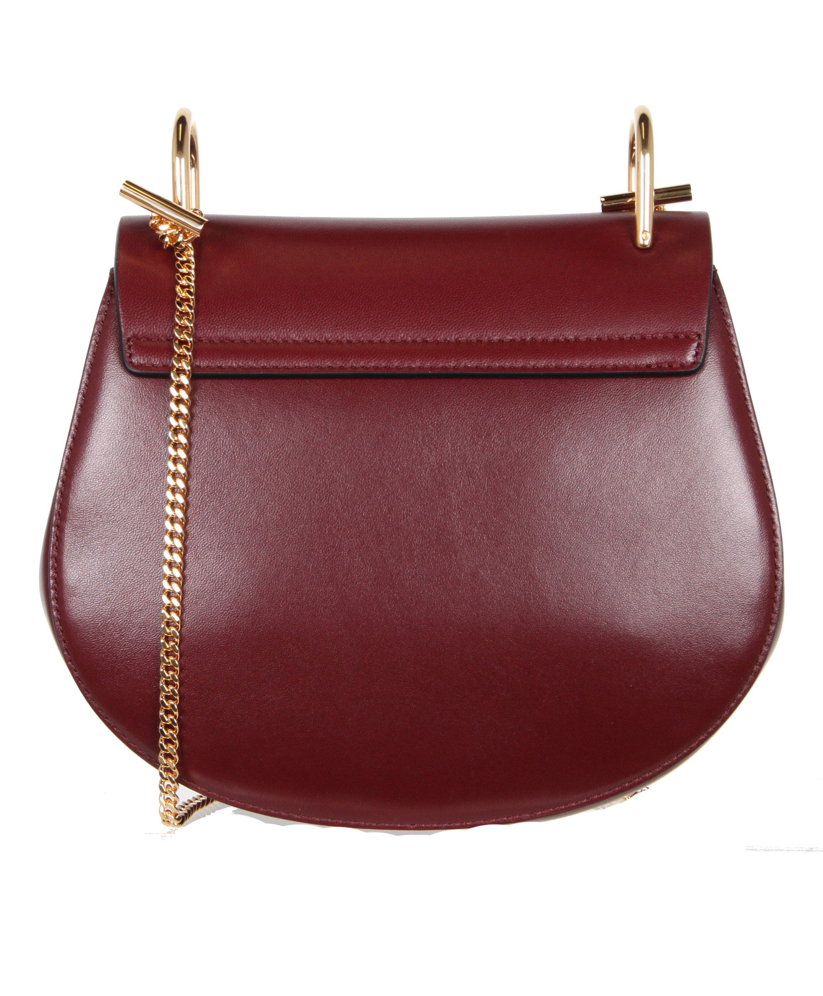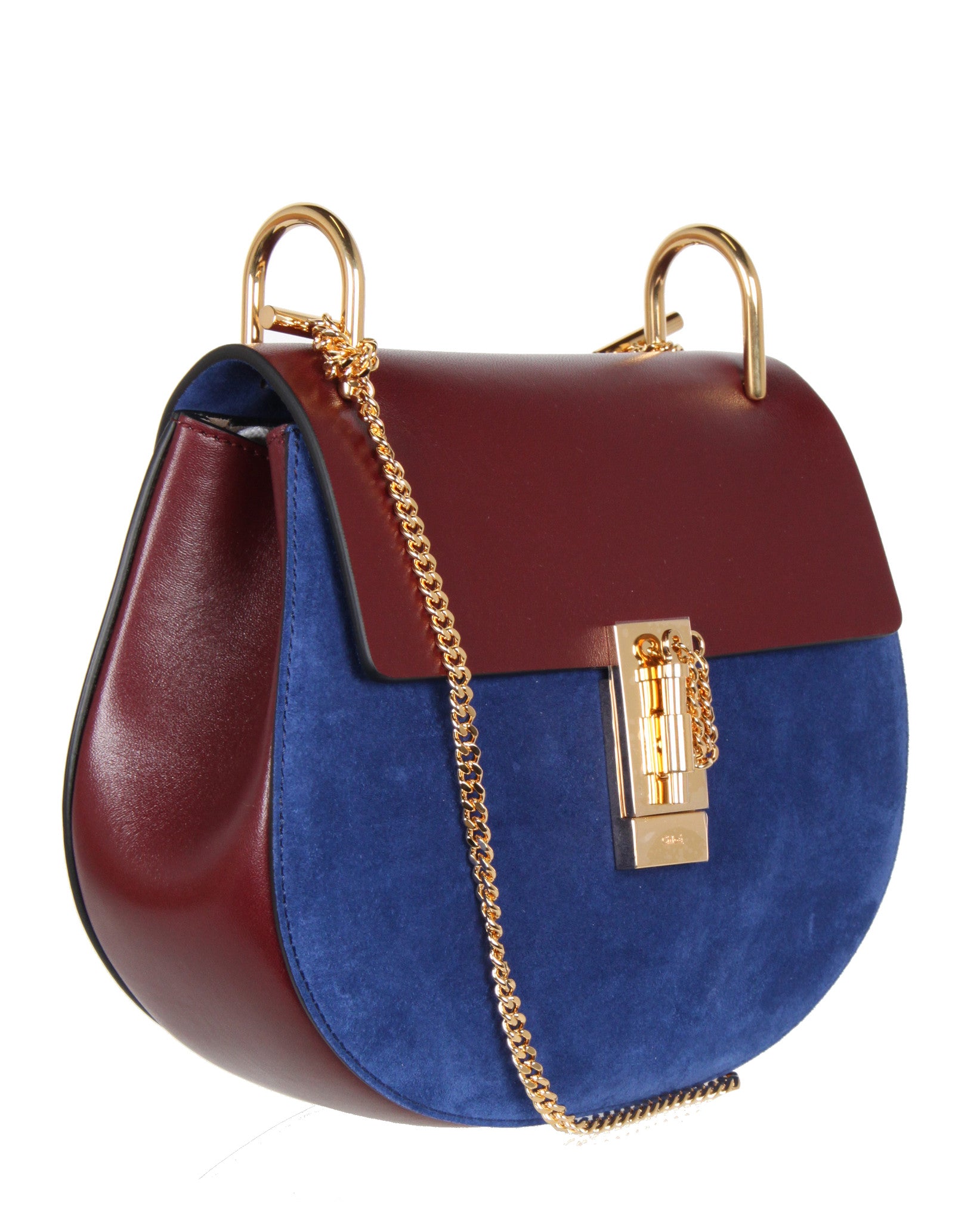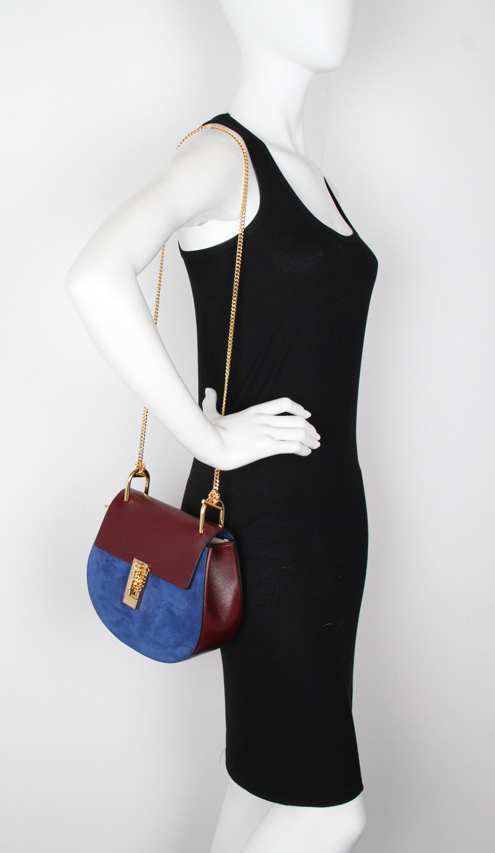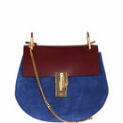 The "Drew" in calfskin has a rounded silhouette and polished hardware. Detailed with squared leather flap, suede body, sleek gold chain shoulder strap, the brand's signature pin and magnetic clasp fastening. The interior is fully suede lined and includes a pouch pocket.