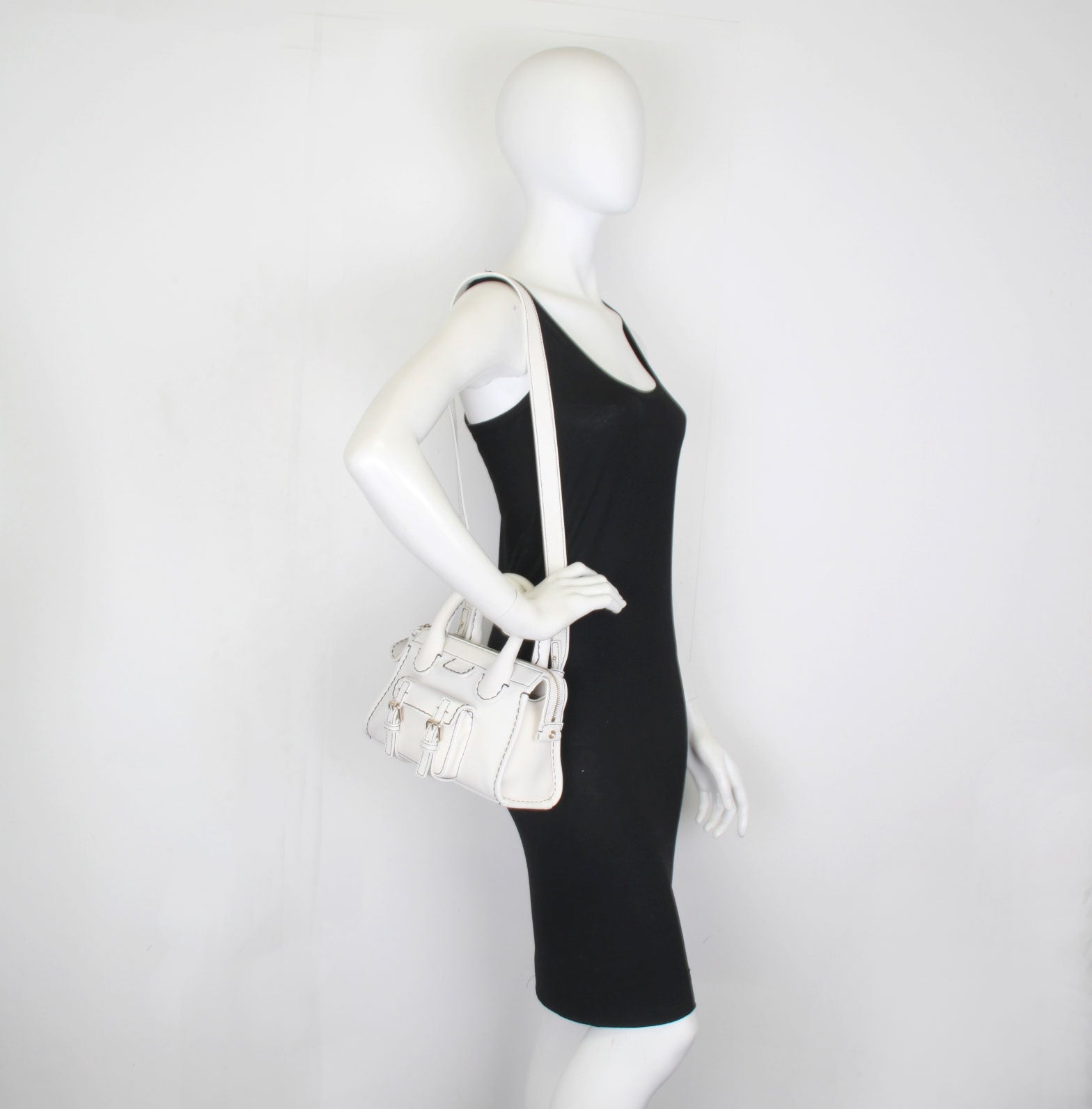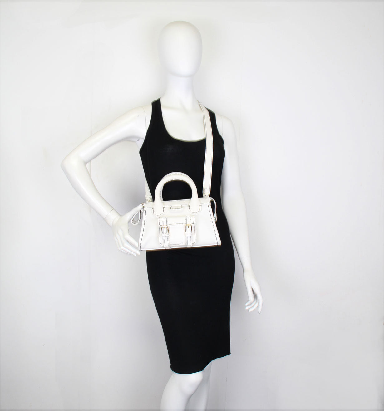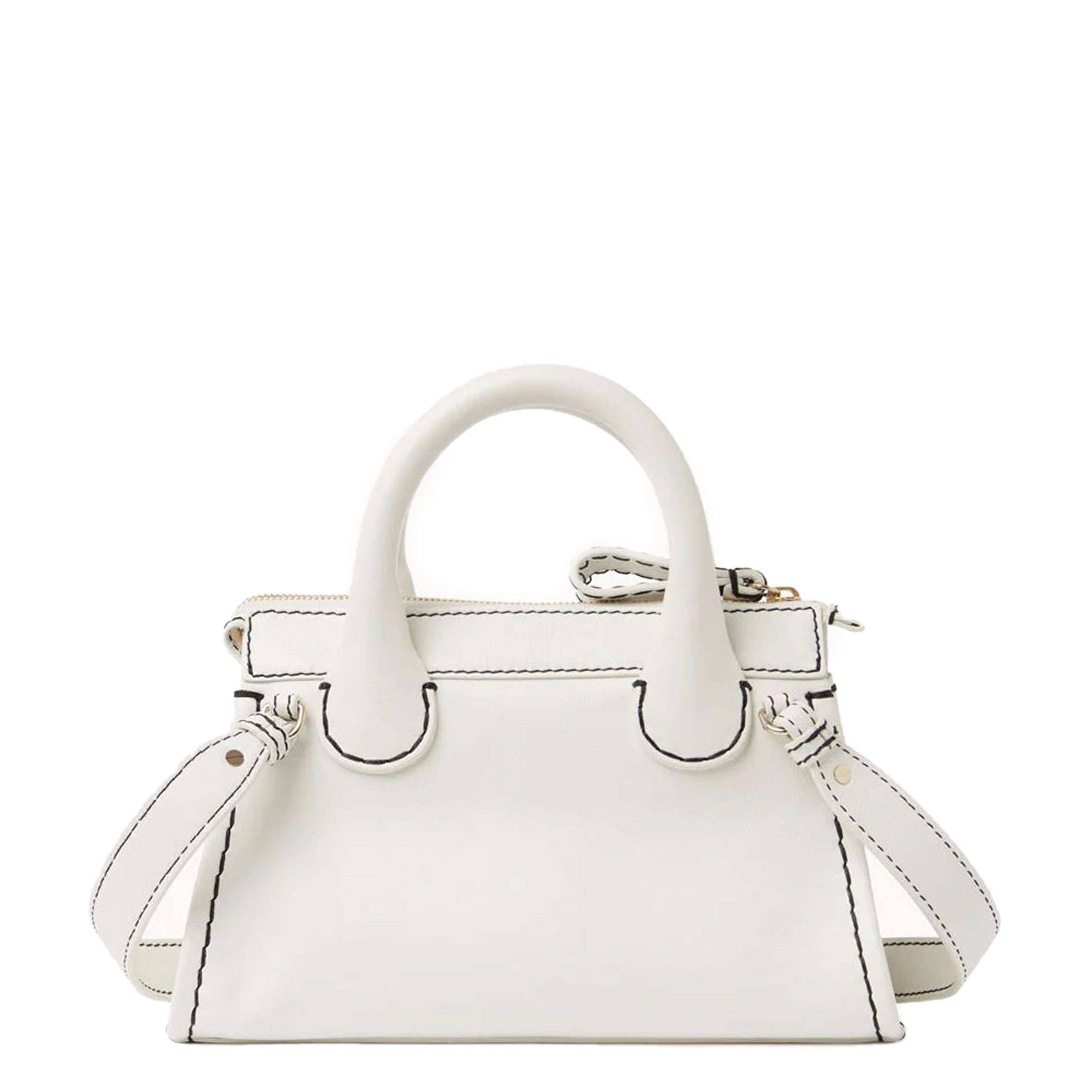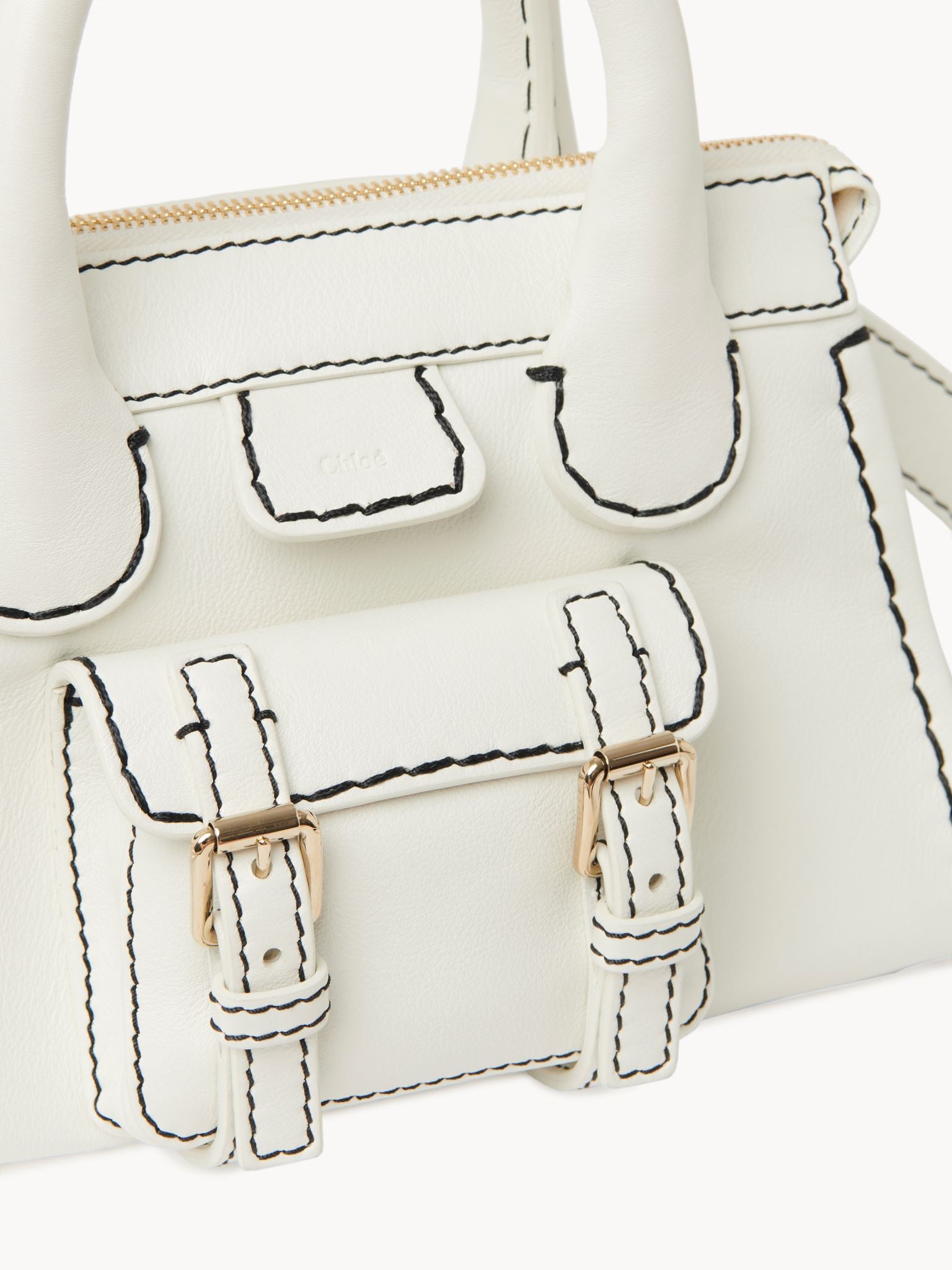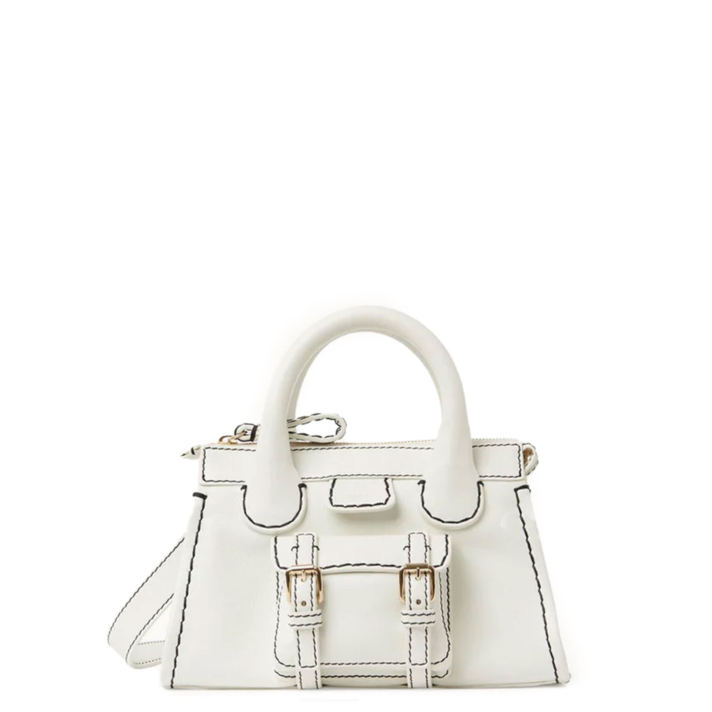 The iconic Chloe Edith bag has been reworked with contrast stitching that defines the shape of this bowling-style bag, crafted in supple grained leather. Featuring double top handles a removable shoulder strap and top zip closure. Finished with antique brass hardware. The bag consists of an inside zip compartment and lined with linen.