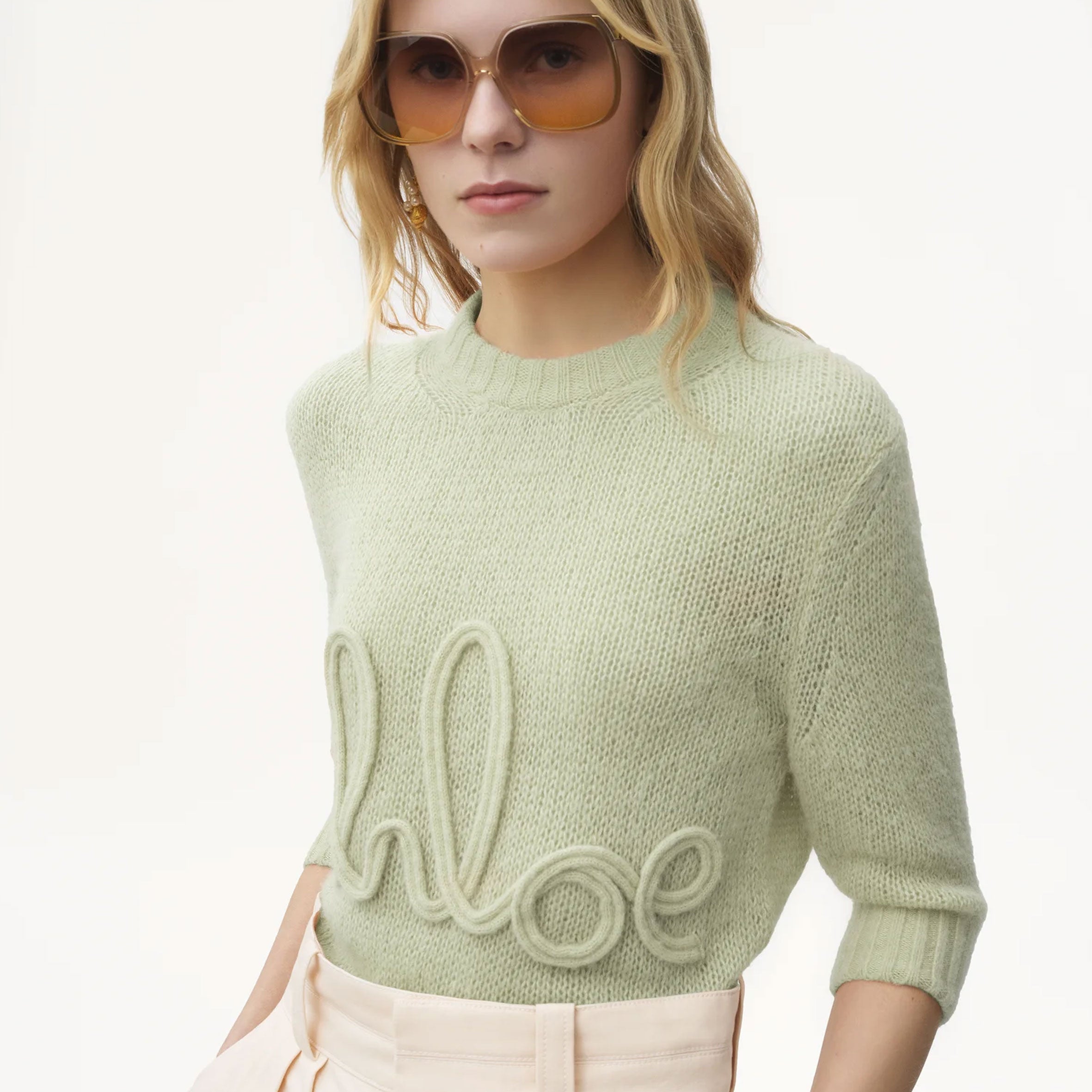 Crew-neck elbow-sleeve sweater in an alpaca wool and silk knit, detailed with ribbed trims and large Chloé logo embroidery at the front.