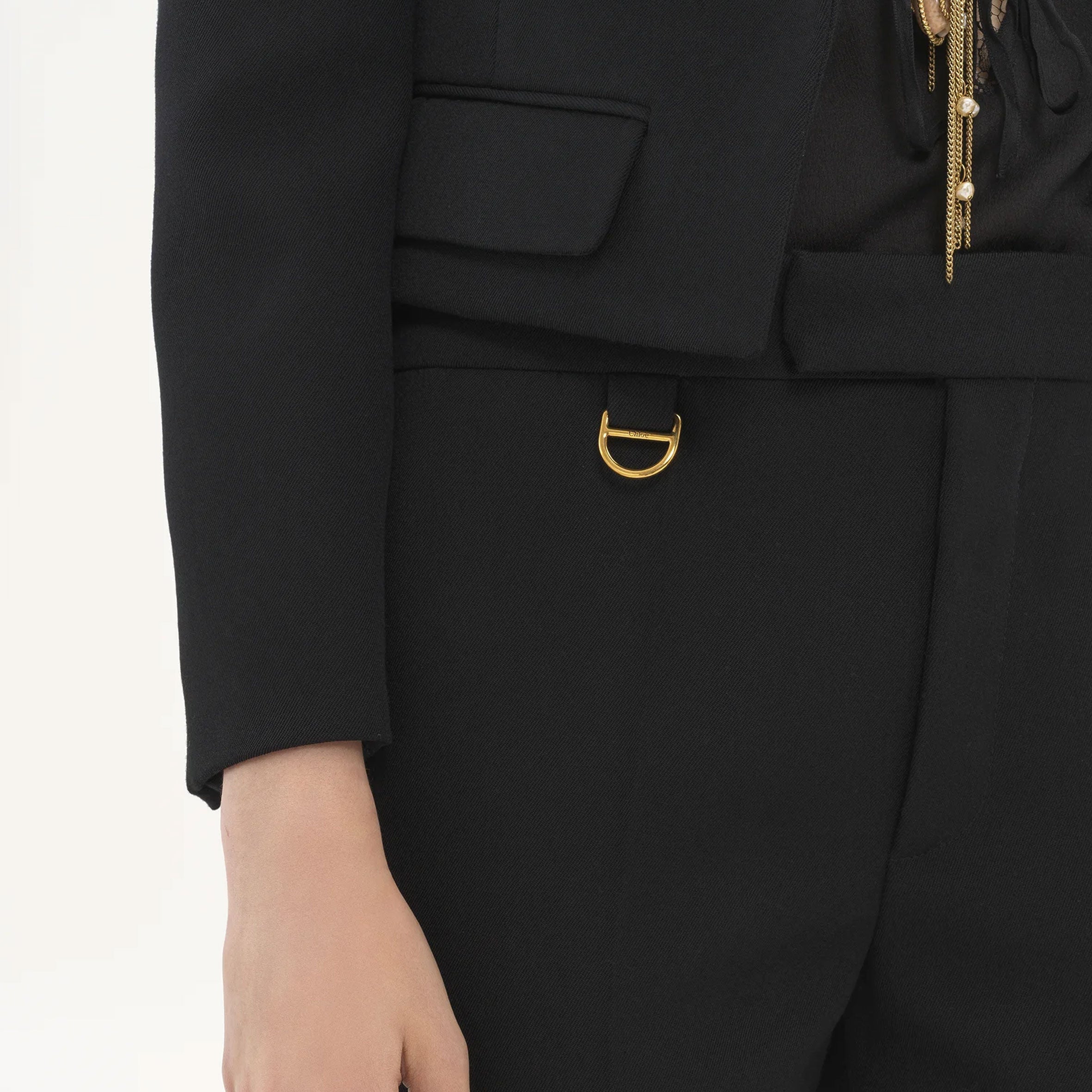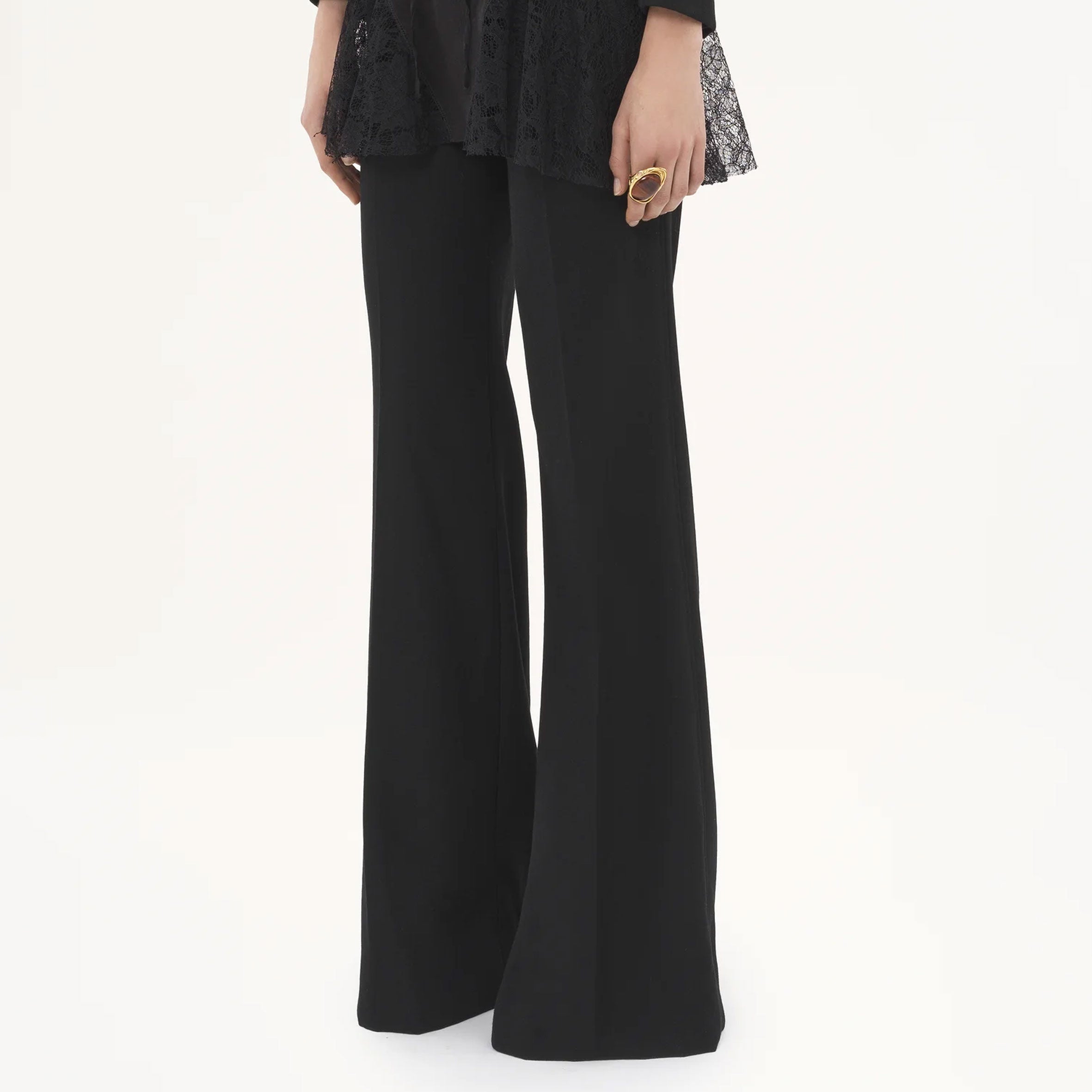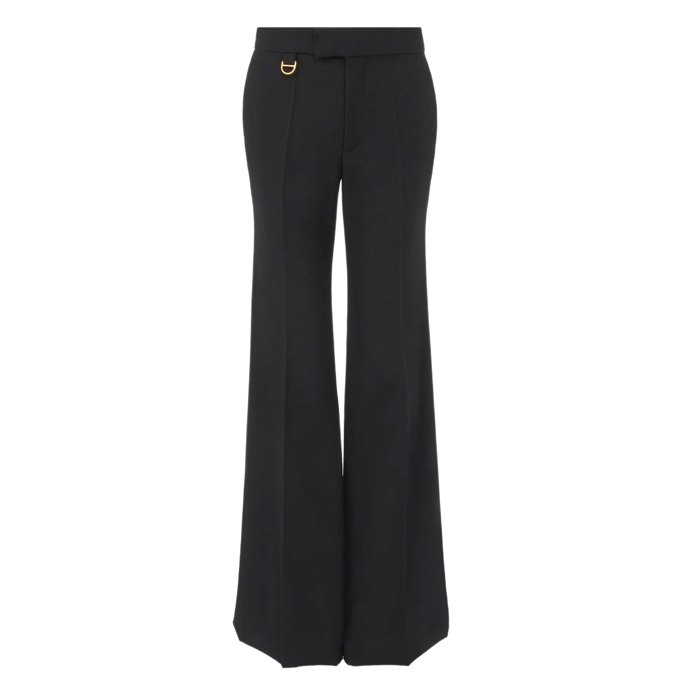 Regular-waisted flared tailored pants in lower-impact wool gabardine, finished with pressed front creases and a gold-tone D-ring at the right hip.