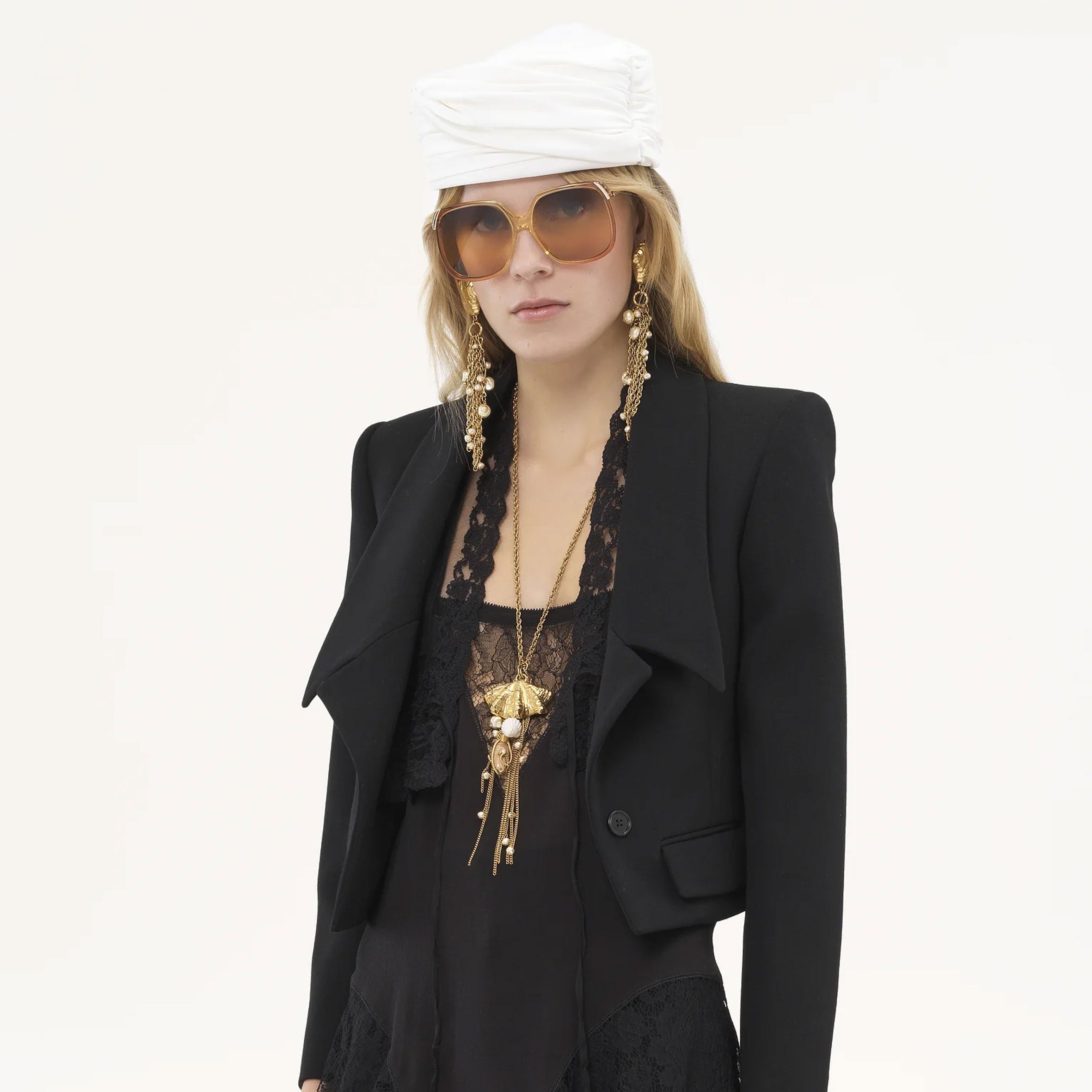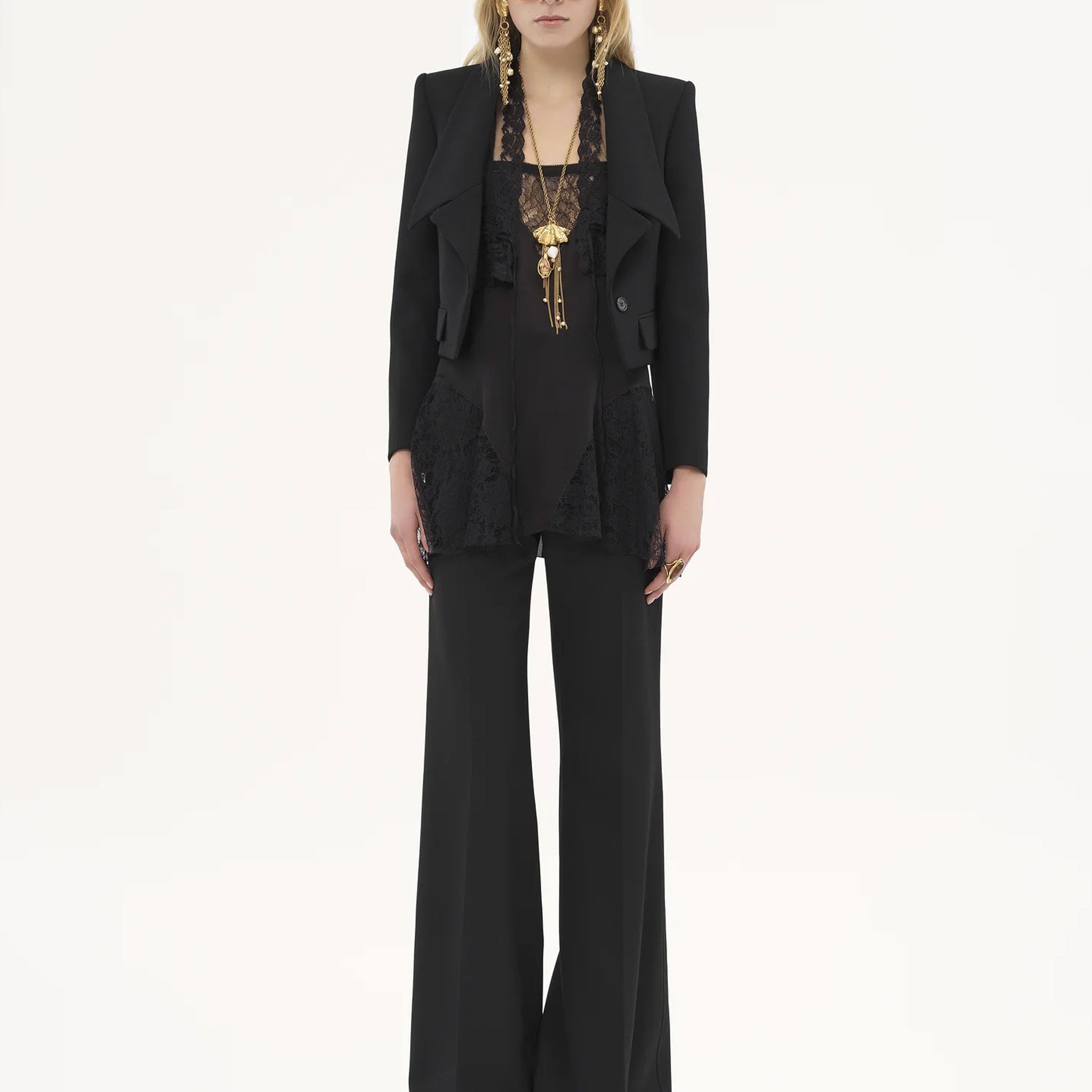 Cropped tailored jacket in lower-impact wool gabardine, inspired by the Maison's heritage. Mini flap pockets, oversized lapels and engraved horn buttons finish this piece.