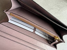 This flap wallet is made from soft metallic leather which may create smooth or light halos. If the leather gets wet, dry it with a soft white cloth to absorb water. With use, the leather may become marked and shiny.