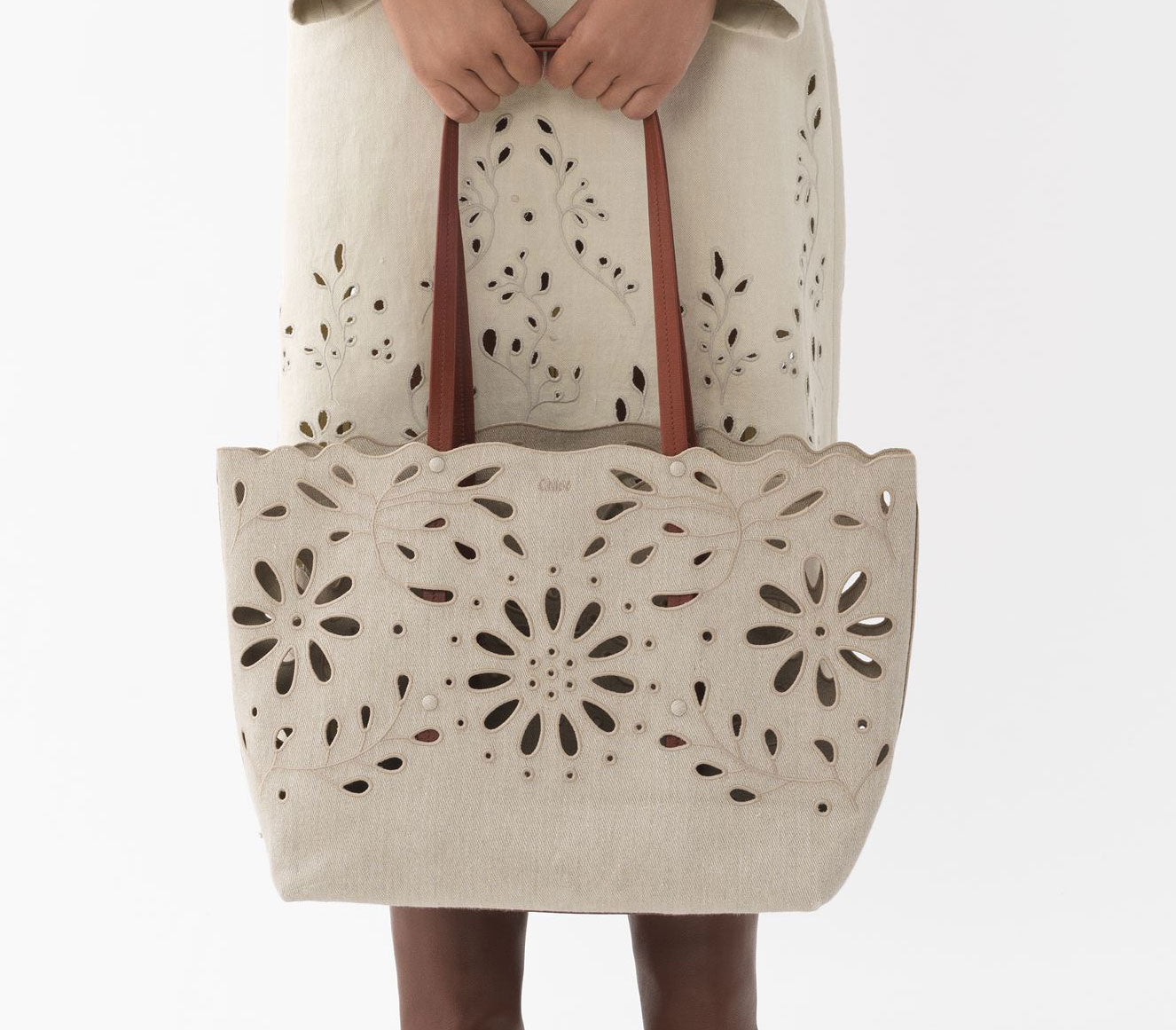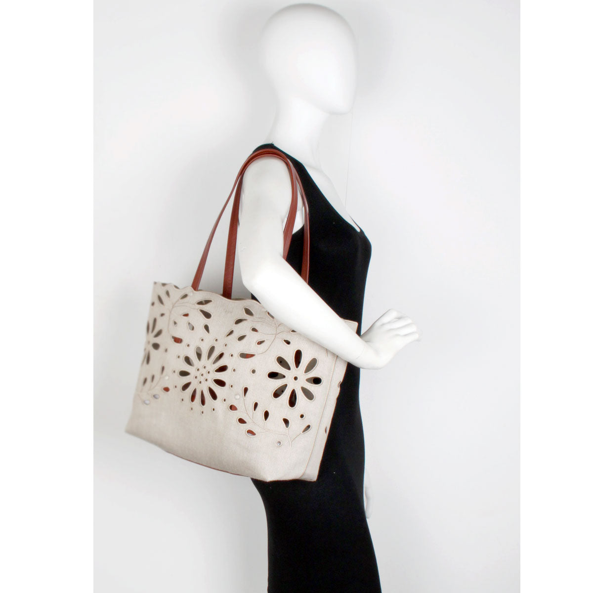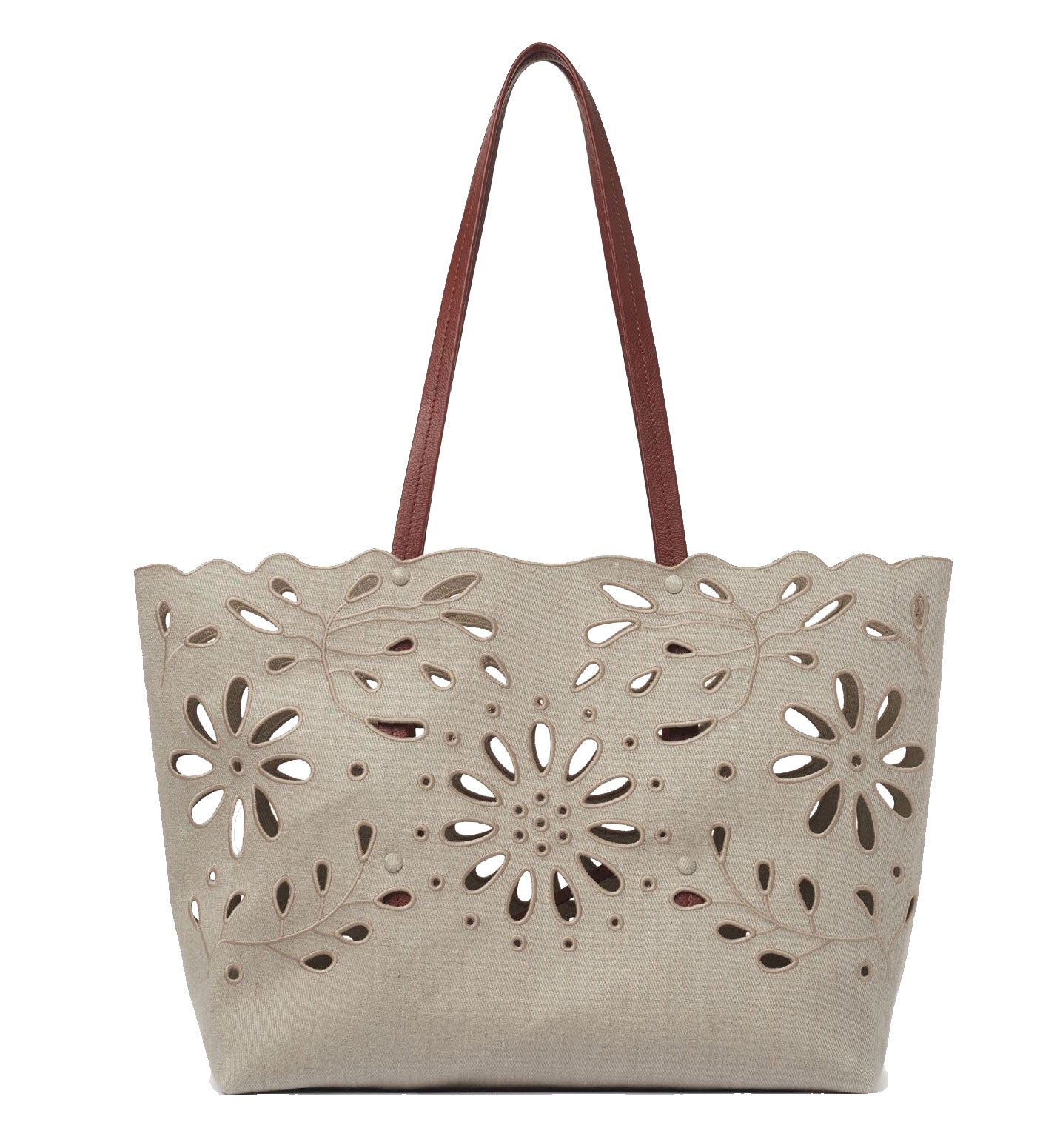 Crafted in a luxurious broderie anglaise linen, detailed with supple leather accents and the brand's iconic scallops. Perfect to carry all you need in style, this bag has arrived just in time for summer in the beautiful and classic, sepia brown.