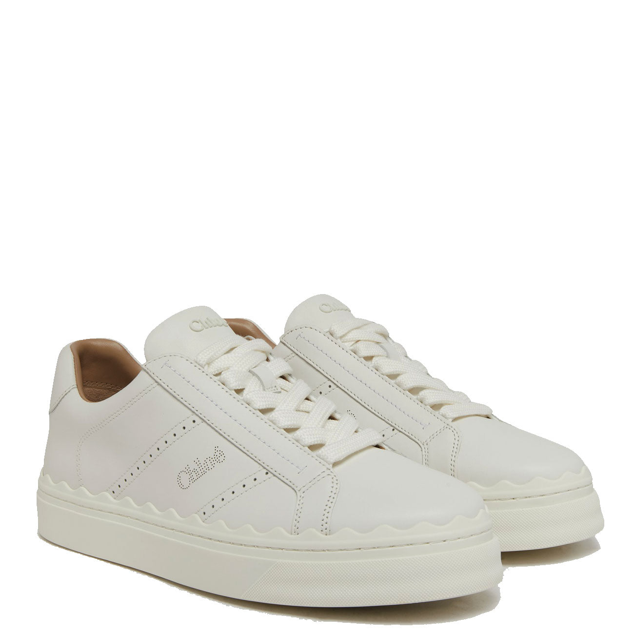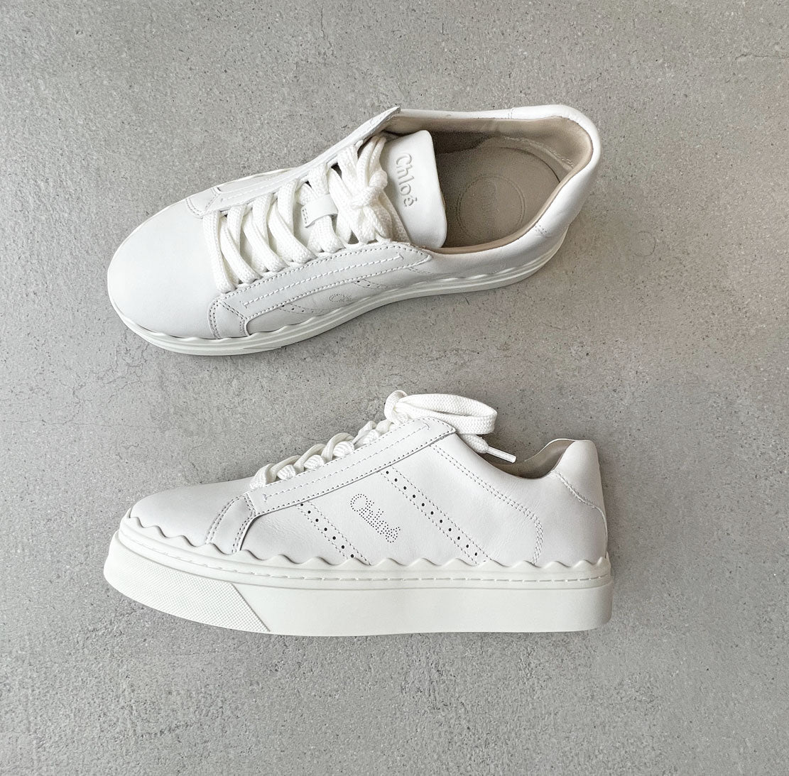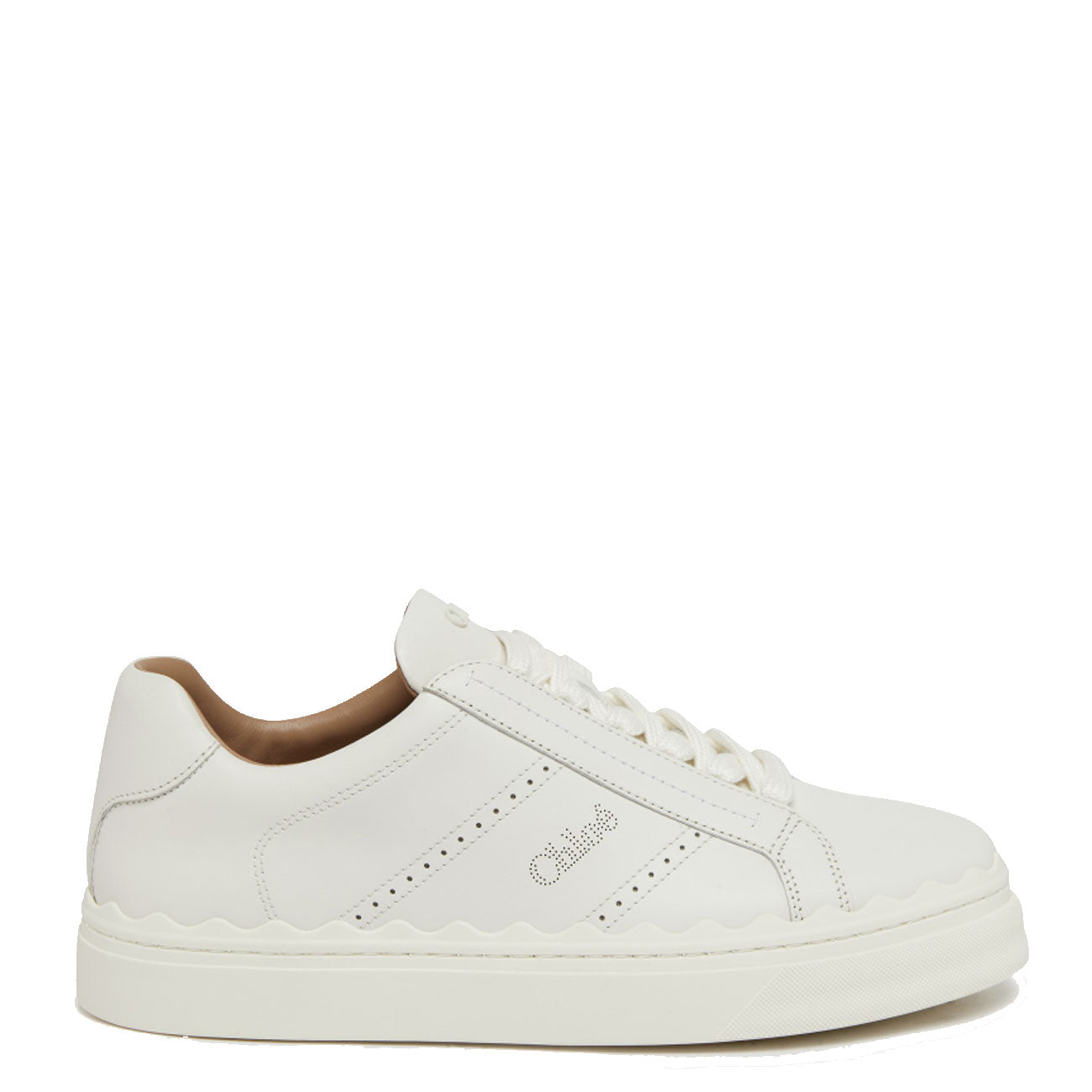 A sporty update on the classic Laurent sneaker from Chloe with a logo embossed tongue finished with a logo heel collar and scalloped detailing on the rubber sole. This season will perforated leather and mixed leather finishes on tonal white.