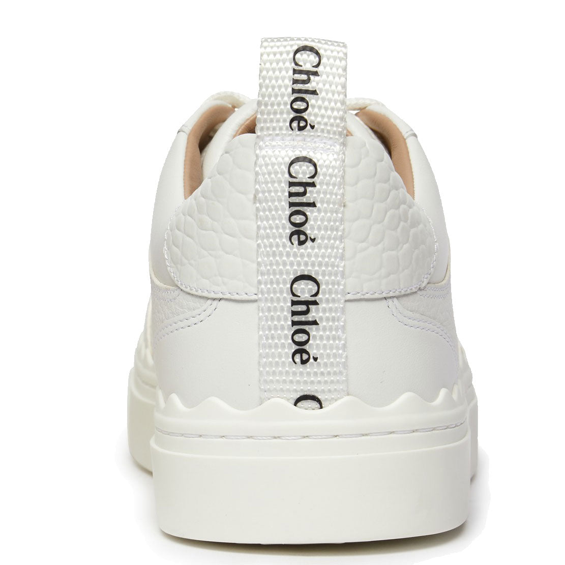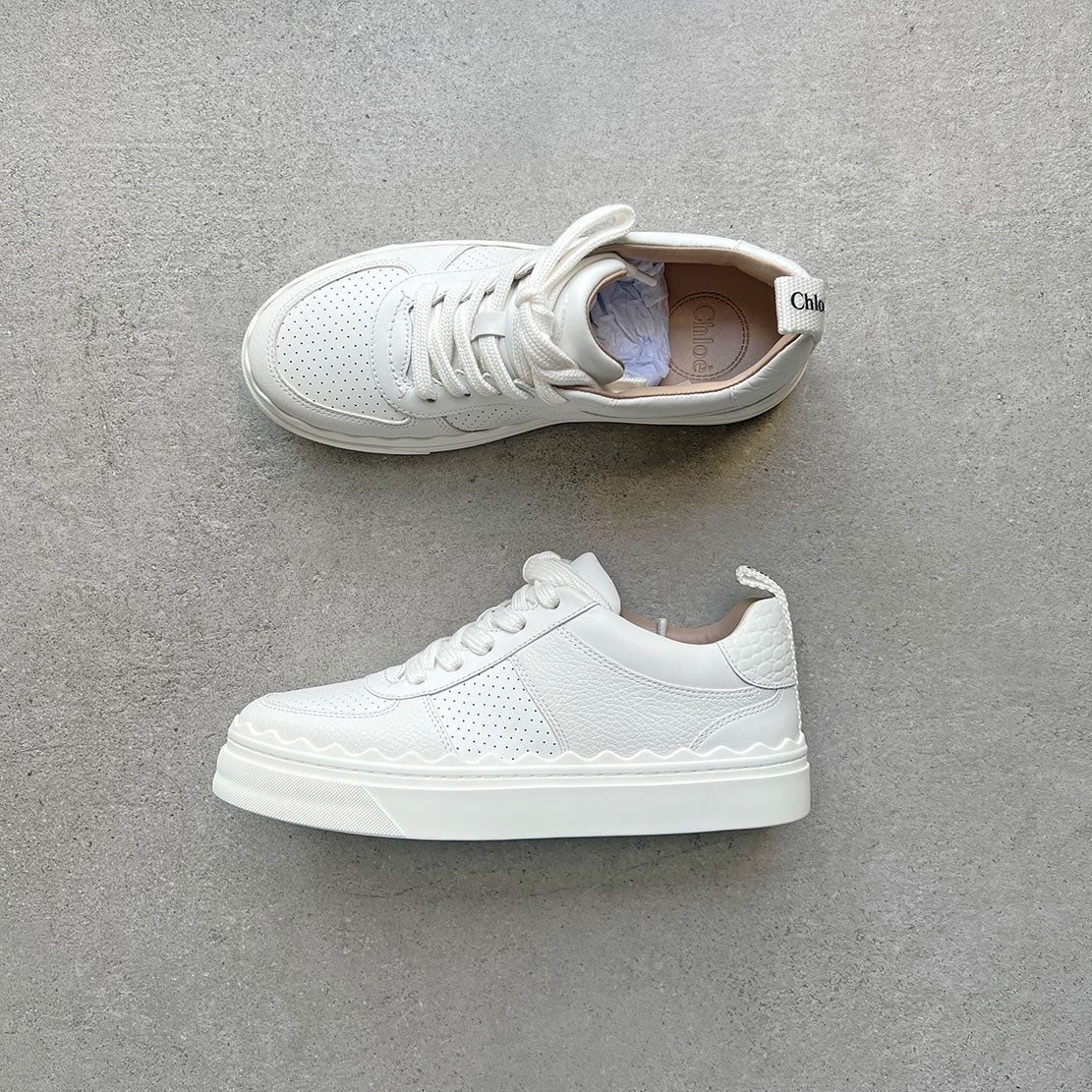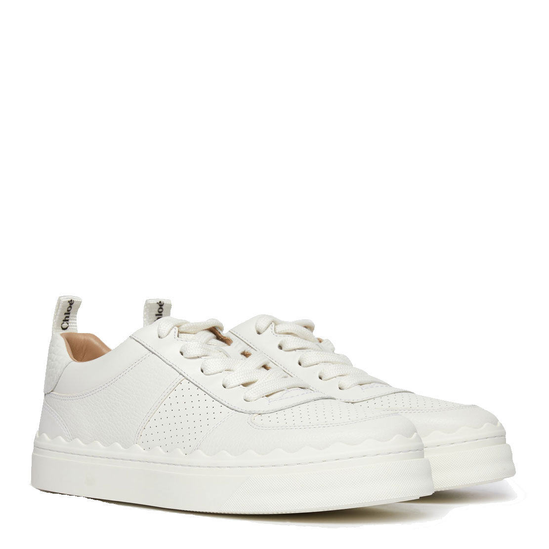 A sporty update on the classic Laurent sneaker from Chloe with a logo embossed tongue finished with a logo heel collar and scalloped detailing on the rubber sole. This season will perforated leather and mixed leather finishes on tonal white.