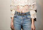 Chloé Iconic chain belt featured on the Fall-Winter 2024 runway, inspired by a design rooted in the Maison's heritage. The chain features small round links elevated by a Chloé logo in gold brass. This belt links to Chloé's jewelry line. Wear high on the waist or low on the hips.