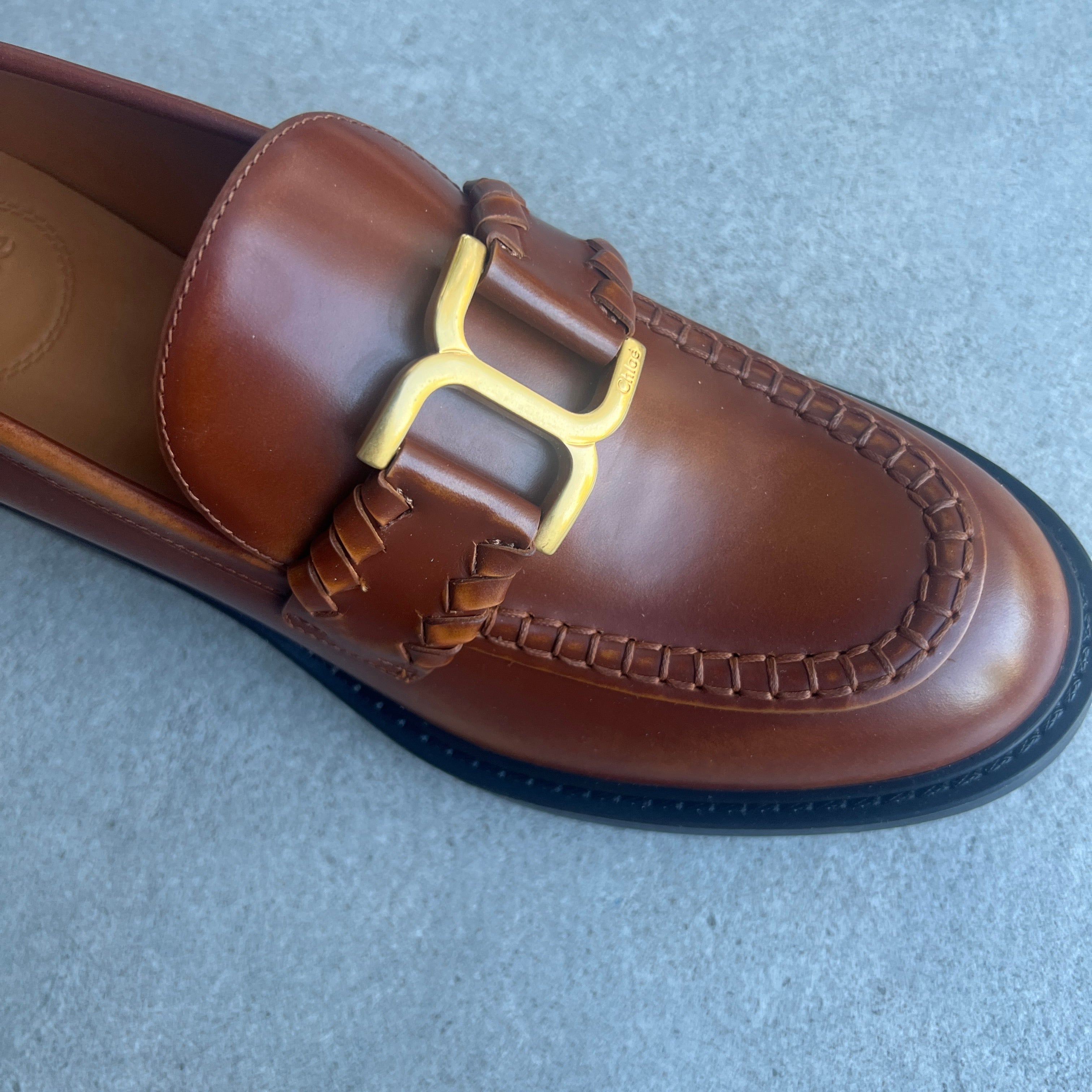 Reinterpreting the iconic leather goods line, this classic Marcie heeled loafer is crafted from brushed calfskin elevated with the distinctive braided details and Chloé-engraved gold-toned hardware found in the Maison's Marcie bags.