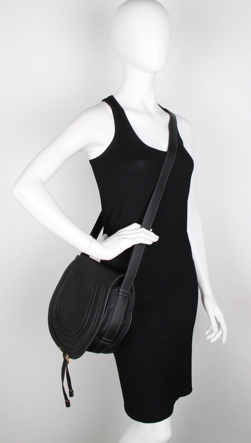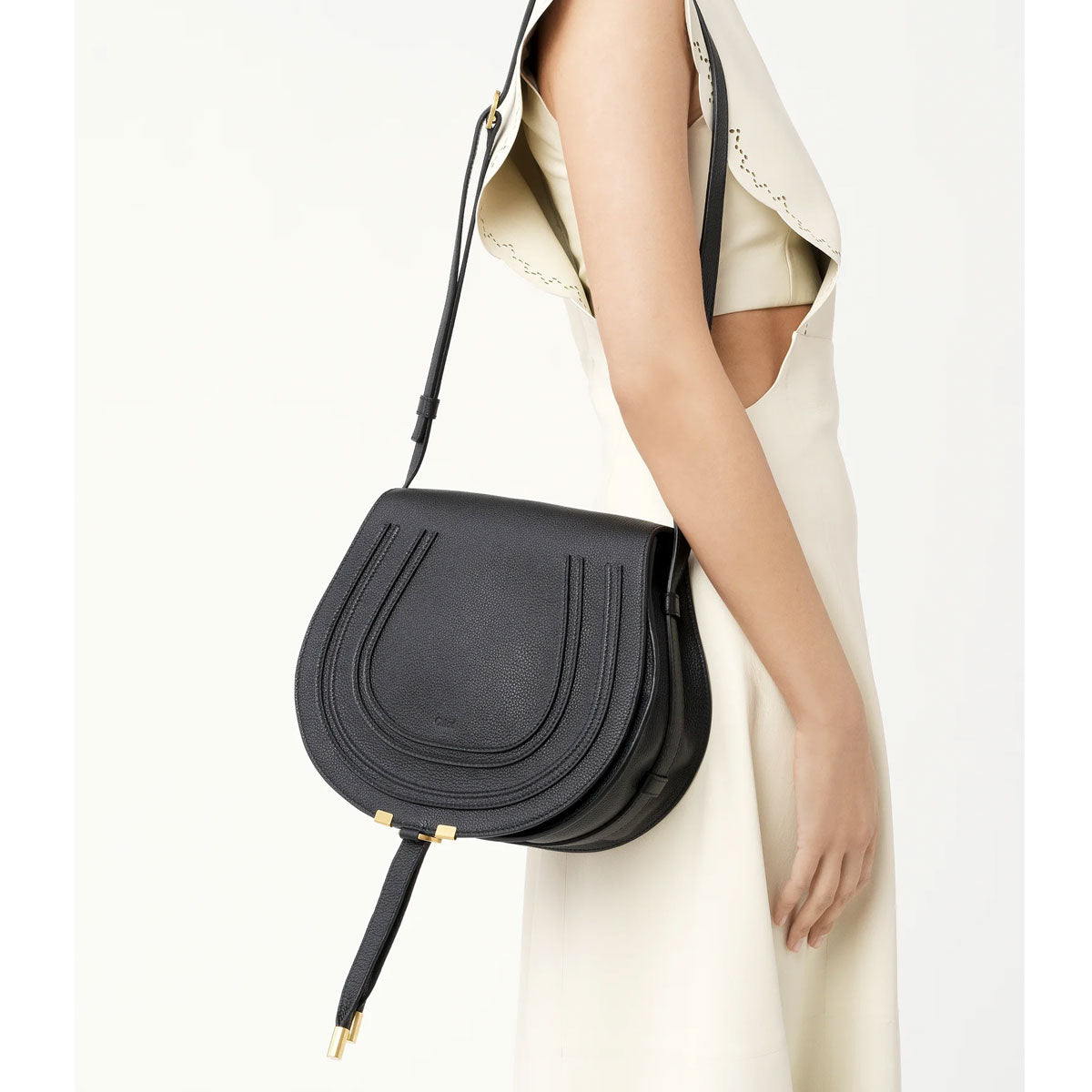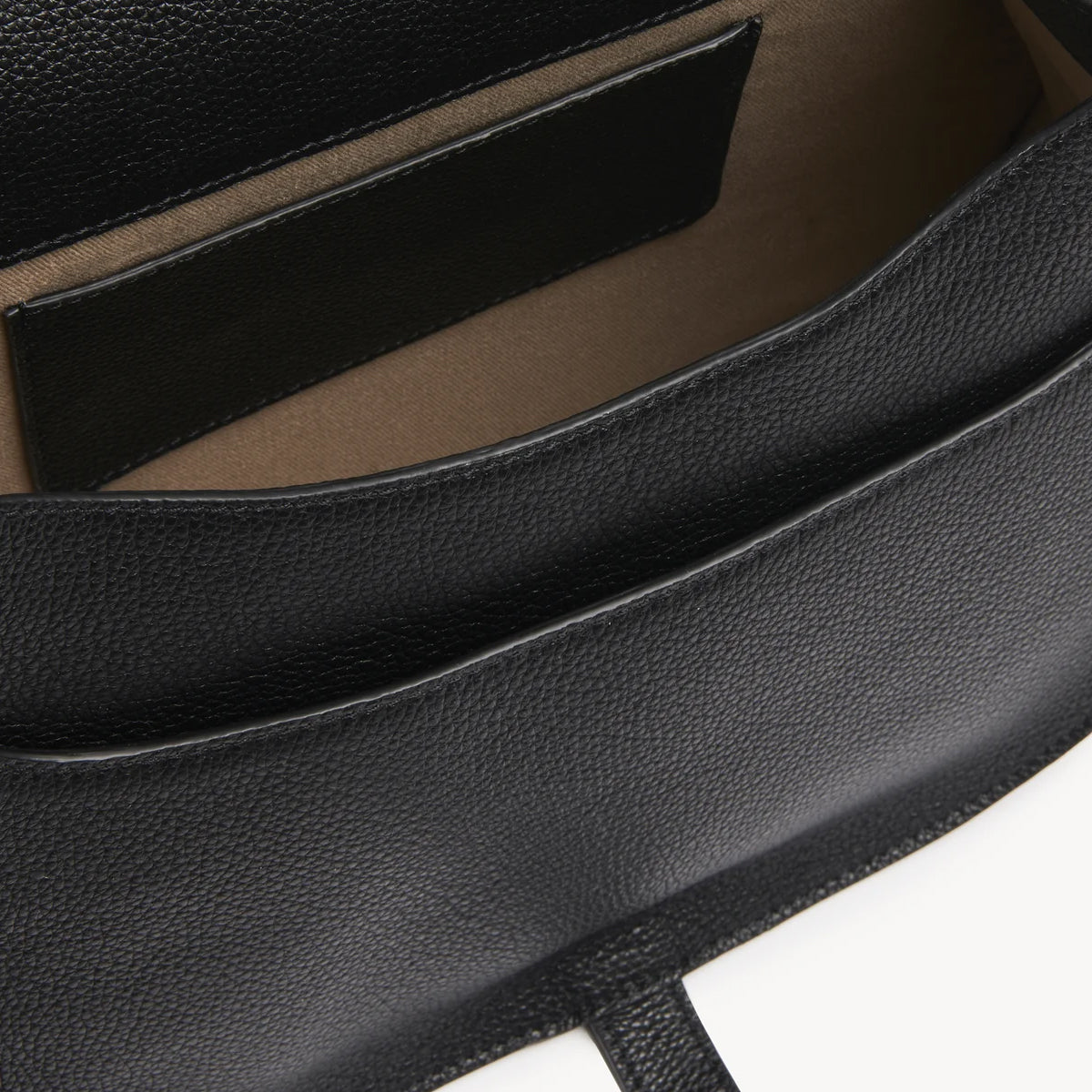 Genuine calfskin leather with canvas lining and gold-tone hardware. Comes with an adjustable shoulder strap and fold-over flap top with straps and buckle closure. Also comes with an interior pocket and front compartment.