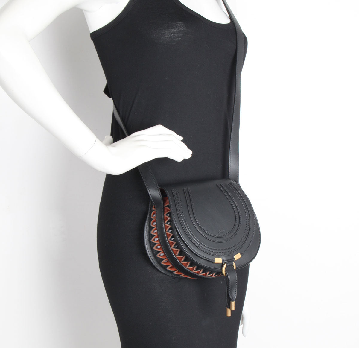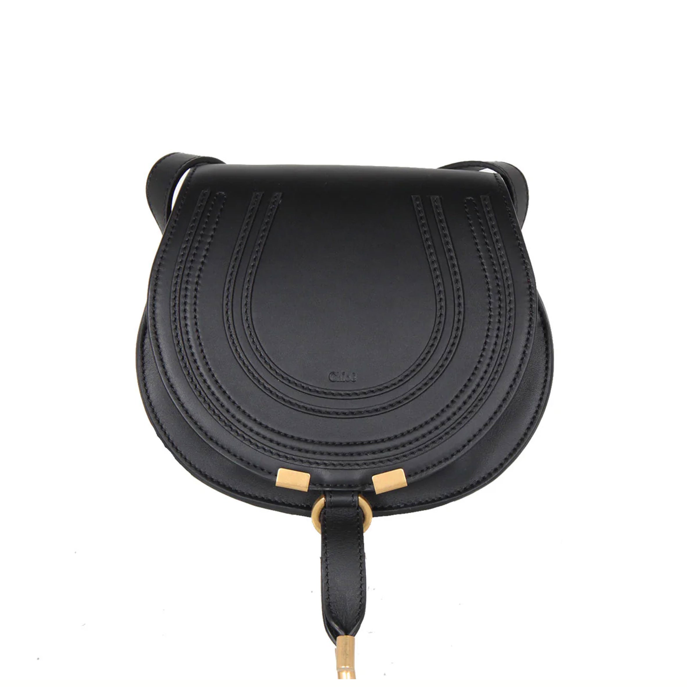 The Chloe mini 'Marcie' bag in robust grained leather comes with an adjustable leather strap. It closes with a petite loop through fastening in antique gold. This bag has one main compartment with and is lined with cotton. There is a slip front pocket and an internal flat card pocket. Finished with U shaped embellishments to reference Chloe's signature horse references.