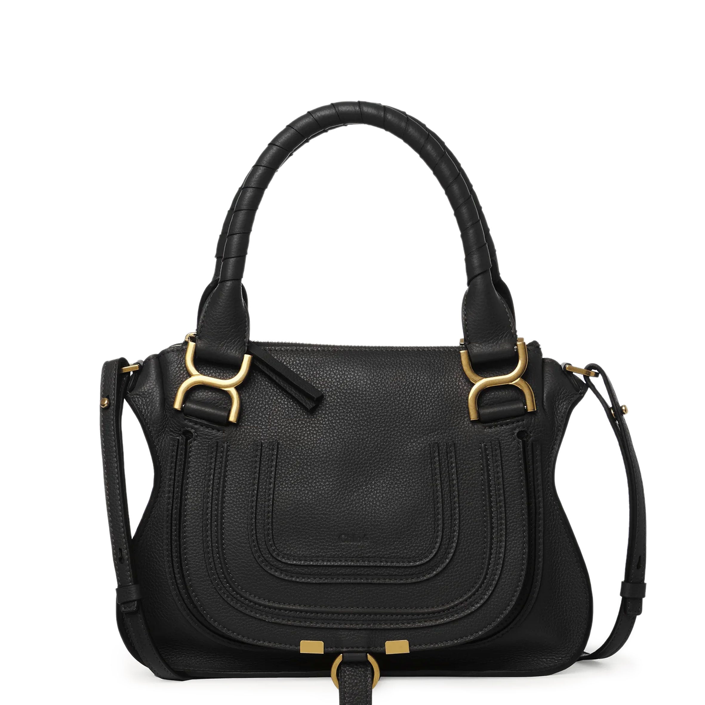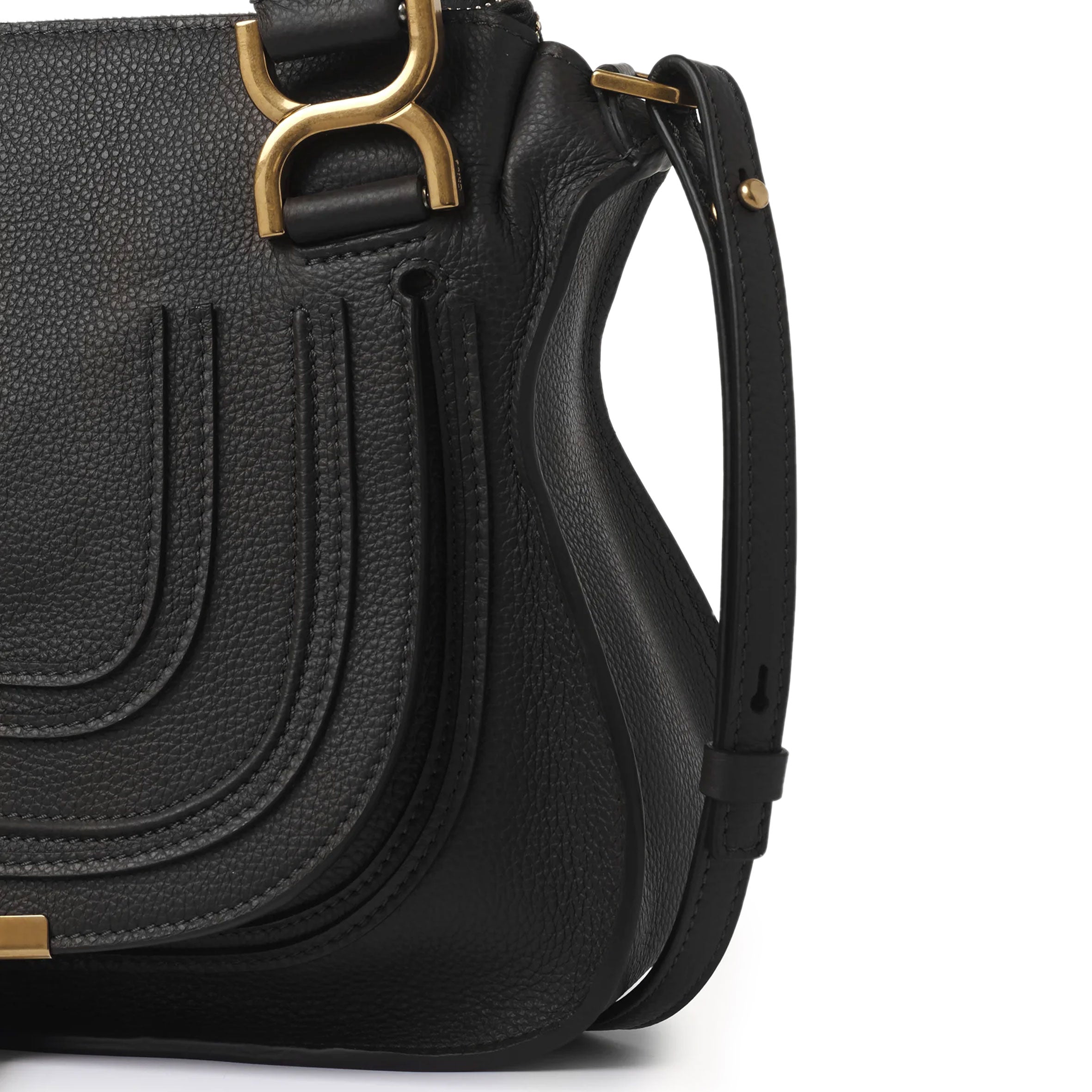 Decorative saddle stitches on the front flap tie in with the brass studs along the curved edges for an equestrian influence. The X-shaped buckles bring a feminine, refined touch. Double leather wrapped-handles and a long shoulder strap mean you can carry Marcie any which way: long shoulder, cross body or by hand.