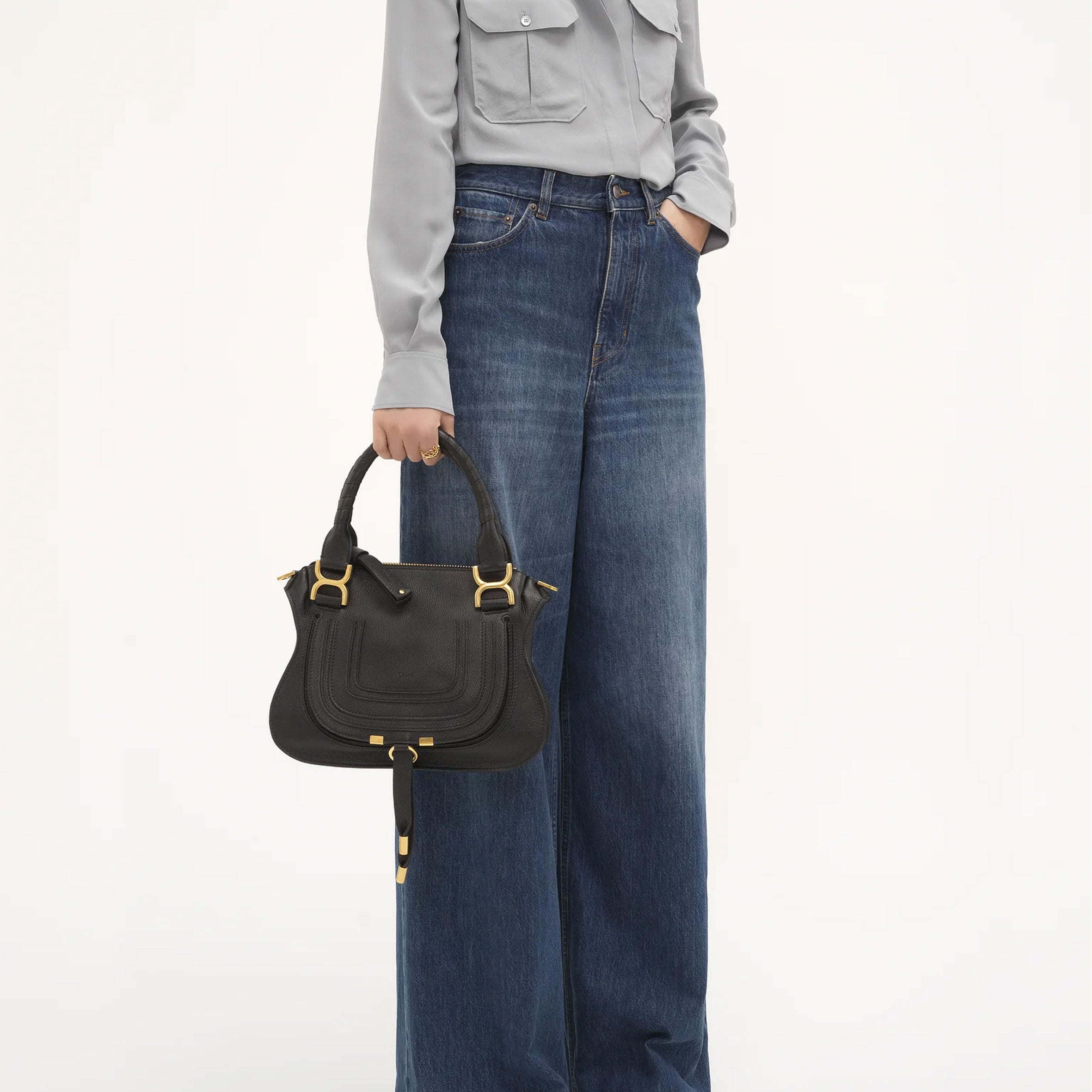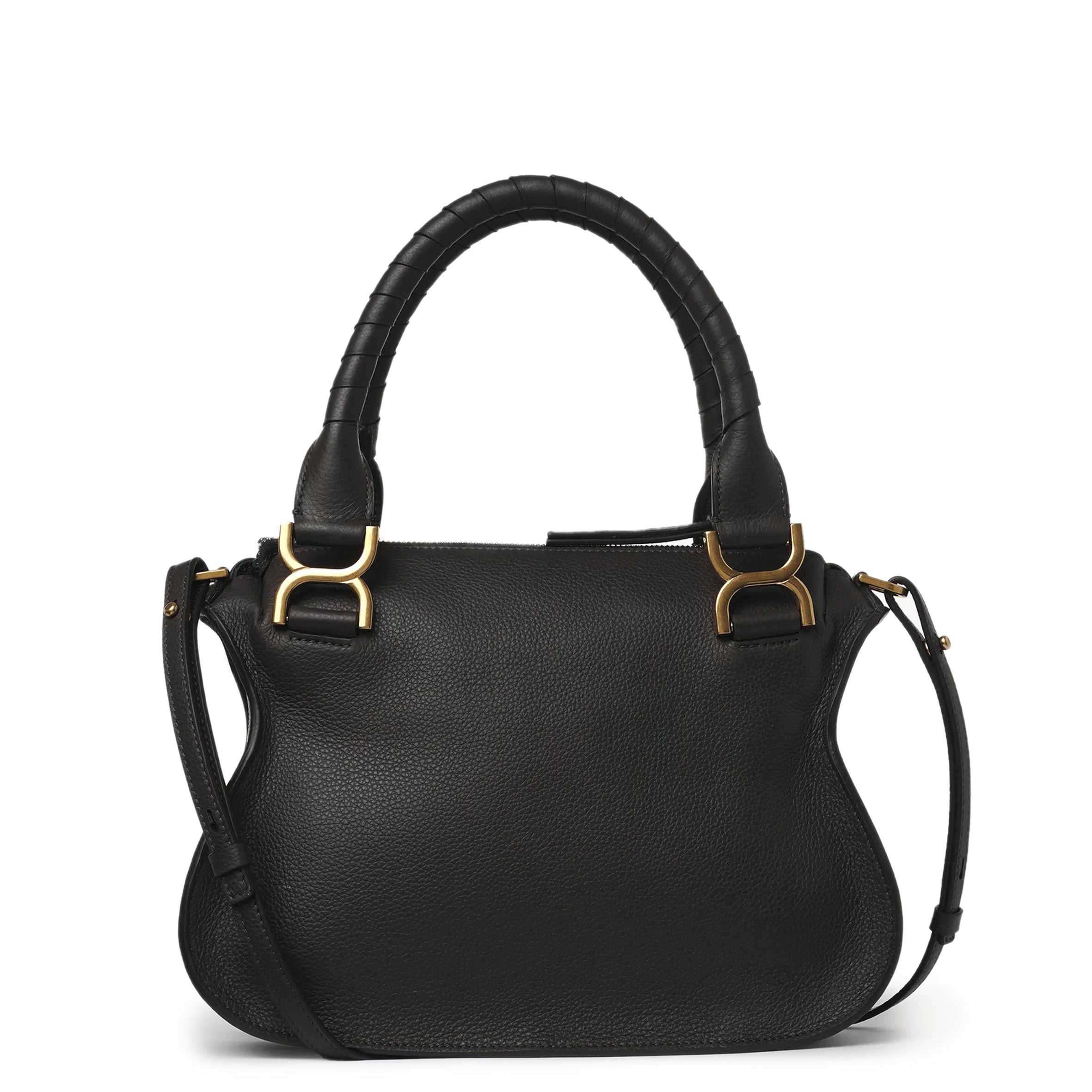 Small Marcie double carry bag in grain calfskin with antique brass hardware.