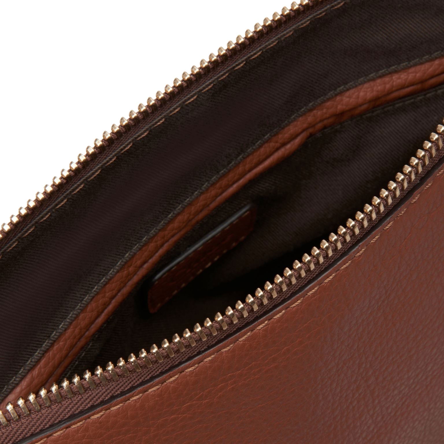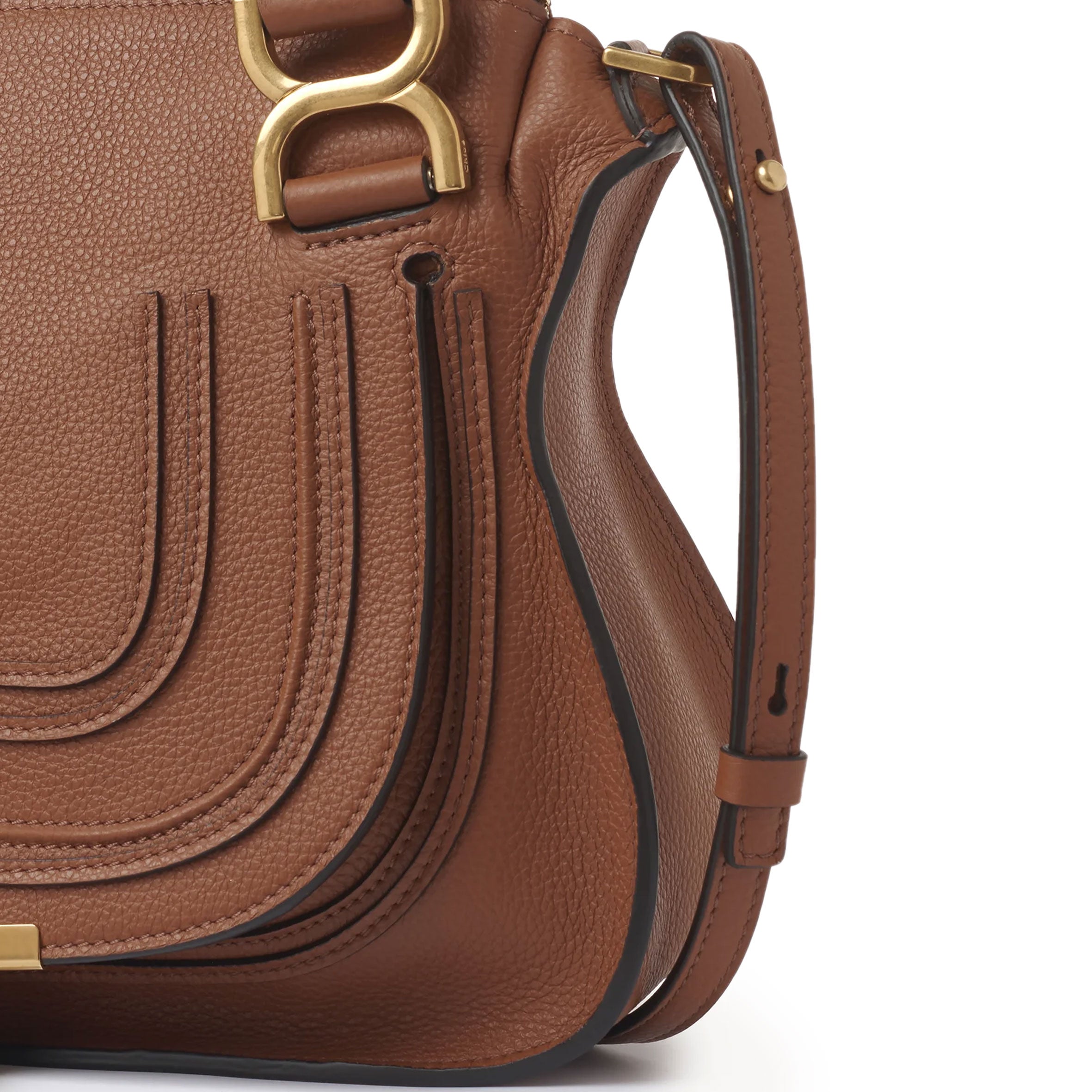 Decorative saddle stitches on the front flap tie in with the brass studs along the curved edges for an equestrian influence. The X-shaped buckles bring a feminine, refined touch. Double leather wrapped-handles and a long shoulder strap mean you can carry Marcie any which way: long shoulder, cross body or by hand.