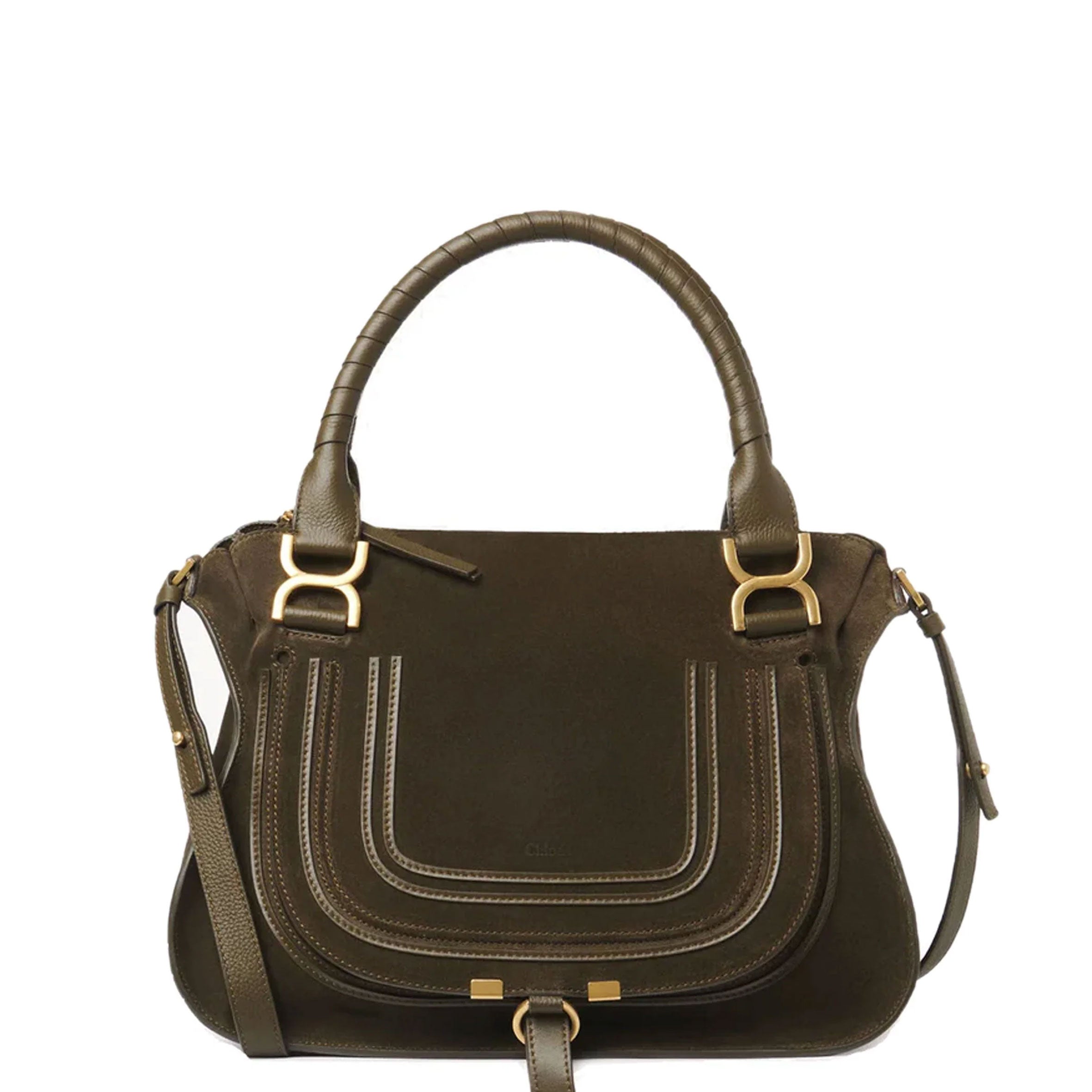 Medium Marcie double carry bag in suede calfskin with antique brass hardware.