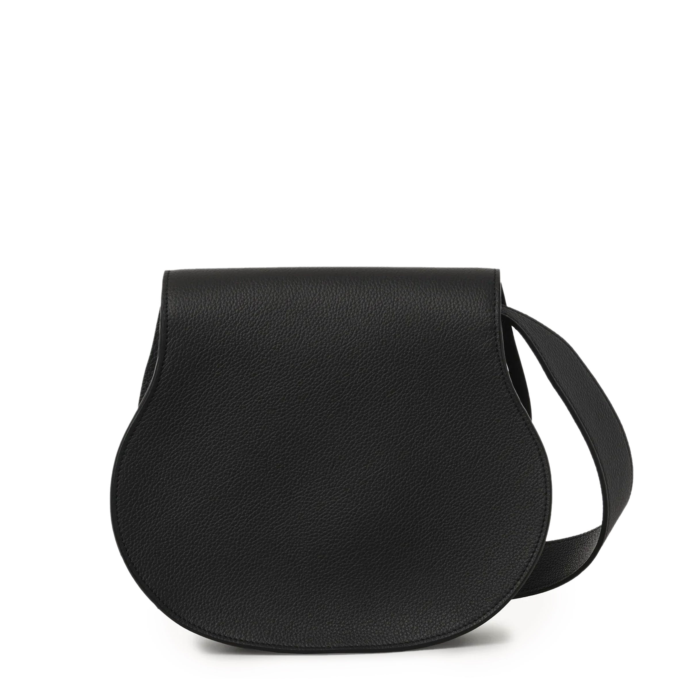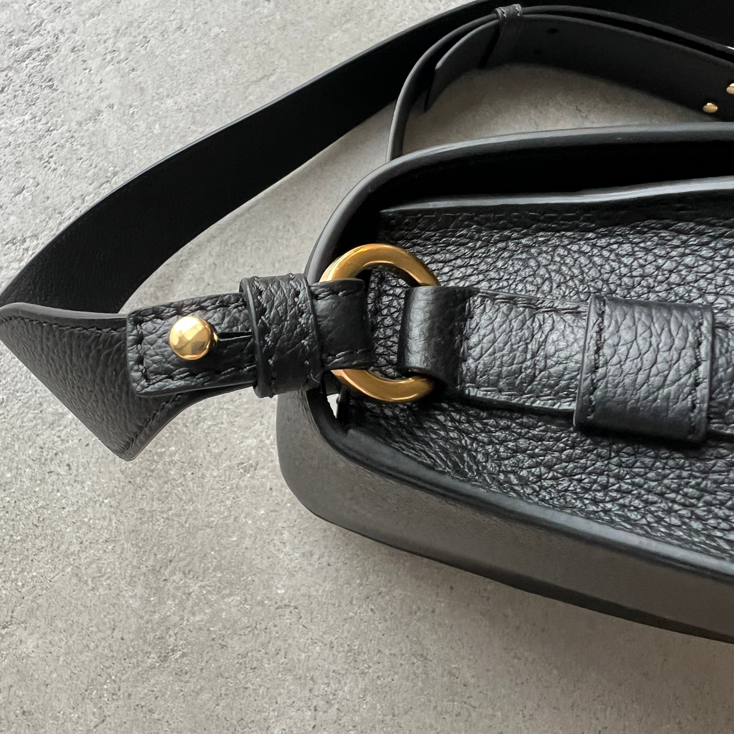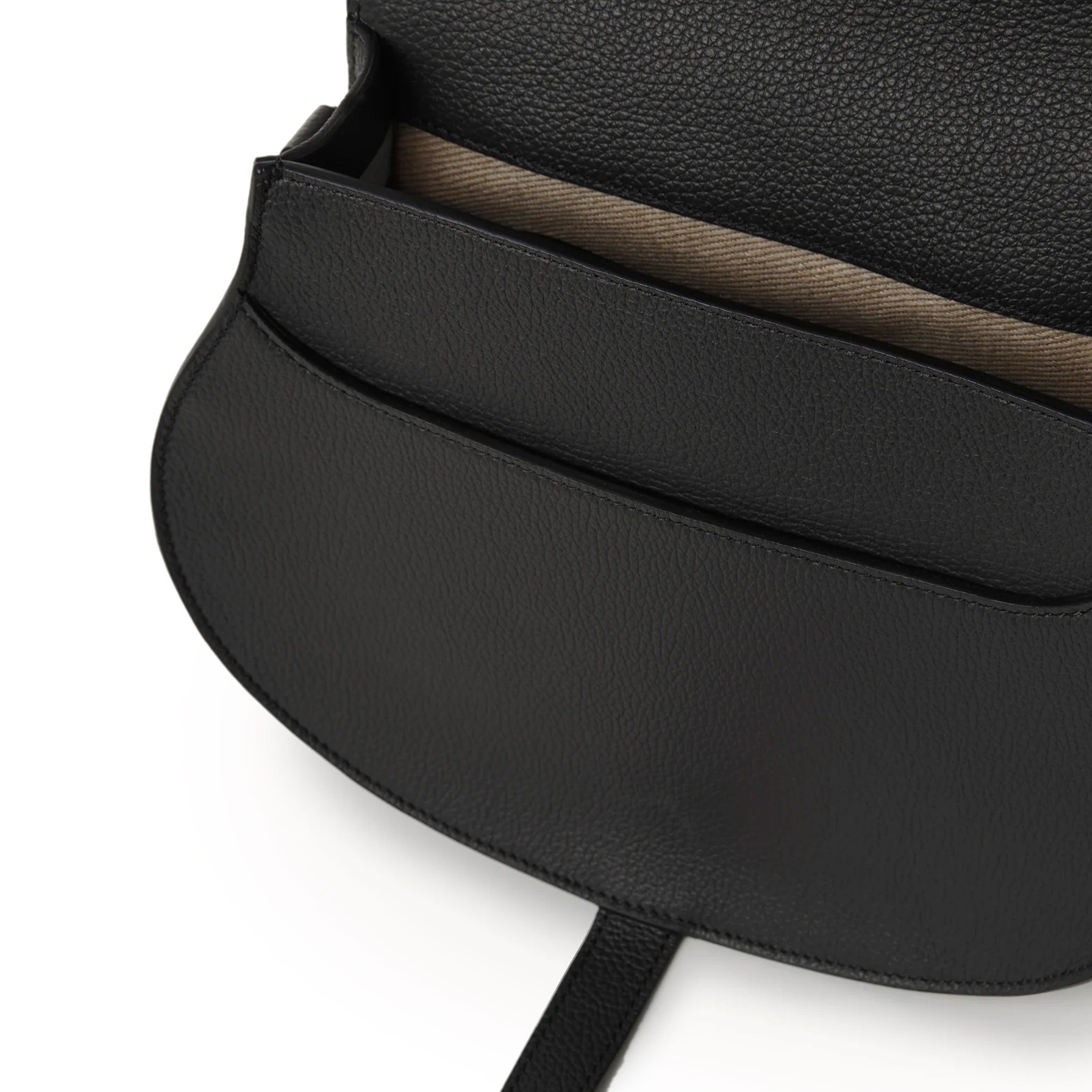 This Marcie saddle bag is crafted from grained calfskin with a rounded silhouette and a clean top line. The flap features the line's iconic saddle stitching, secured with signature dangling leather tassels.