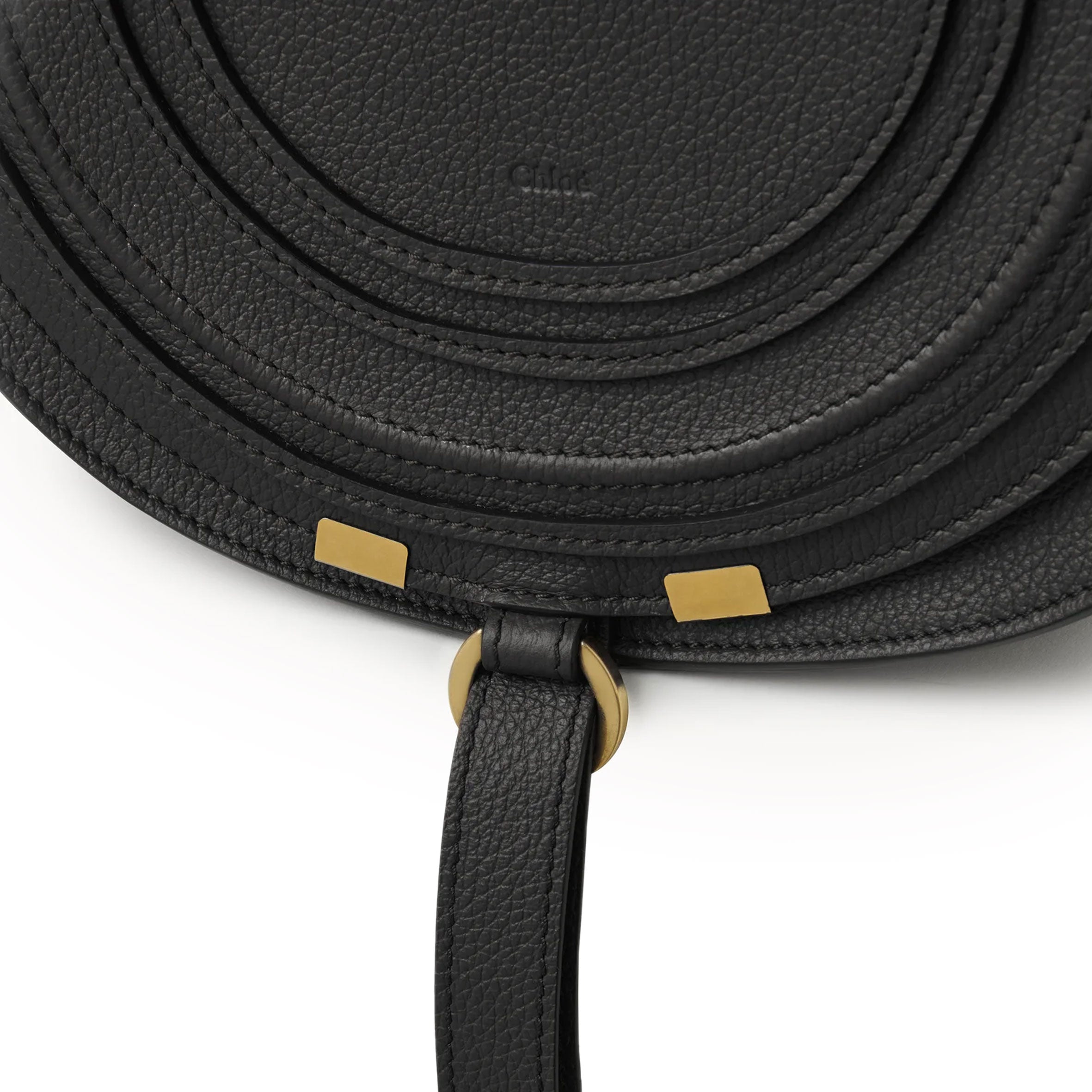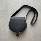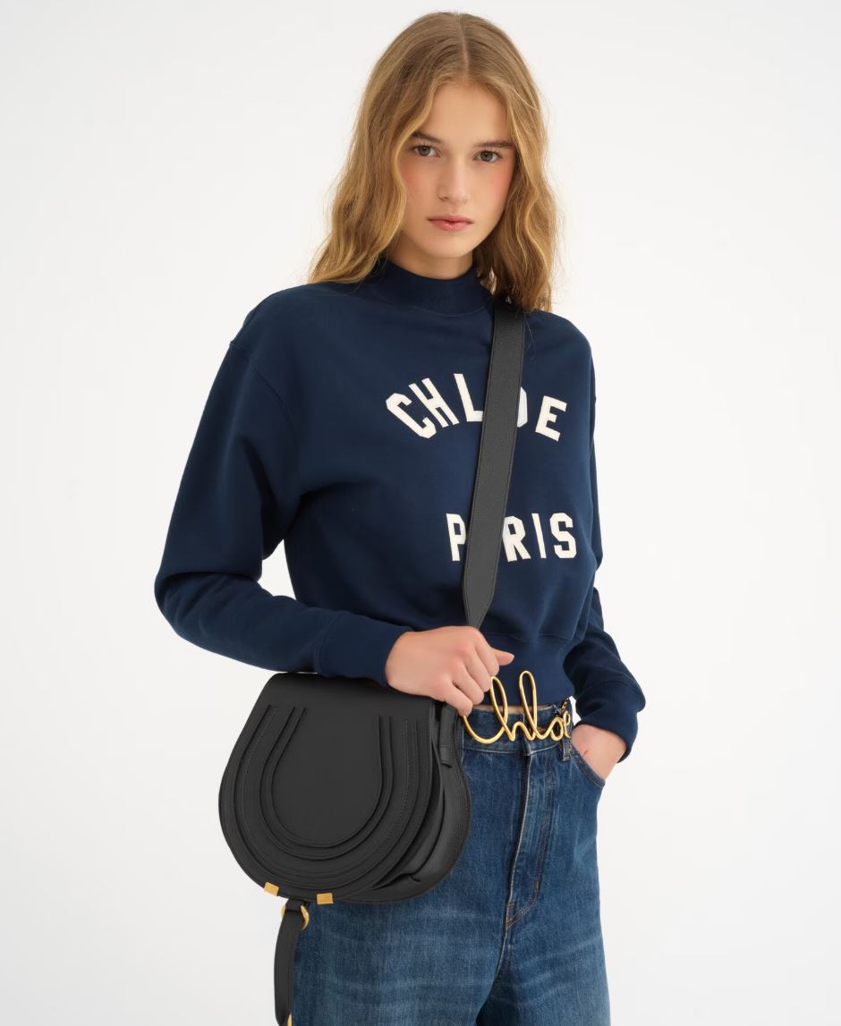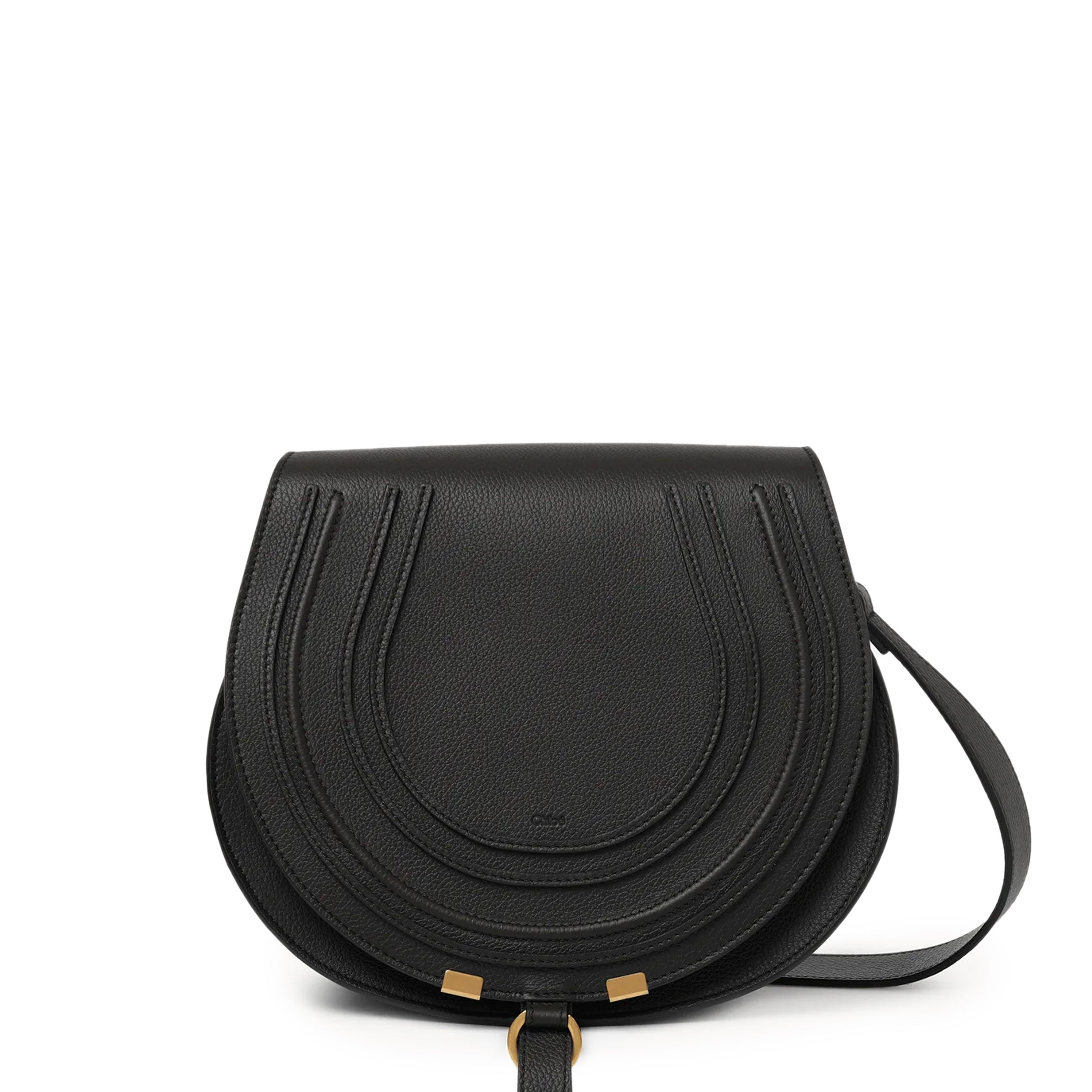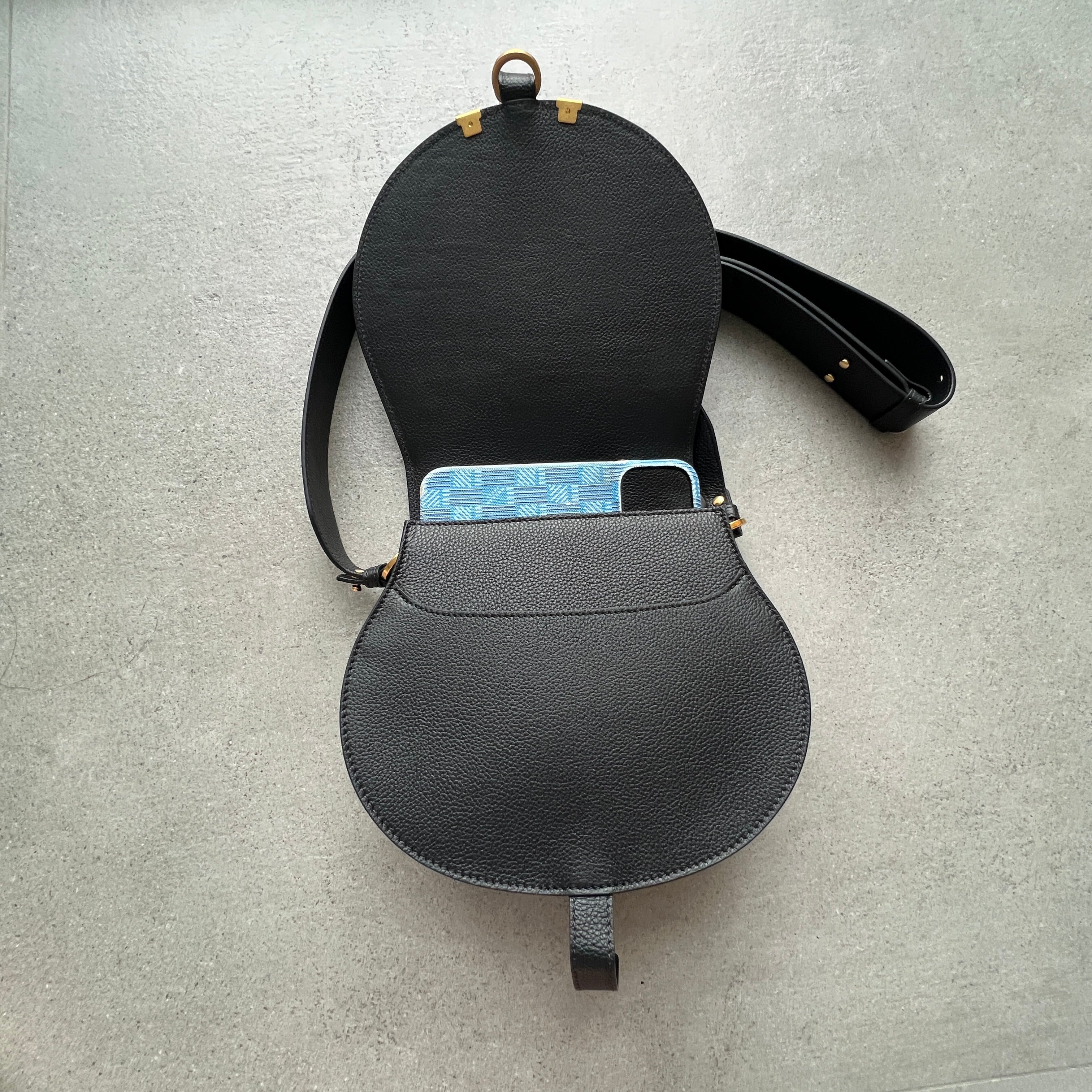 This Marcie saddle bag is crafted from grained calfskin with a rounded silhouette and a clean top line. The flap features the line's iconic saddle stitching, secured with signature dangling leather tassels.