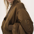 Bomber jacket in nylon with contrast ribbed trims at the maxi collar, waist and cuffs. Snap-button flap pockets and a zippered sleeve pocket finish this piece.