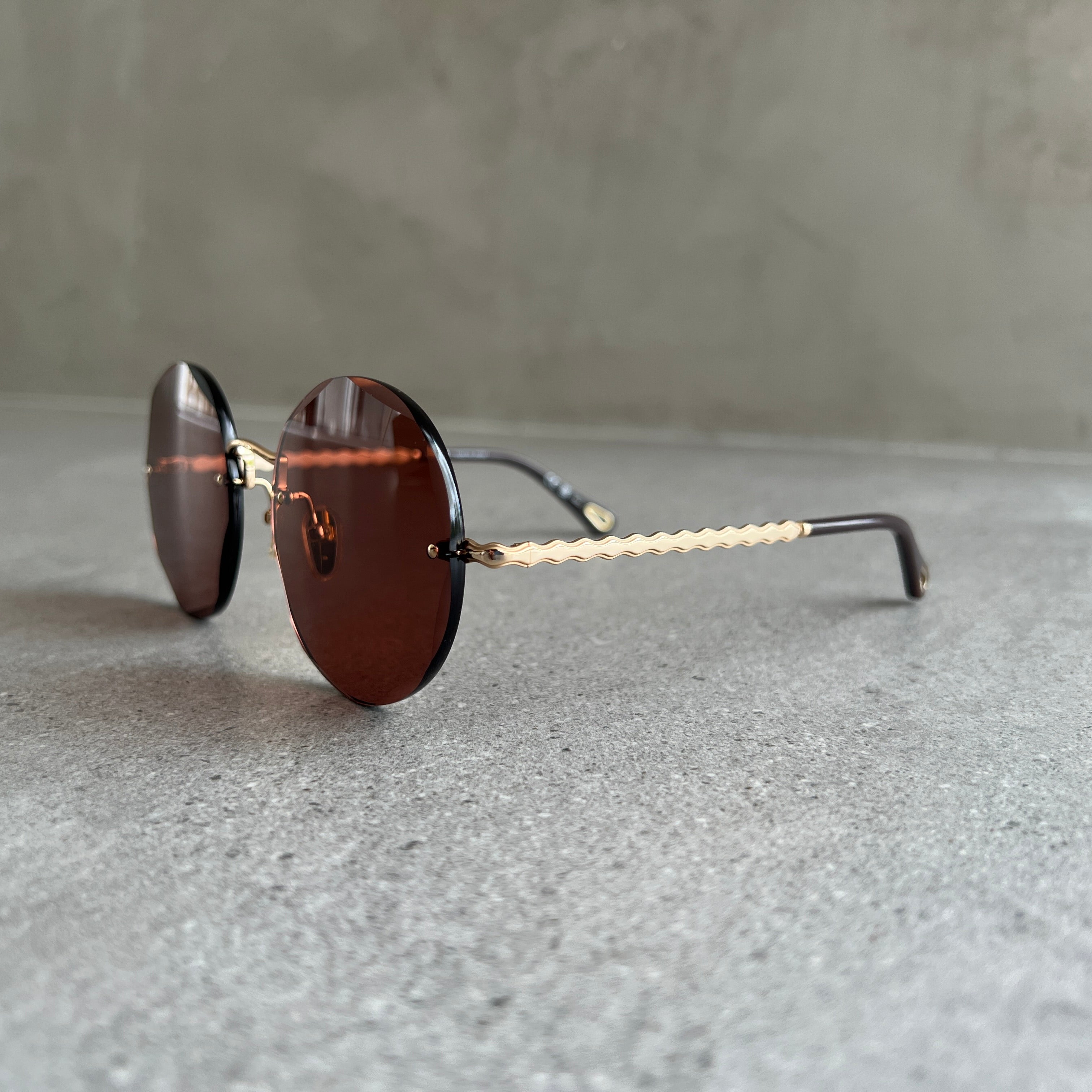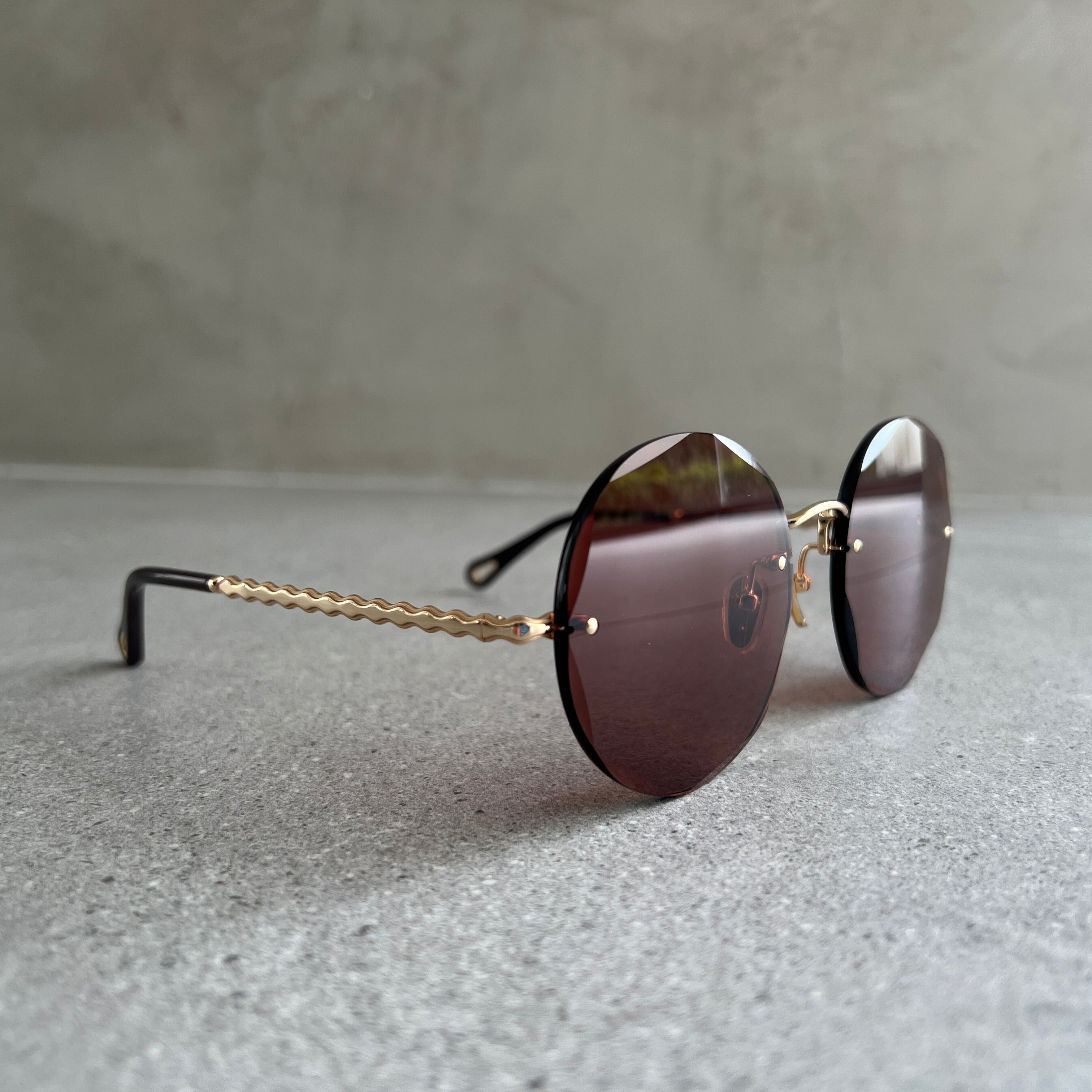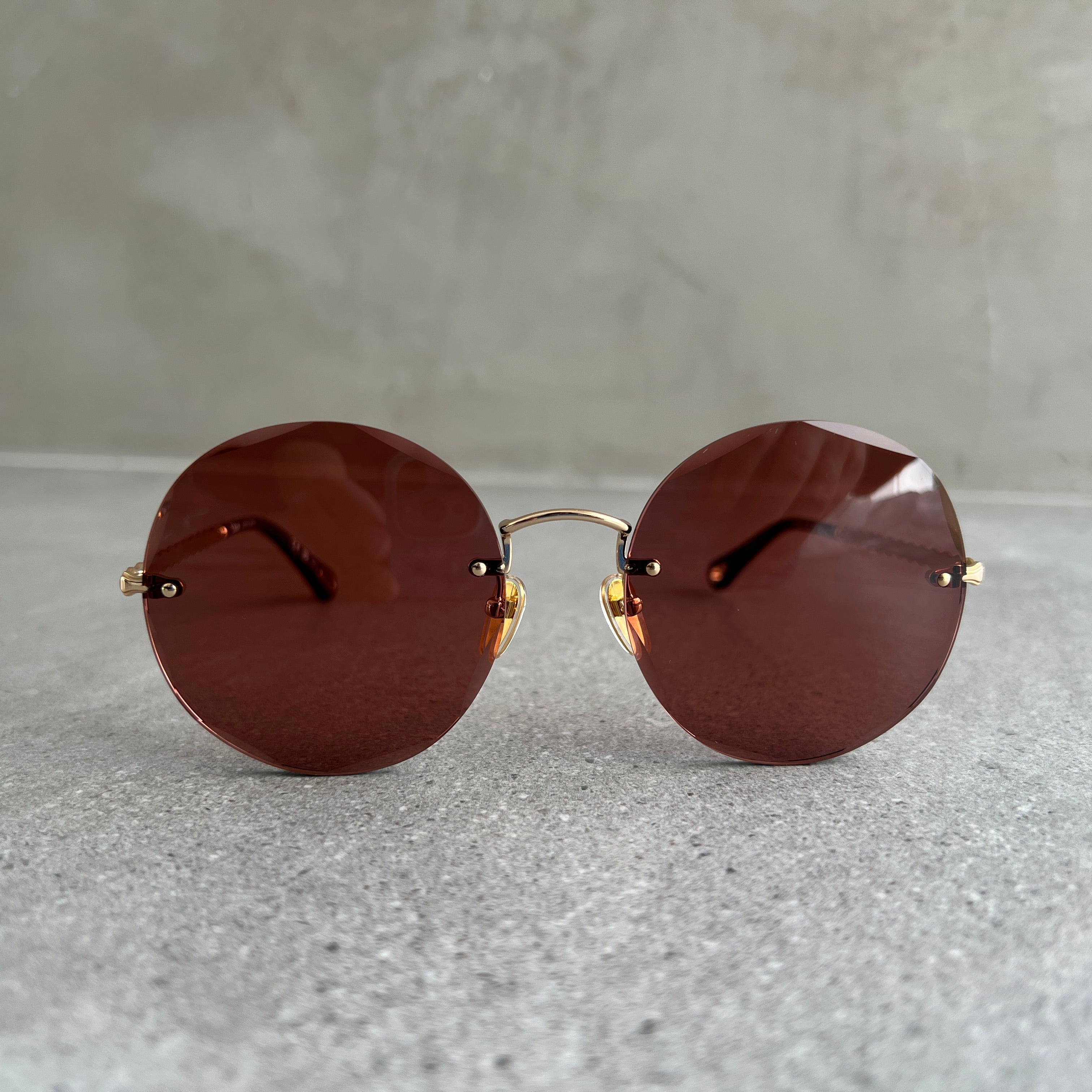 Round frameless sunglasses featuring dark pink bevelled edge lenses and gold scalloped arms.