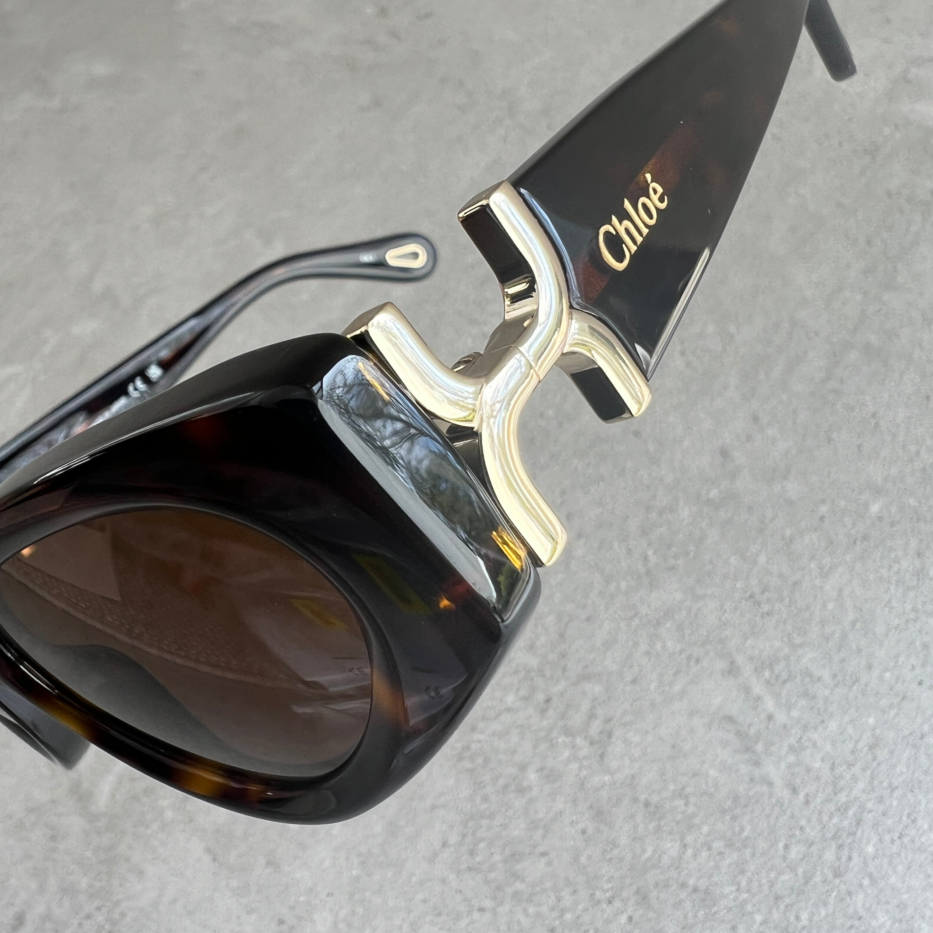 The glossy Dark Havana frame pairs with solid brown lenses in bio-based nylon for a timeless allure. The Chloé logo details the left temple while drop-shaped openings at the temple tips make these women's sunglasses compatible with Chloé's eyewear jewelry.