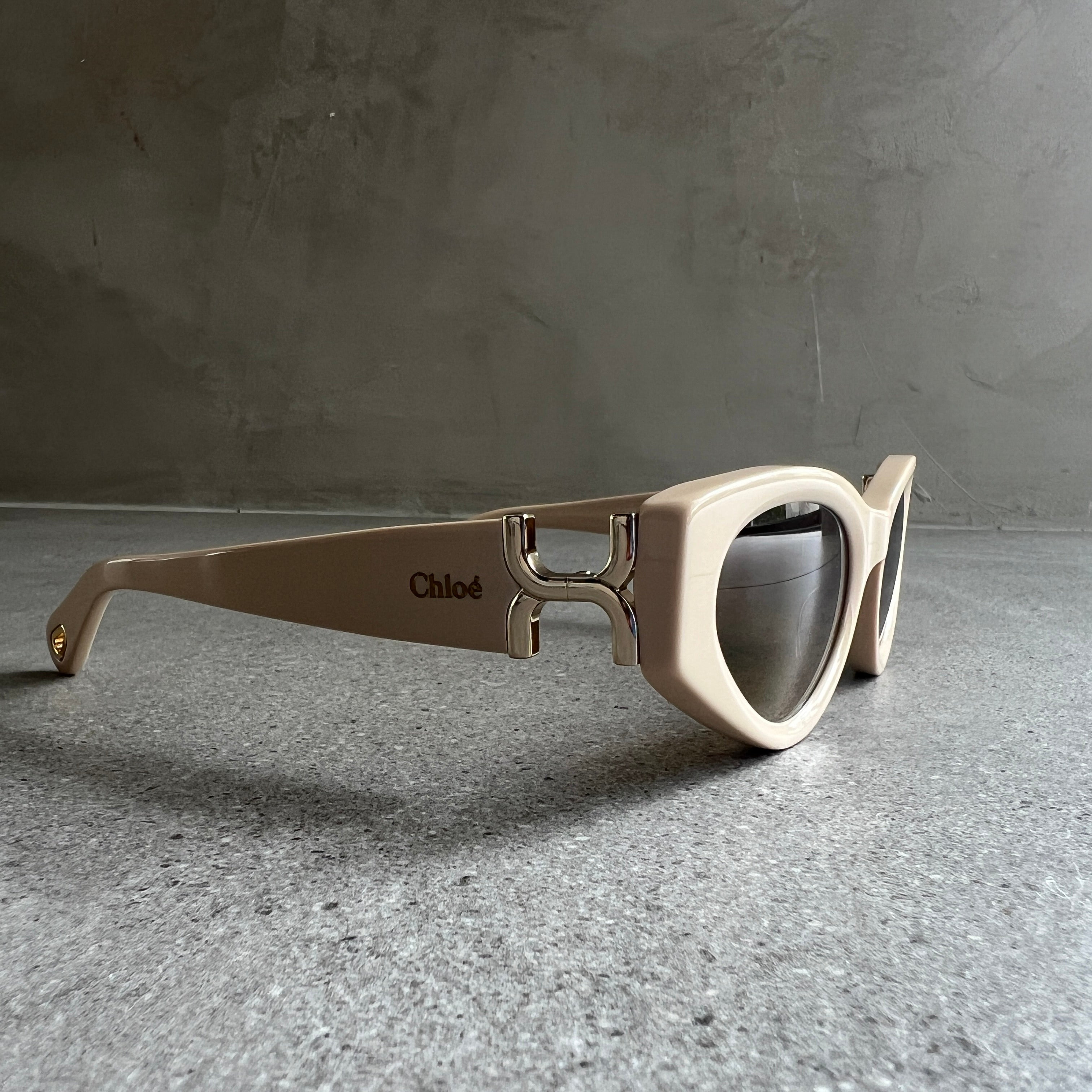 Cat Eye shape frame in acetate with Marcie gold metal logo as a functional hinge. Solid ivory colour inspired by Chloé SS24 RTW collection.