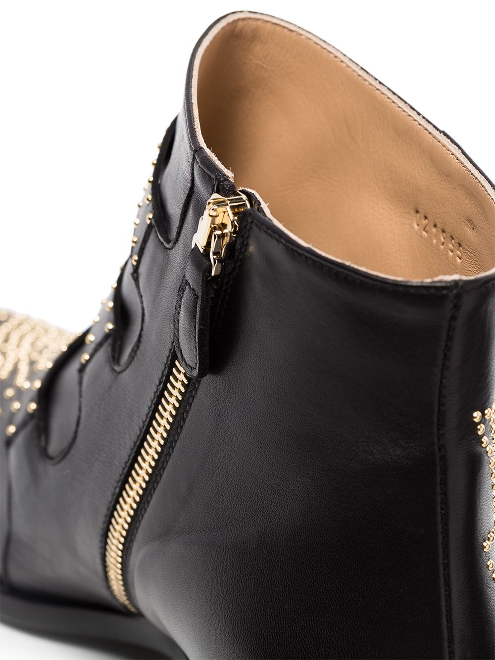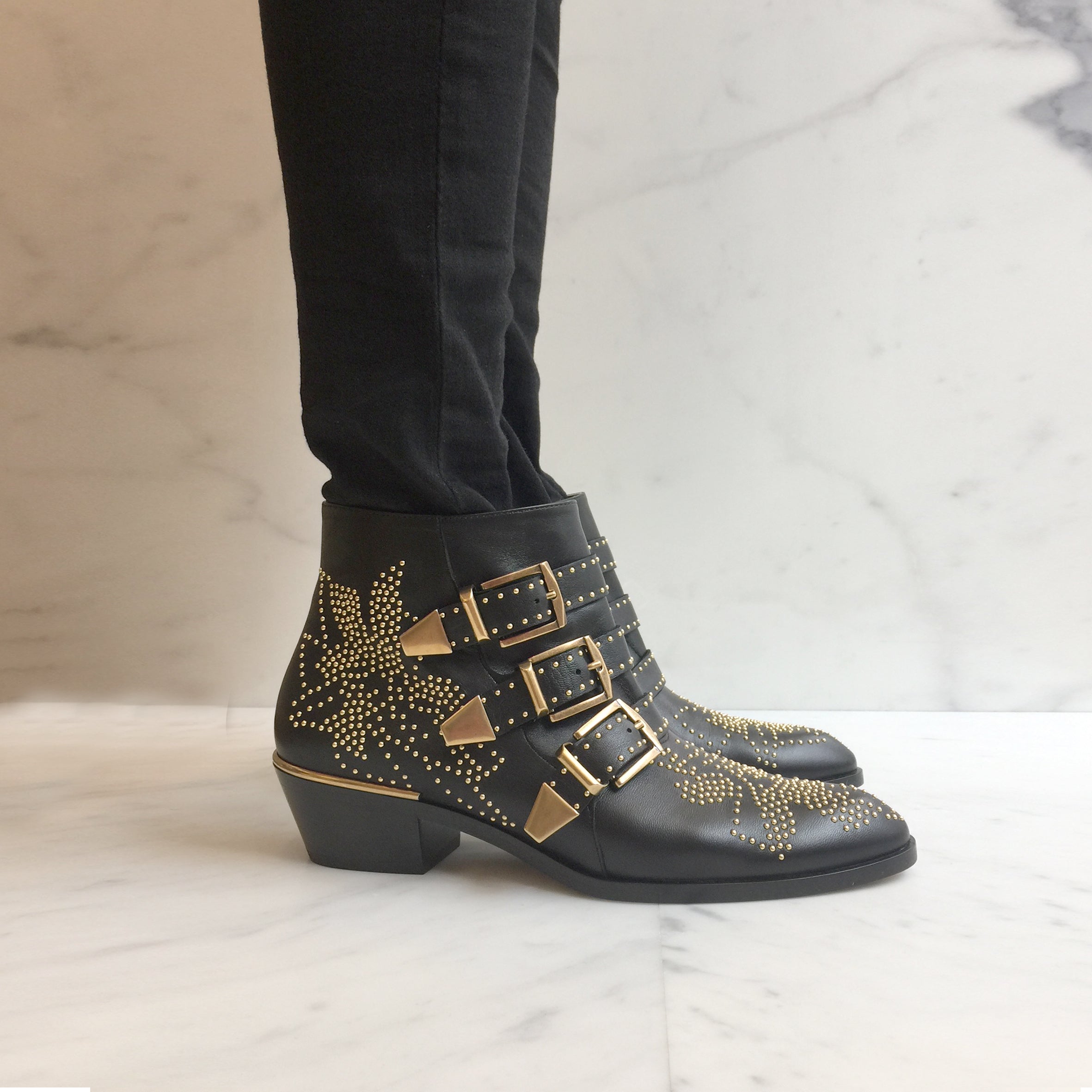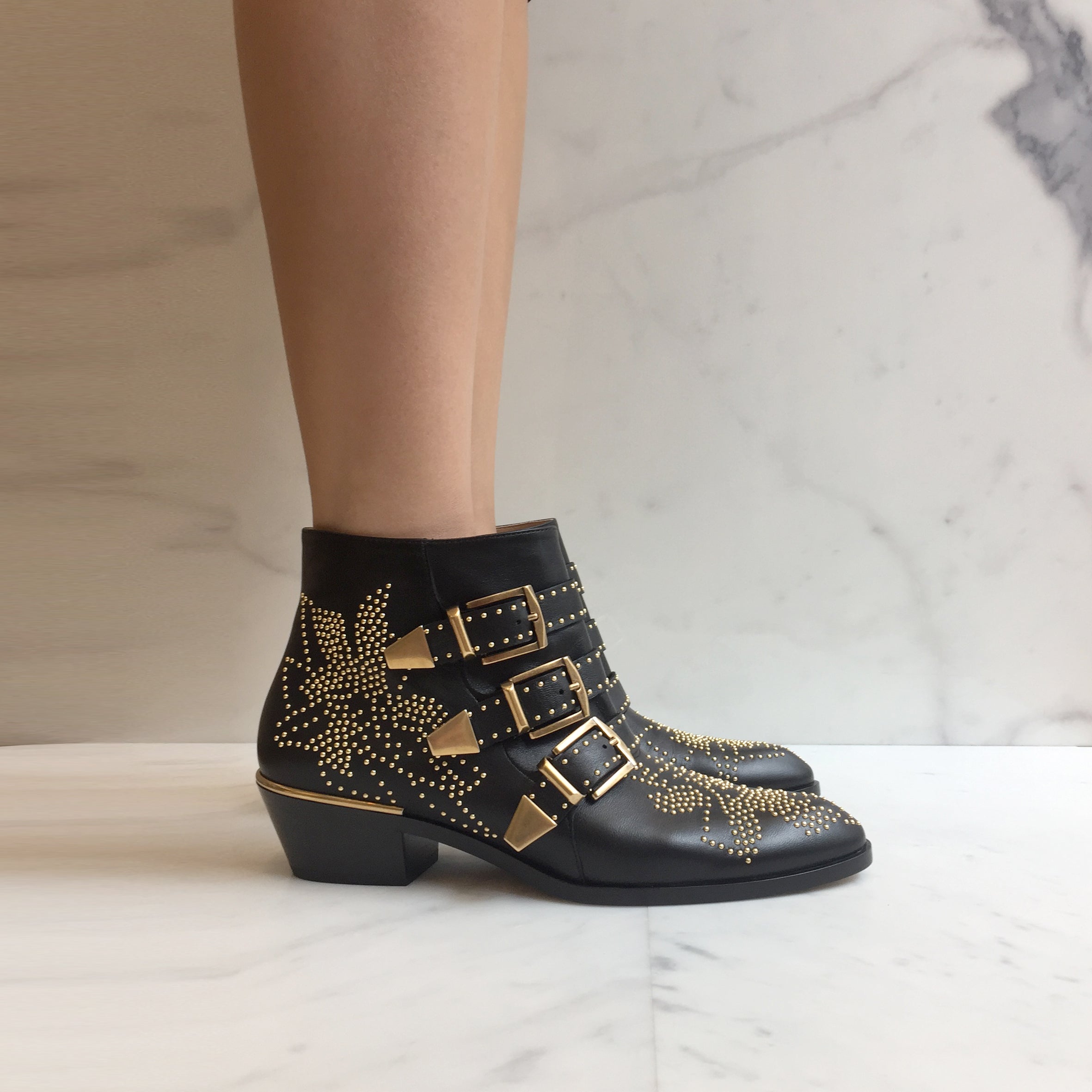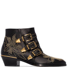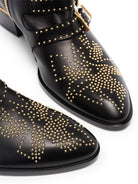 The statement Susanna Boots have a trio of buckled straps and elongated cowboy toe shape, and has a cool Western feel and sharp, yet feminine silhouette. Vintage metal pieces and golden studs in the Maison's own emblematic floral pattern pair with a strong Cuban heel and thick masculine sole. Zip on the side for easy wear.