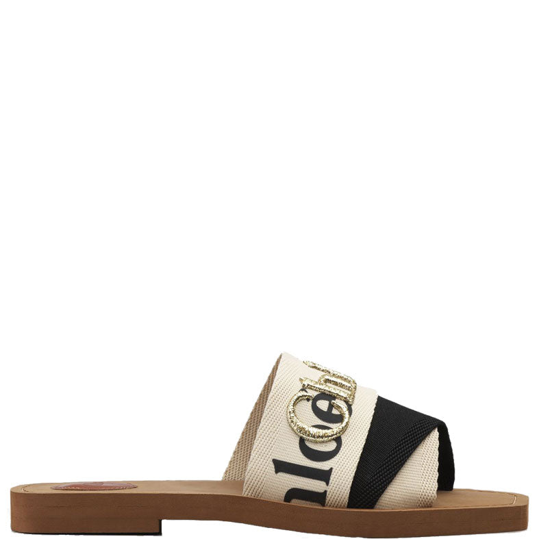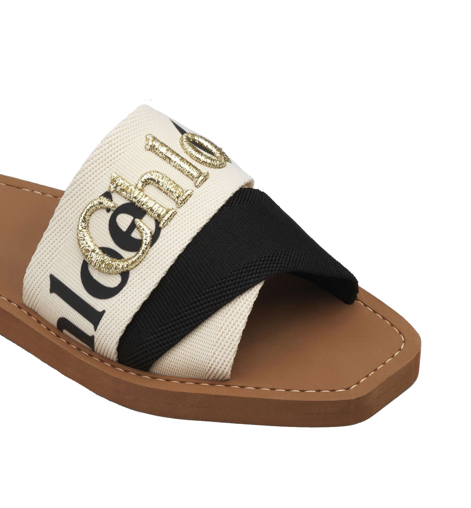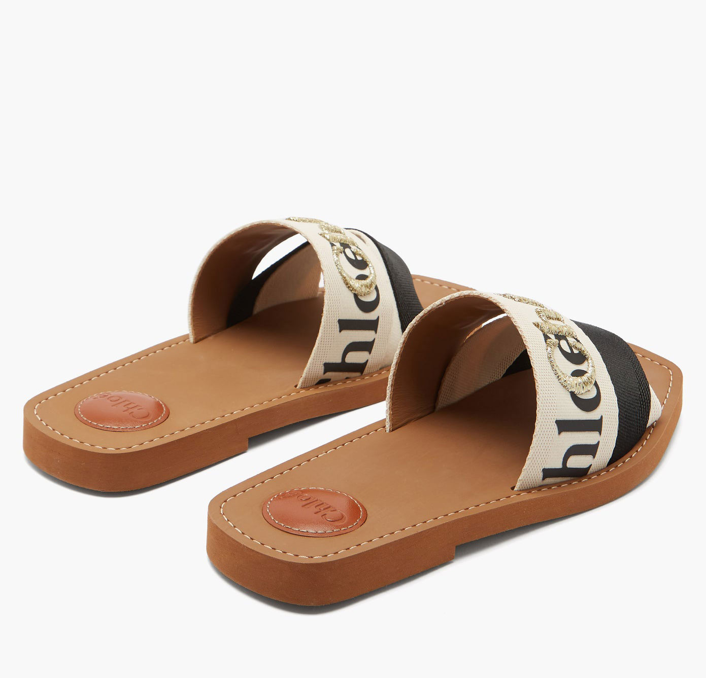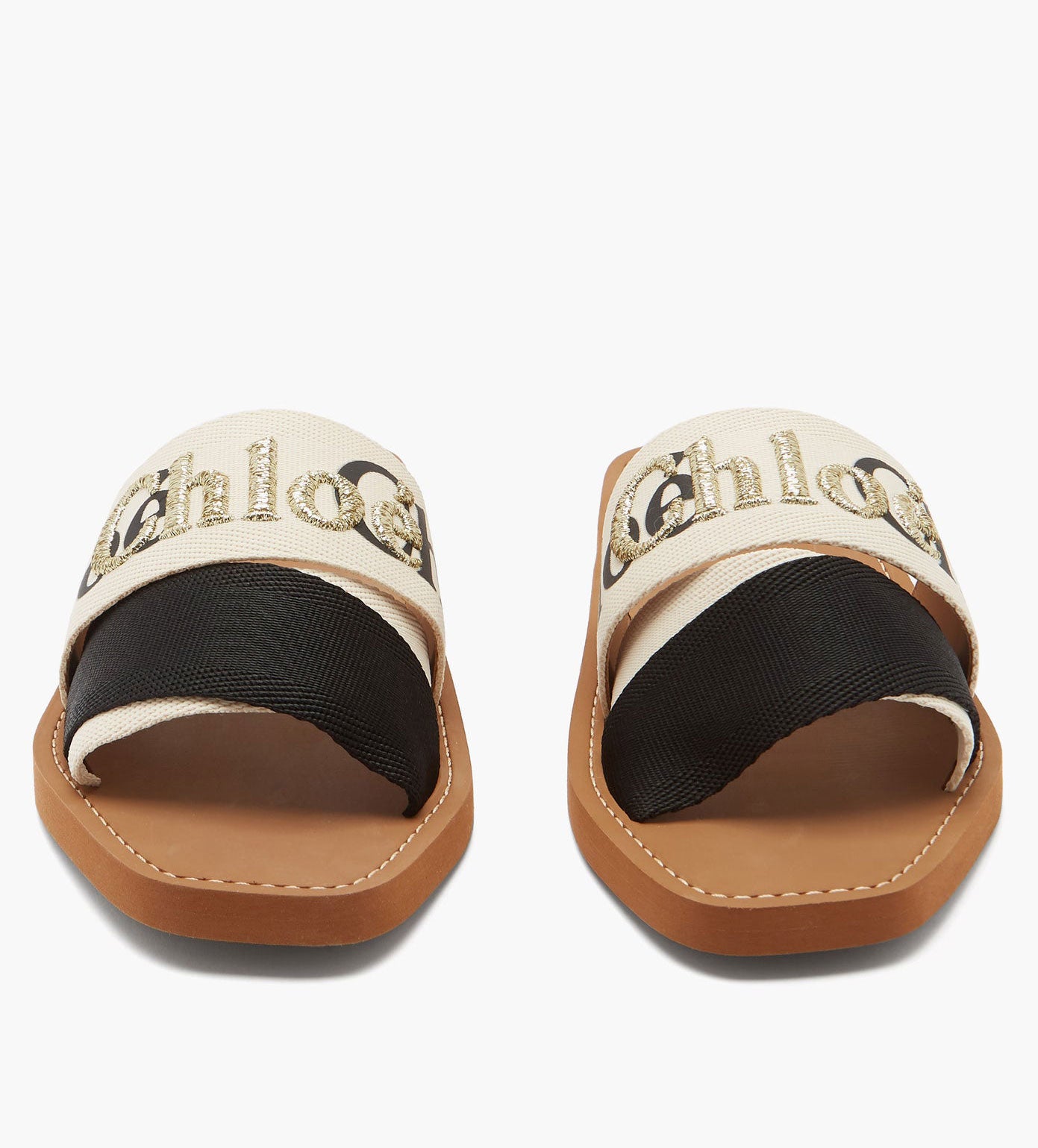 This Woody flat mule reveals an interplay of different-sized cotton canvas ribbons with the Chloé logo in striking contrast. Together, they form a large upper for a comfortable fit.