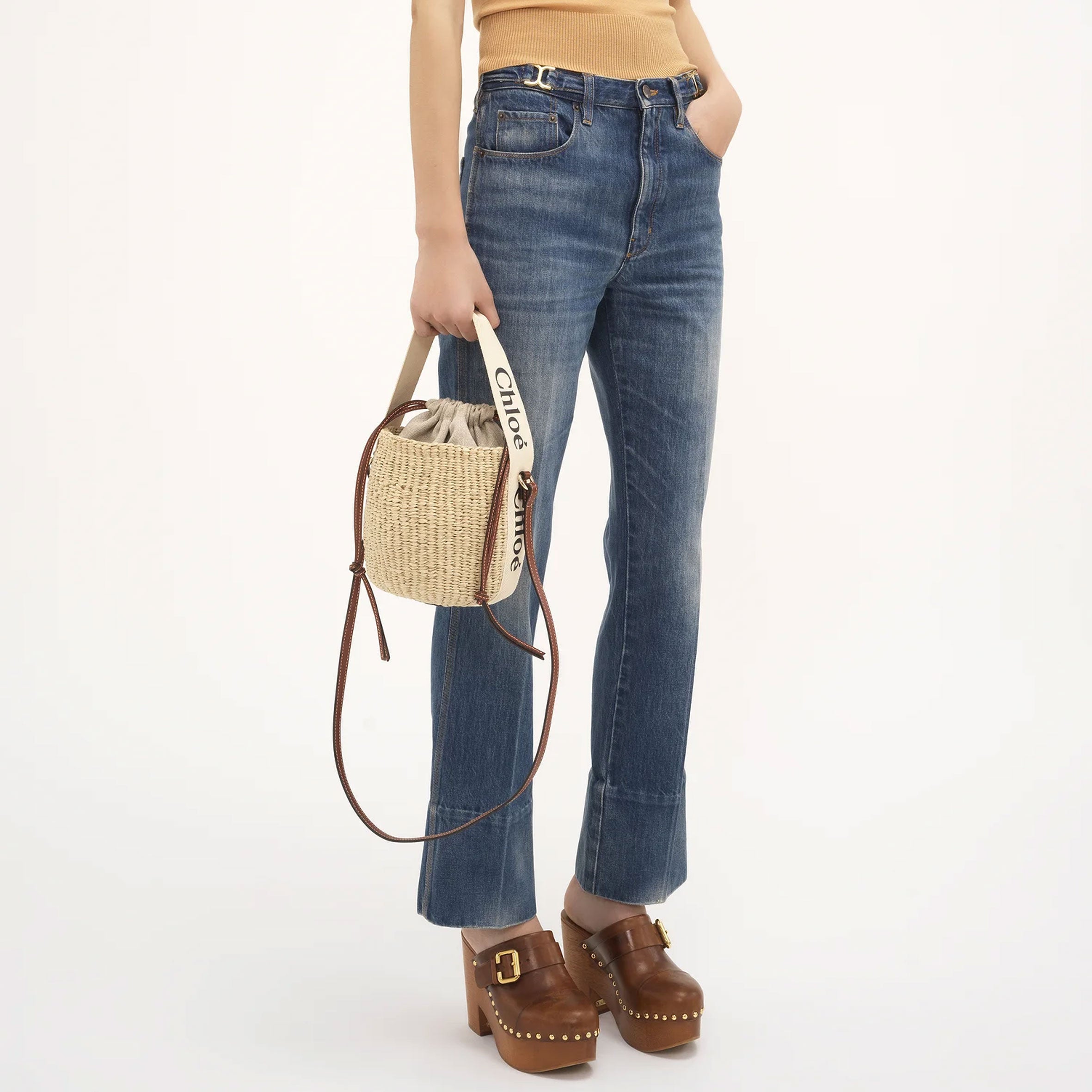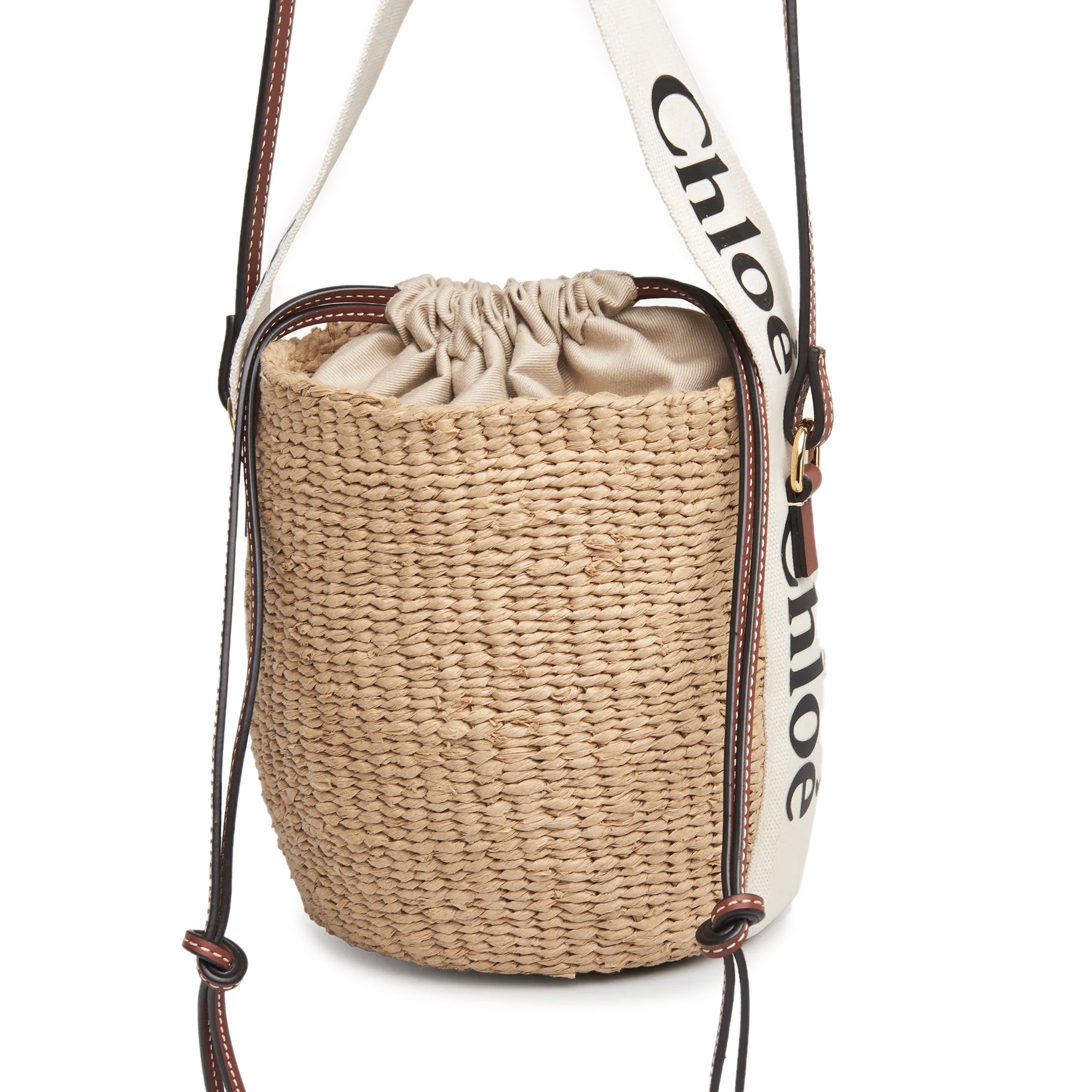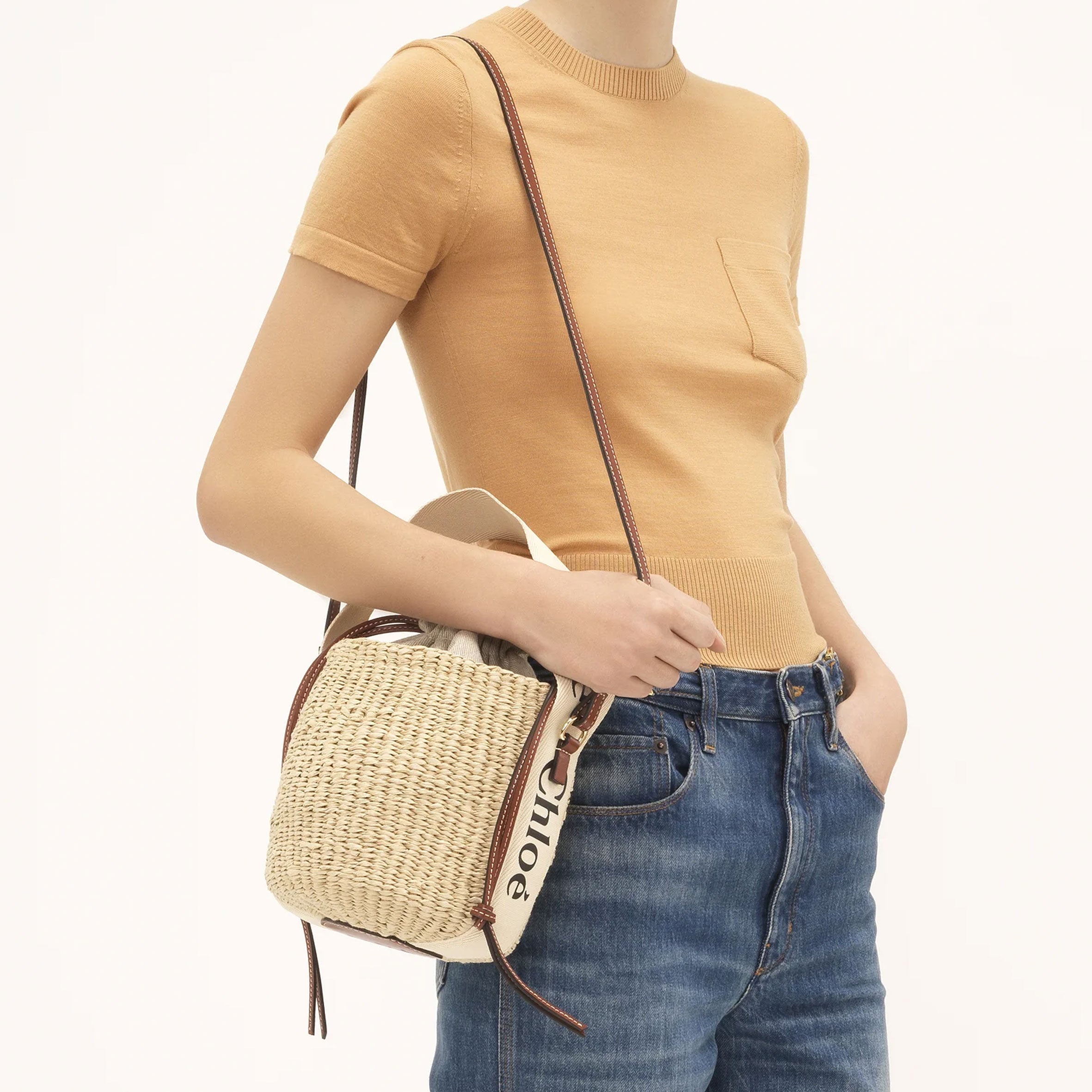 Crafted in a compact, round basket shape for an easy summer attitude, this small Woody basket is handwoven from partly upcycled materials by independent craftswomen in Kenya. The basket has a drawstring fastening and a long leather strap for shoulder and cross-body wear. Echoing the Maison's Woody mule, the line's signature Chloé logo ribbon details the natural fiber and creates a wide handle.