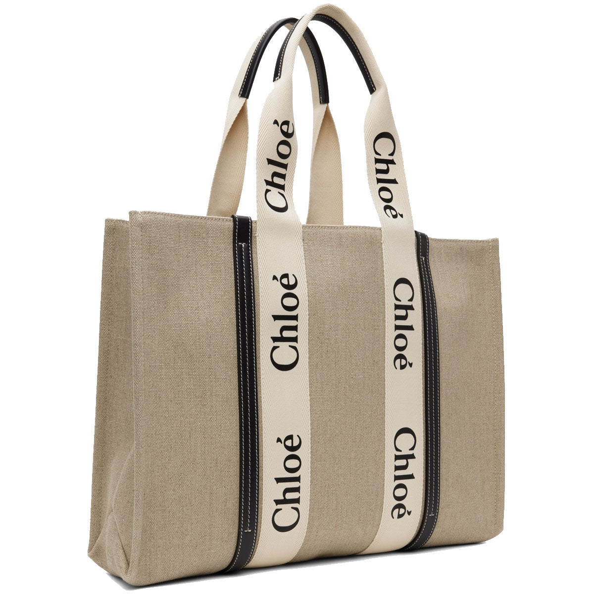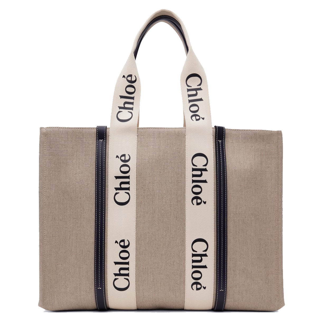 The bag's sharp, modern lines are emphasized by the contrasting vertical leather strips and the signature Chloé logo ribbon carried over from the Maison's Woody mule. Carry this tote bag comfortably on the shoulder