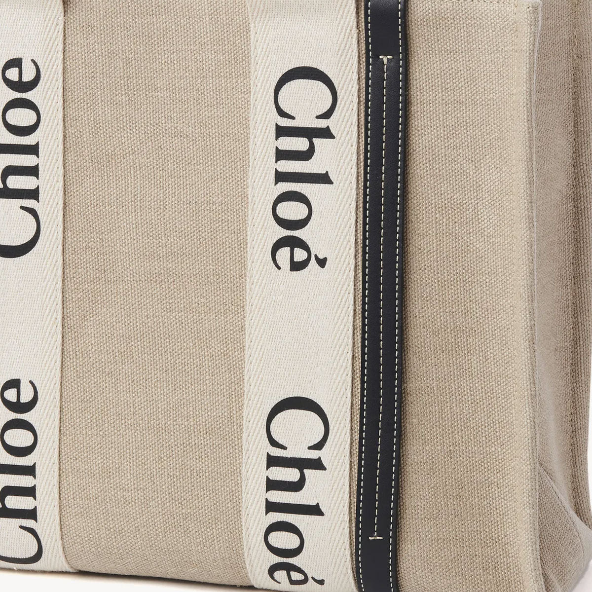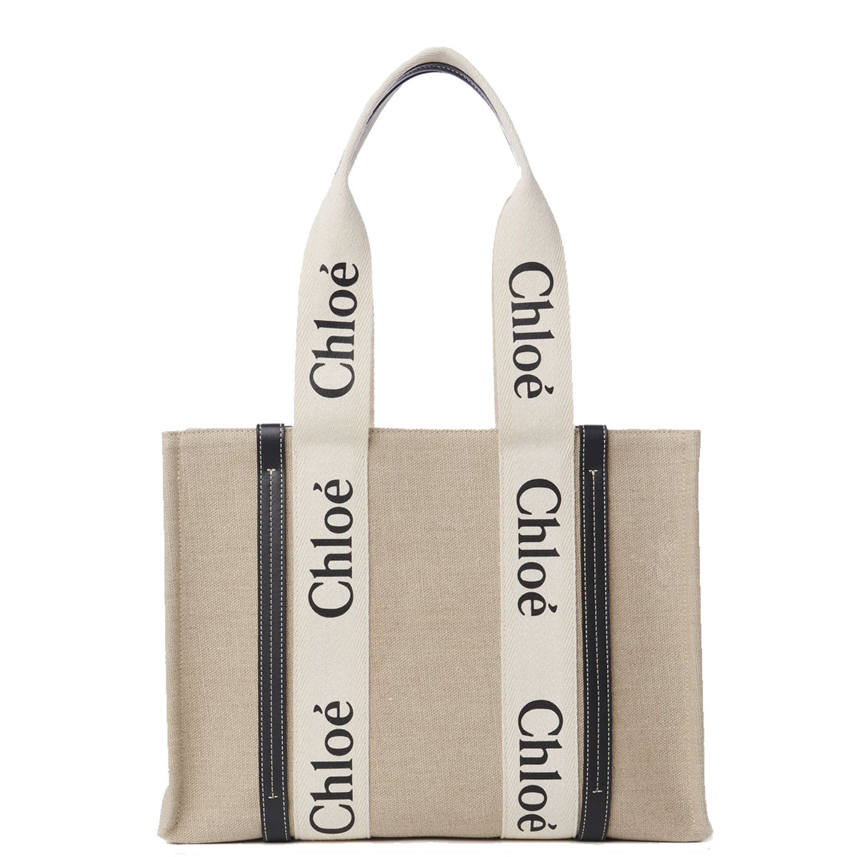 The bag's sharp, modern lines are emphasized by the contrasting vertical leather strips and the signature Chloé logo ribbon carried over from the Maison's Woody mule. Carry this tote bag comfortably on the shoulder. Can fit A4 format.