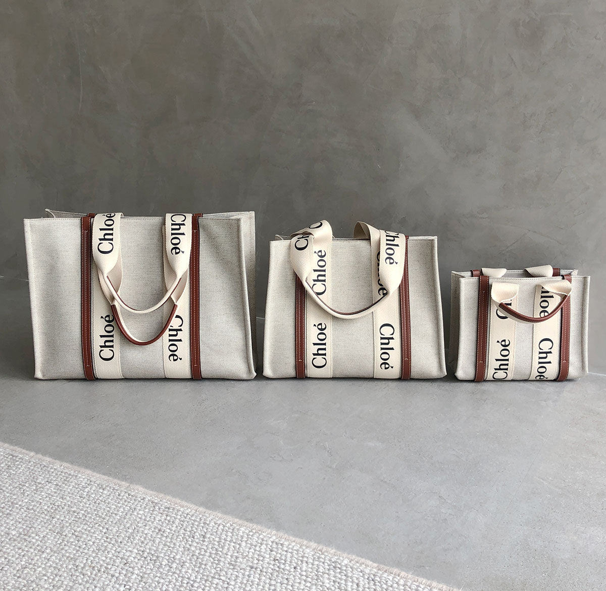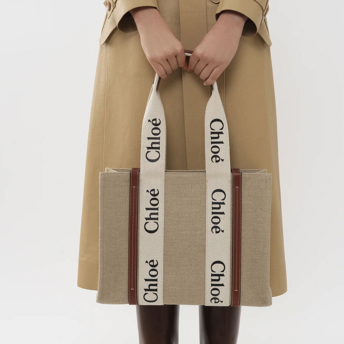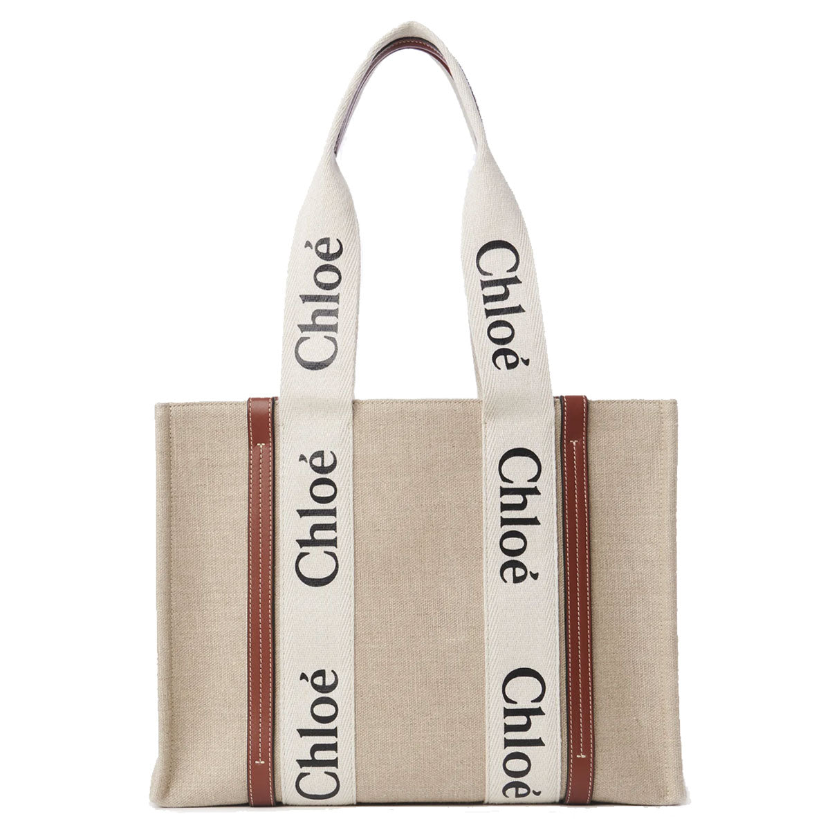 The bag's sharp, modern lines are emphasized by the contrasting vertical leather strips and the signature Chloé logo ribbon carried over from the Maison's Woody mule. Carry this tote bag comfortably on the shoulder. Can fit A4 format.