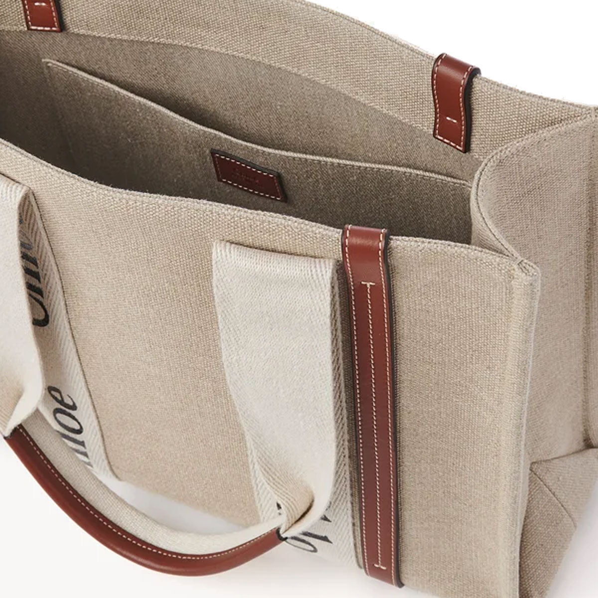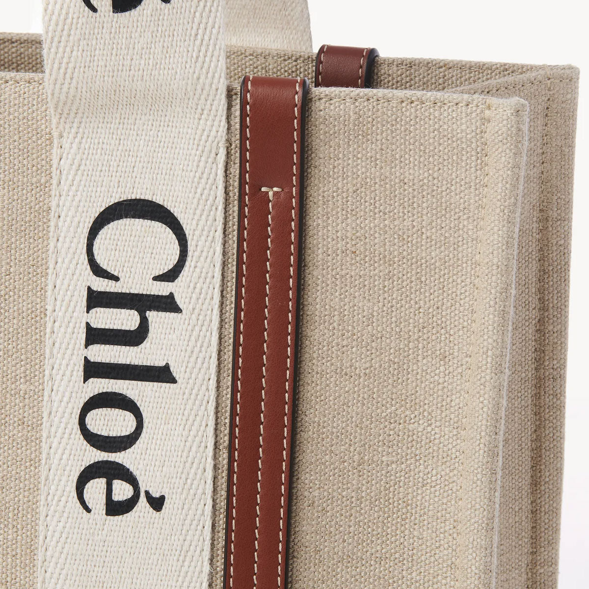 Crafted from linen canvas detailed with shiny calfskin strips, this medium Woody tote bag is a spacious day-to-evening bag with a strong summer attitude. The roomy inside compartment includes a practical flat pocket.