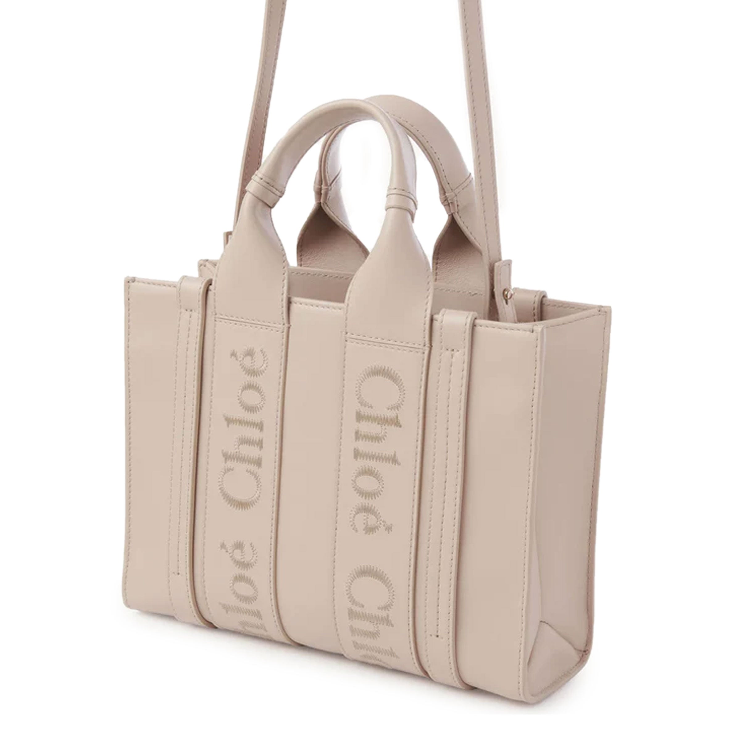 The Woody line is characterized by the signature Chloé logo carried over from the Maison's iconic mules. It showcases a modern, minimalist silhouette ranging from nano to large sizes.
