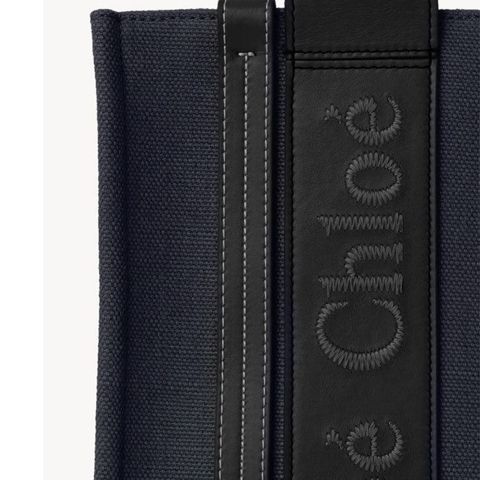 Crafted from linen canvas detailed with shiny calfskin strips, this mini Woody tote bag is a compact day to evening bag. The inside compartment fits a mobile phone.